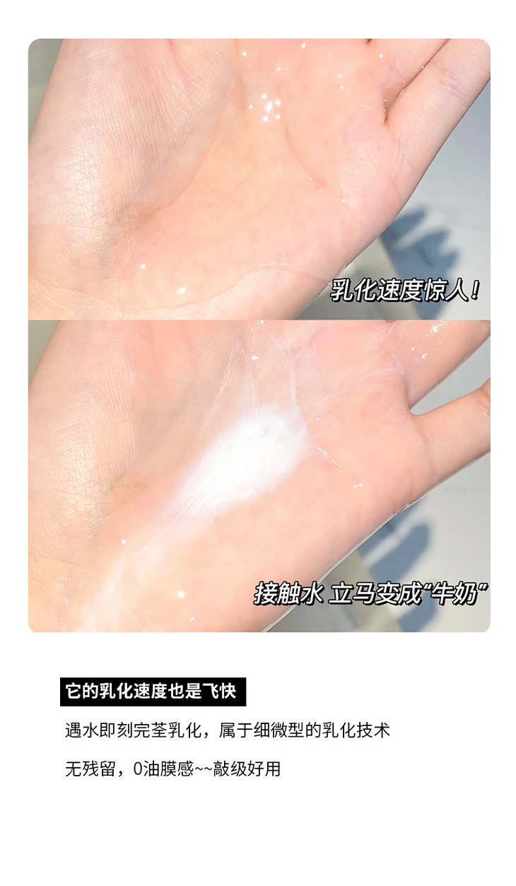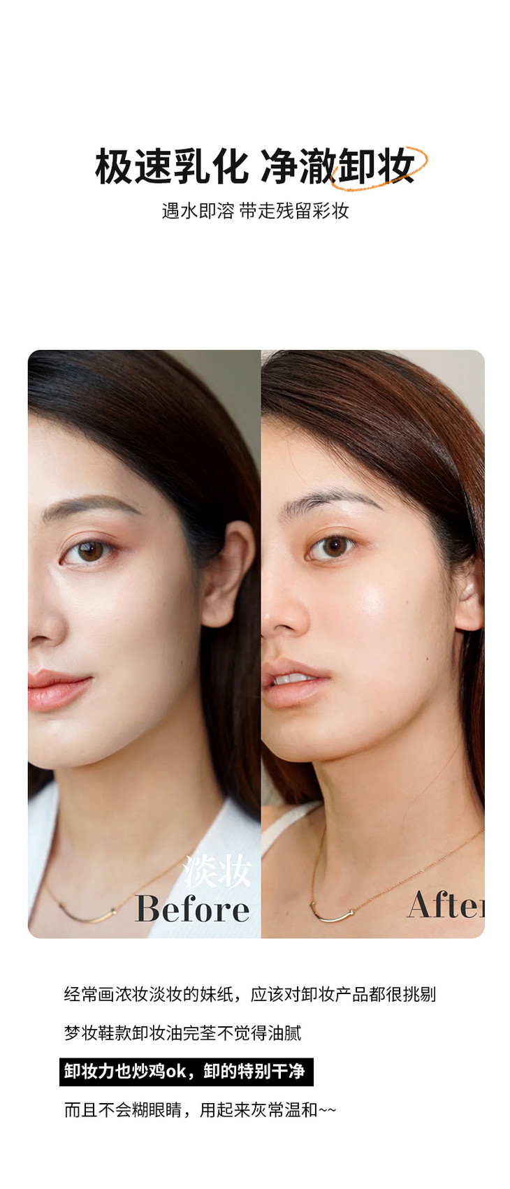 日本进口乳化剂,瞬息乳化,一步净卸,在卸妆过程中,如果卸妆油的乳化不够彻底,清洁效果将会大打折扣,从而导致闭口、痘痘等皮肤问题。梦妆水感卸妆油乳化速度快,即使遇冷水也能够即刻乳化,轻松卸除顽固彩妆。数据显示,使用该产品后即刻,黑头数量可减少13.5%,达到毛孔级净澈效果。