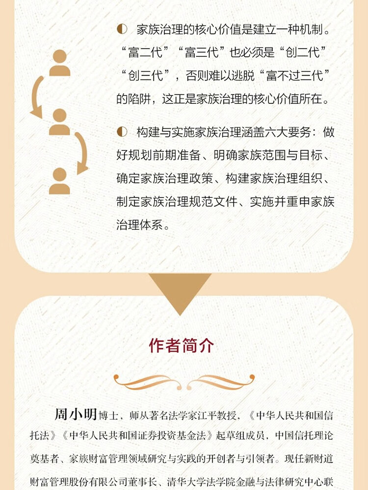 周小明博士,师从著名法学家江平教授,《中华人民共和国信托法》《中华人民共和国证券投资基金法》起草组成员,中国信托理论奠基者、家族财富管理领域研究与实践的开创者与引领者。现任新财道财富管理股份有限公司董事长、清华大学法学院金融与法律研究中心联席主任、中国信托业协会专家理事。独著和统领专业团队著有《信托制度比较法研究》《信托制度:法理与实务》《家族财富管理之道》《财富管理视角下的家族信托规划》等,*家族财富管理系统规划方法,是集理论视野、学术素养与实践经验于一身的信托与财富管理领域权威专家,在学界与业界具有广泛的影响力。