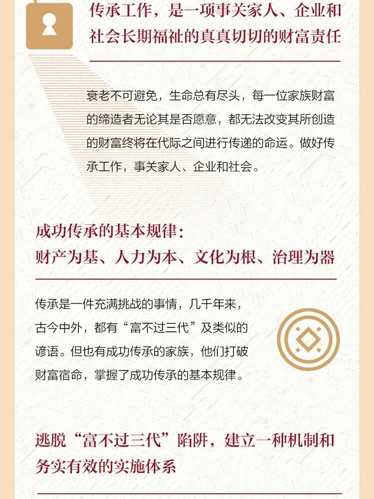 传承是一件充满挑战的事情,几千年来,古今中外,都有“富不过三代”及类似的谚语。但也有成功传承的家族,他们打破财富宿命,秉持财产为基、人力为本、文化为根、治理为器四个基本的传承理念,并运用于传承的实践之中。这些,就是成功传承的基本规律。
