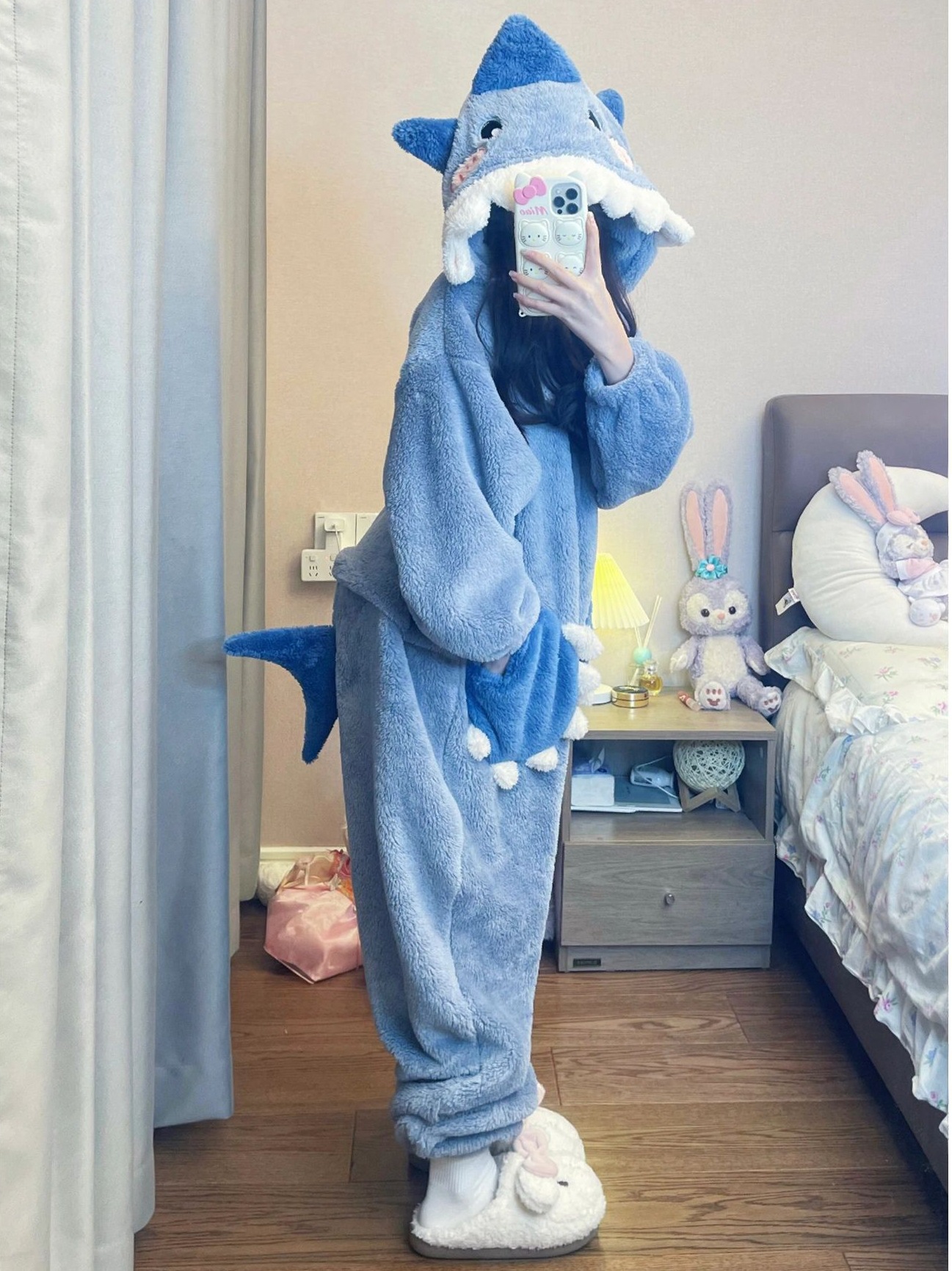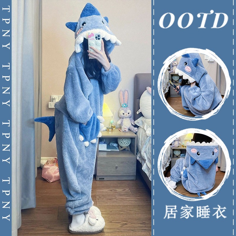 超厚小丑鱼鲨鱼珊瑚绒长袖连帽睡衣女2024年冬季新款家居服连体衣