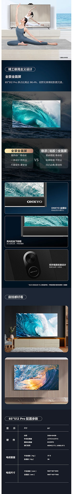 TCL电视 85S12 Pro 85吋 巨幕高色域电视 120Hz MEMC防抖 安桥音响 4K超清超薄全面屏