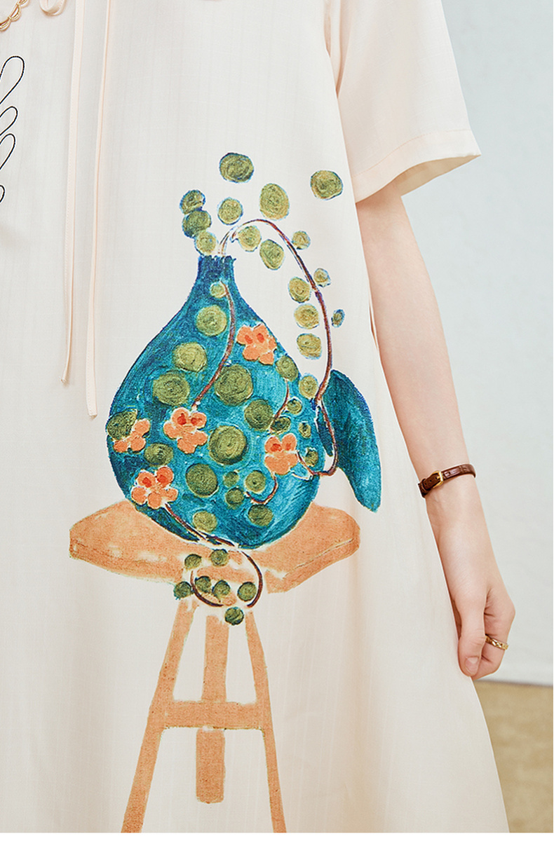 两三事 柔光漫记 2025夏季新款复古印花绑带翻领a字连衣裙