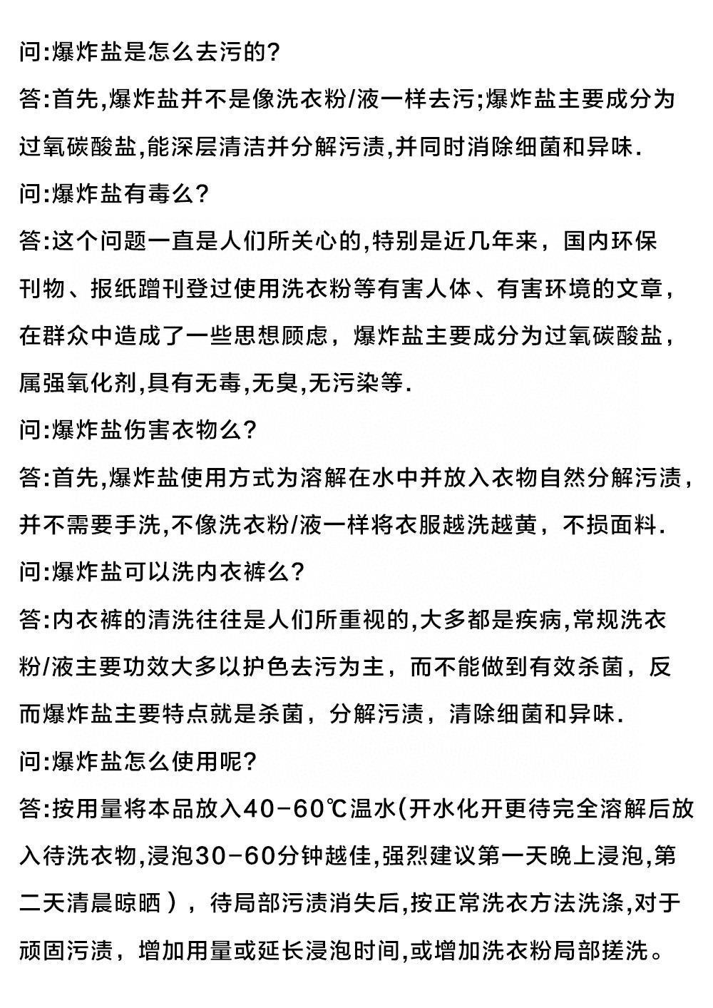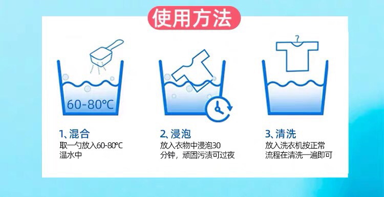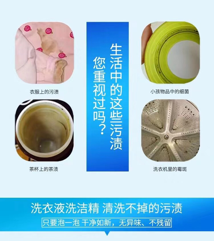 生活中,我们经常会不小心被污渍弄脏衣服,或者衣服穿久发黄不好清洗怎 么办?家里熊孩子多,汗渍污渍不易清洗怎么办?去污斗士,主缇爆炸盐, 给你看得见的效果,各种难洗污渍,泡一泡就差不多能洗干净!针对衣服发黄,衣服霉 斑,果汁酱,床单顽固污渍,油烟物质,都能轻松应对