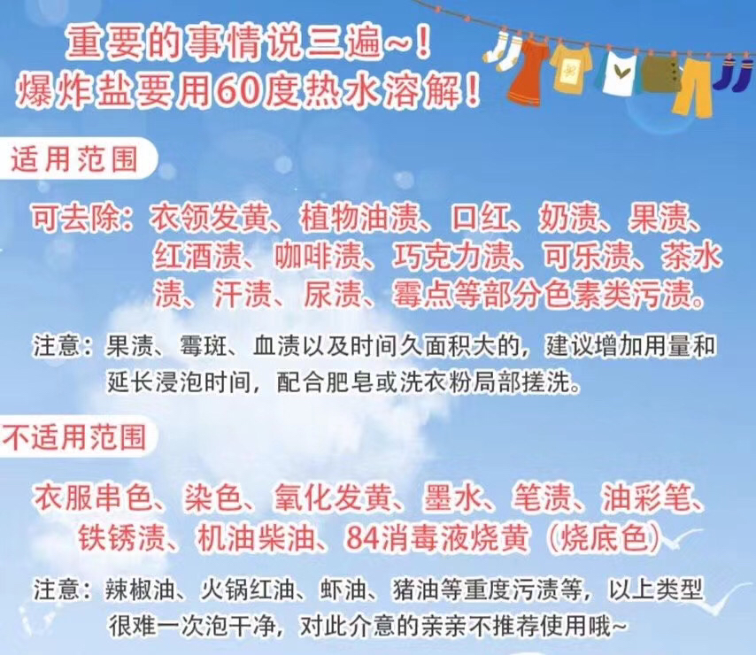 主缇爆炸盐使用范围:可去除衣物久放发黄、果渍、茶渍、咖啡渍、红酒渍 、汗渍、奶渍、巧克力渍、尿渍等色素类污渍。