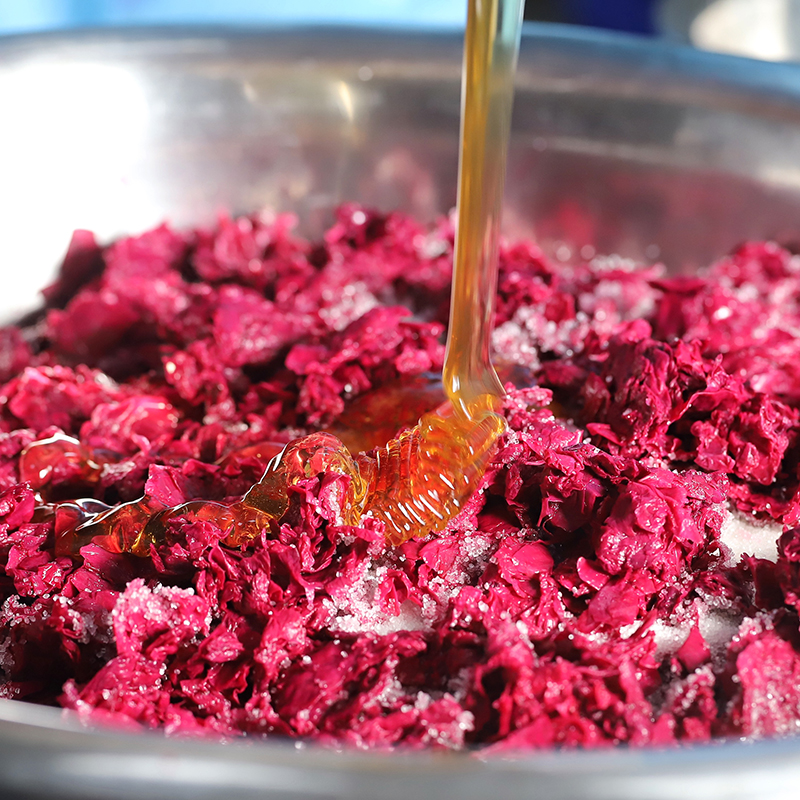 2、花瓣中倒入有机白糖、蜂蜜、柠檬汁,混合后进行揉搓、搅拌