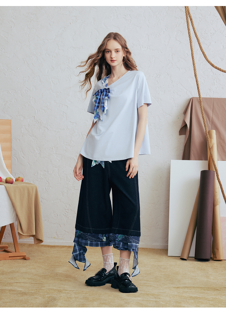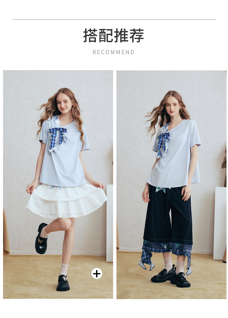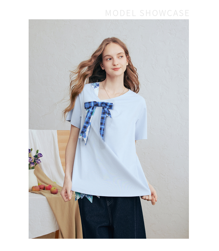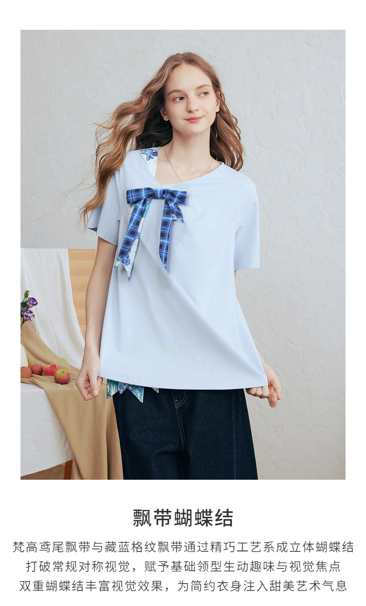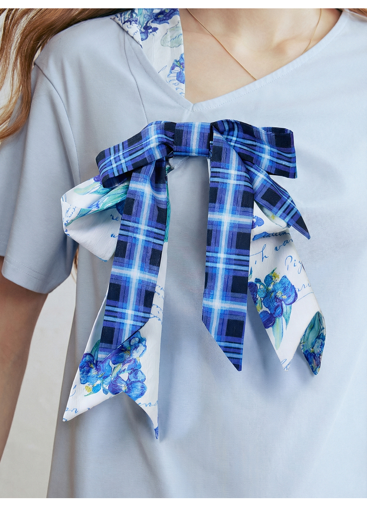 两三事梵高文艺 碧落晴空 2026春新款格子印花蝴蝶结v领短袖t恤女