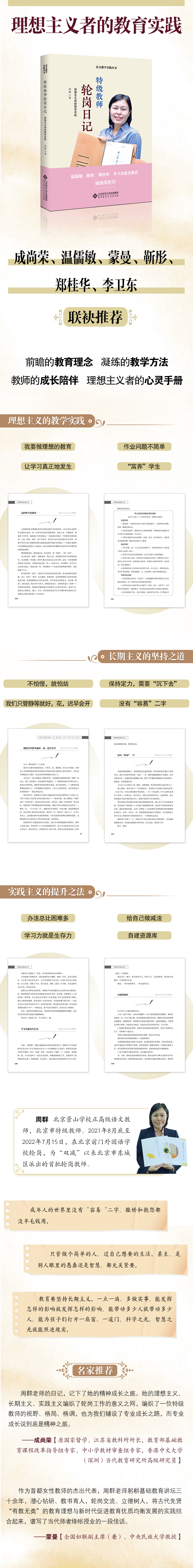 周群在为期一年的轮岗期间,共写下 24 万字的轮岗日记。2021 年 9 月 10日,北京市委领导到前门外国语学校看望轮岗教师;中央电视台等多家媒体对周群老师的轮岗工作做了报道,产生了良好和广泛的社会影响。她的轮岗日记在干部教师中也产生极大影响。<br>作为北京市特级教师和正高级教师,周群对教育教学的思考具有鲜明的时代特色。轮岗日记内容丰富,既包括对轮岗工作开展与推进工作的记录,也包括她对“双减”政策、语文新课改等的深度思考,还包括她通过日常教学开展的教改实践。从 2021 年 9 月直到 2022 年 7 月中旬轮岗结束,轮岗日记基本上每天一篇,图文并茂。