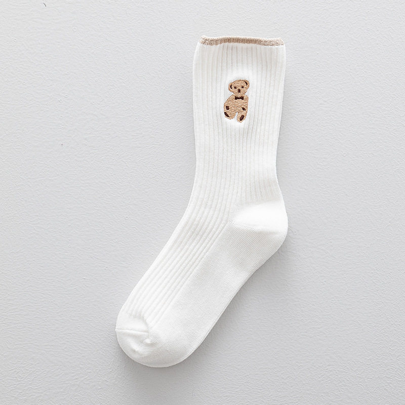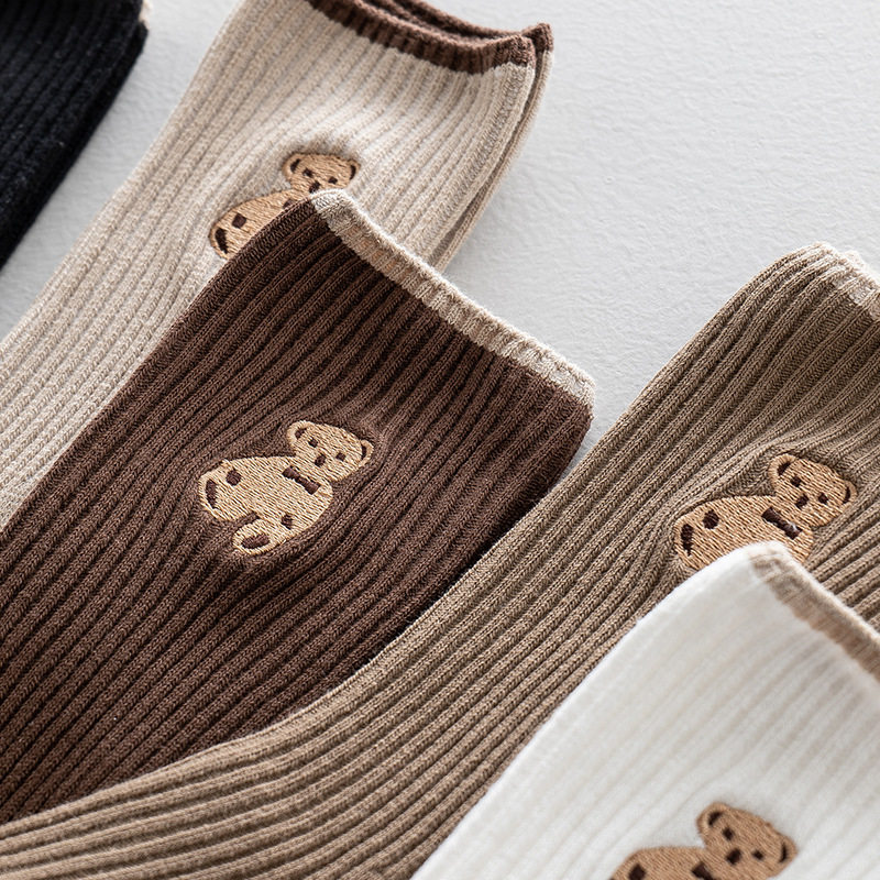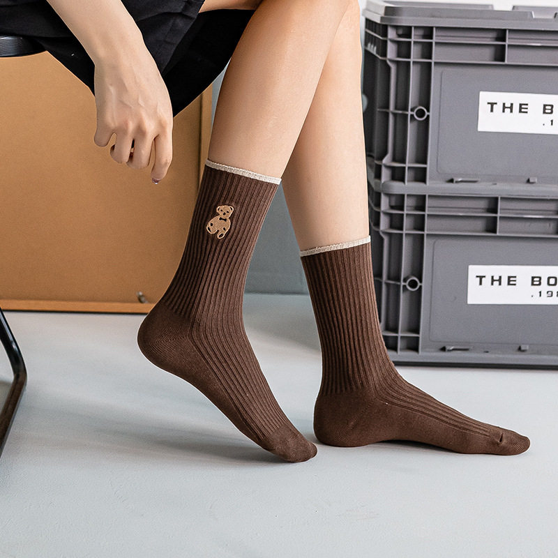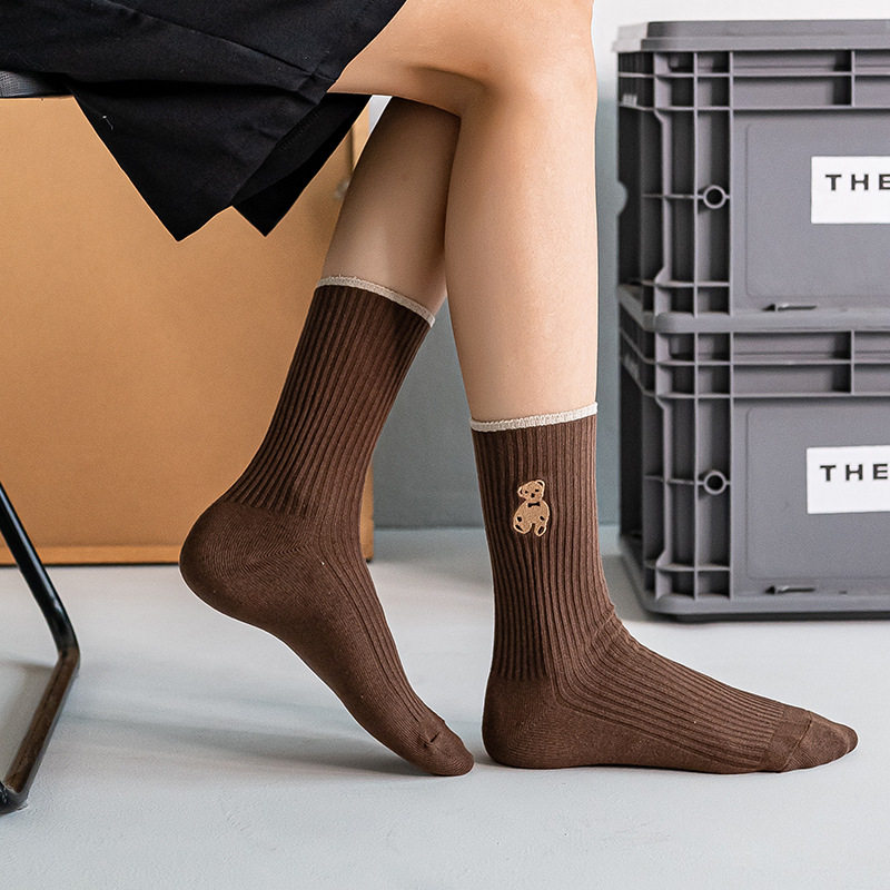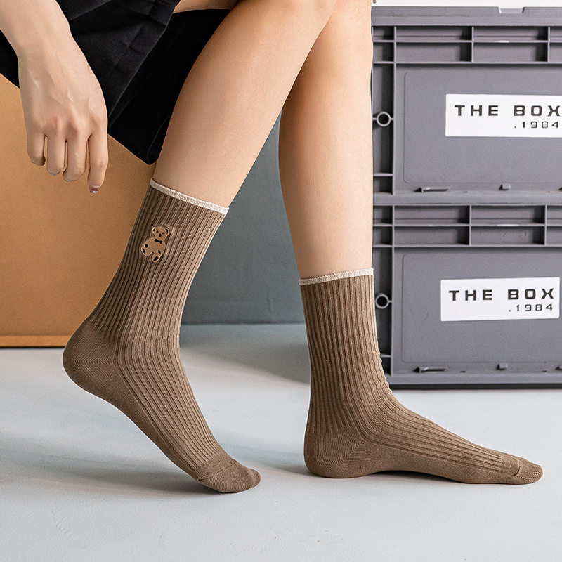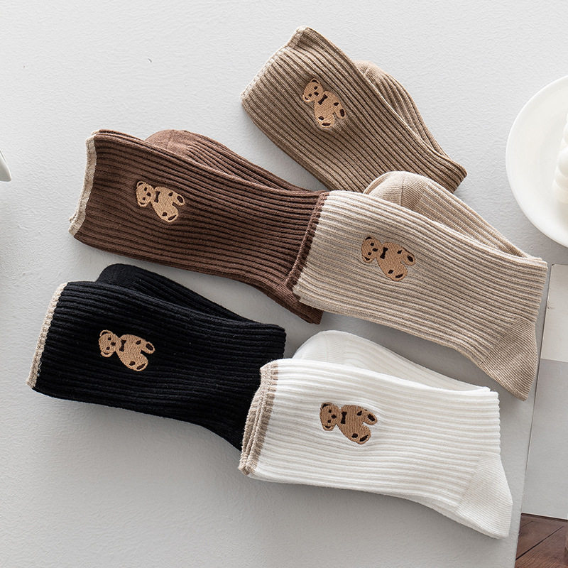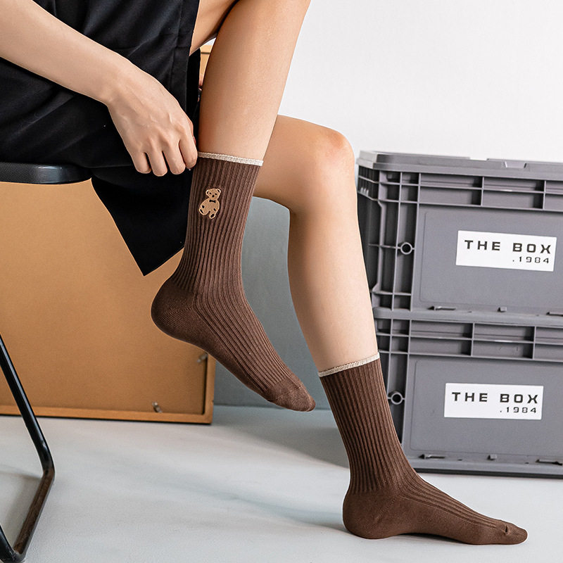 高端刺绣小熊棉袜,刺绣工艺无论从美观还是品质感都要高于印花,成本高。