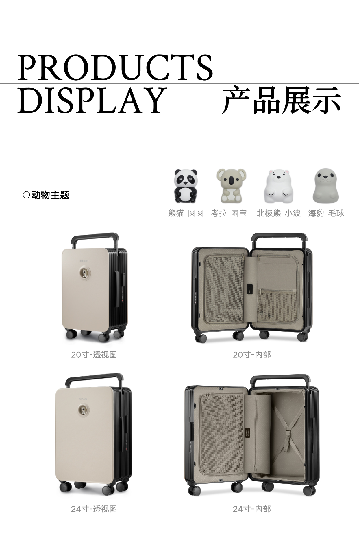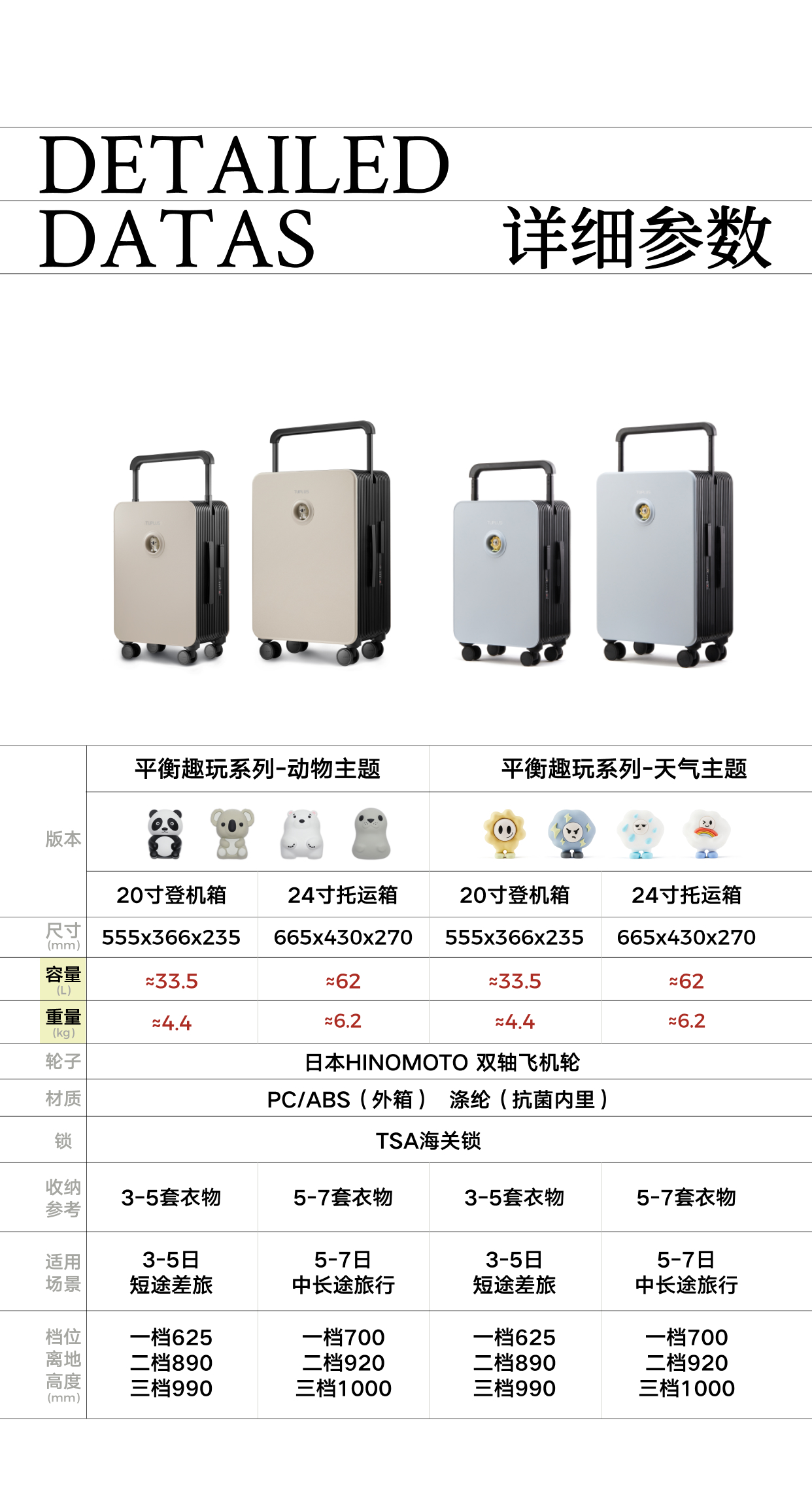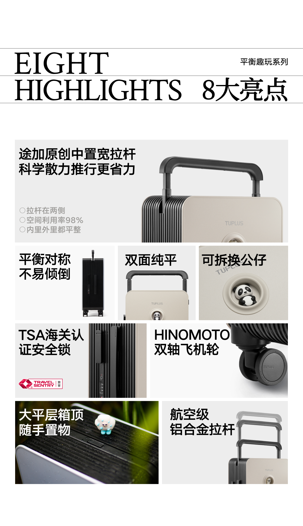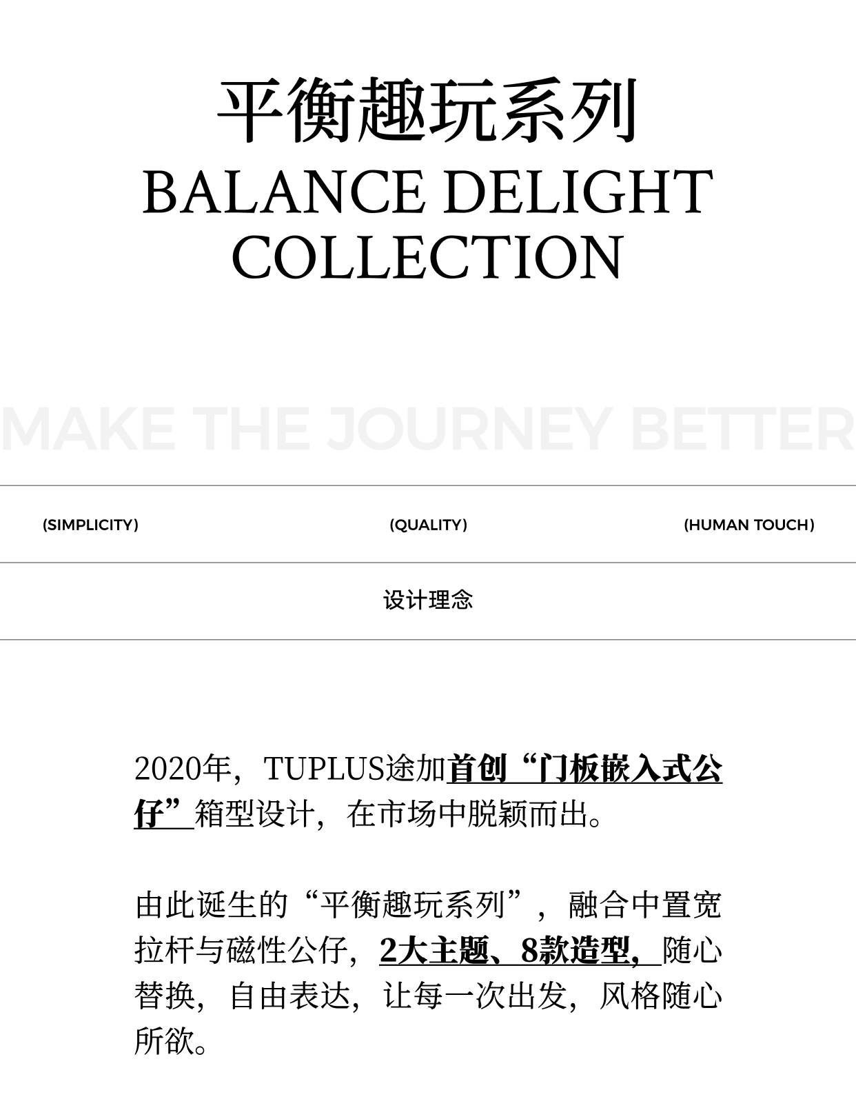 【出行好物丨途加 平衡趣玩系列20/24寸中置宽拉杆行李箱】 选用PC/ABS材料,打造硬核箱体,平衡对称不易倾倒, 嵌入式公仔设计,箱体两面可拆换任意组合,中置宽拉杆设计,科学散力推行更省力