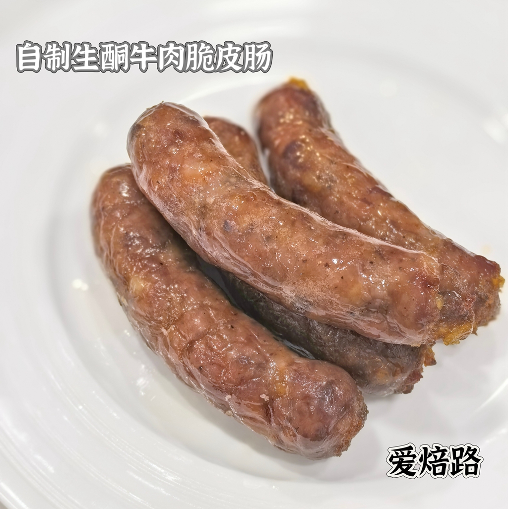 配料表:新鲜牛肉70%,新鲜猪肉30%,纯牛奶,白胡椒粉,黑胡椒,赤藓糖醇,蒜酥,生抽,蚝油,天然羊肠衣,低钠盐,红曲粉,五香粉