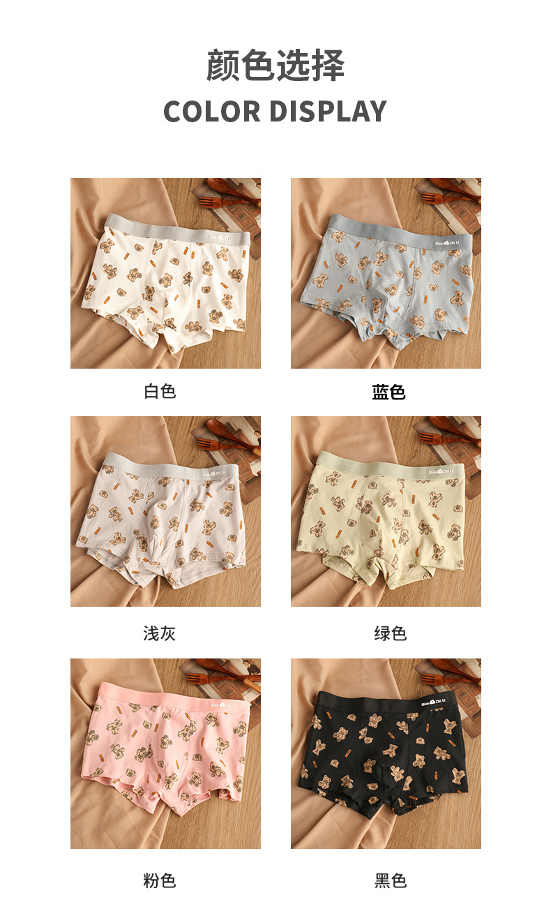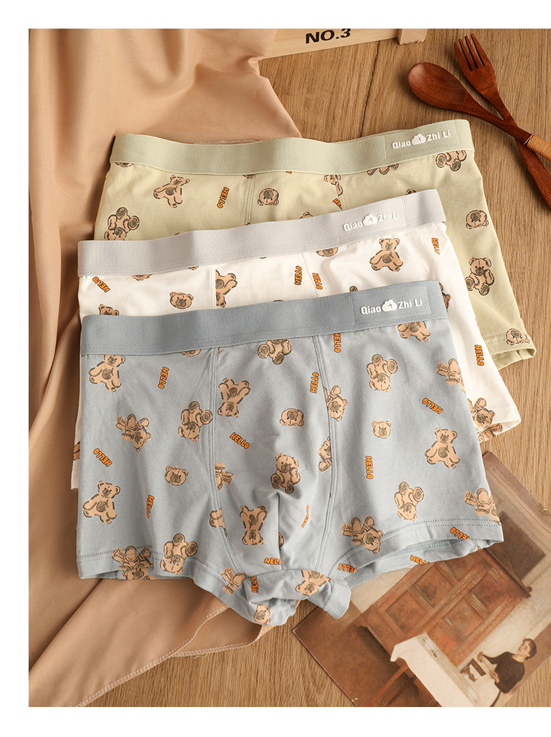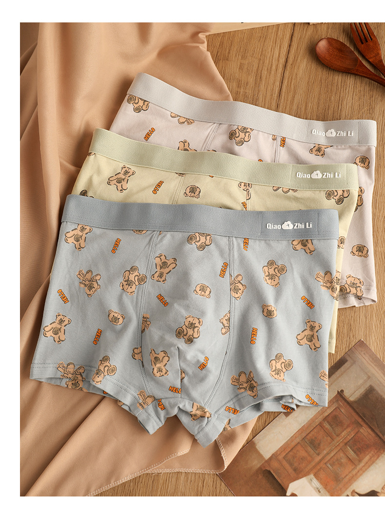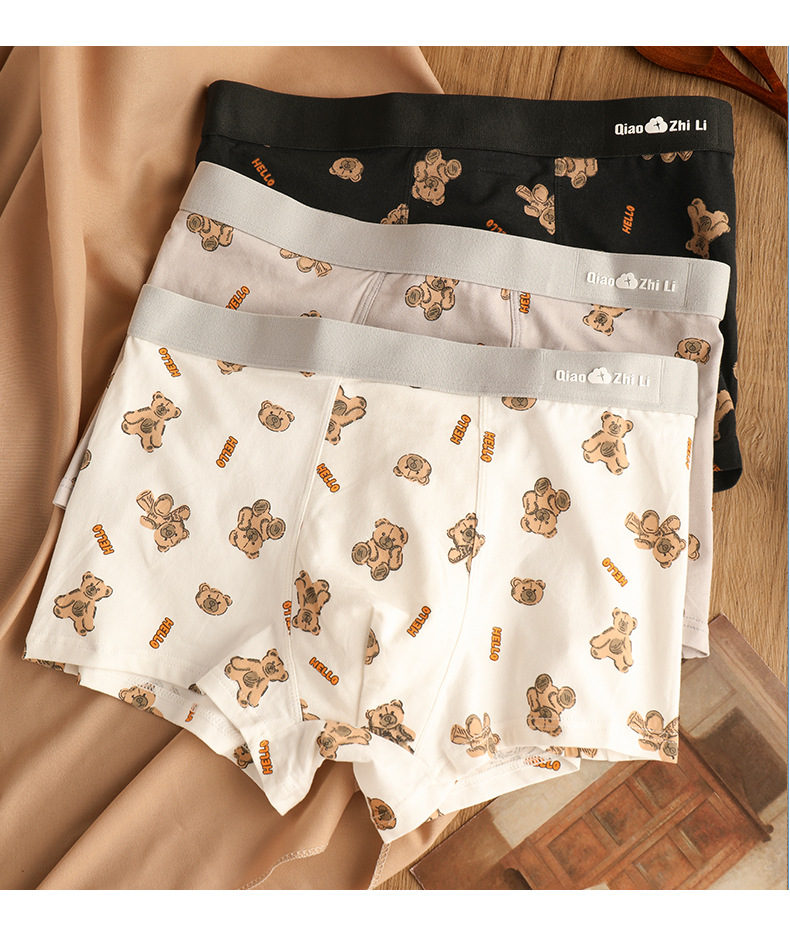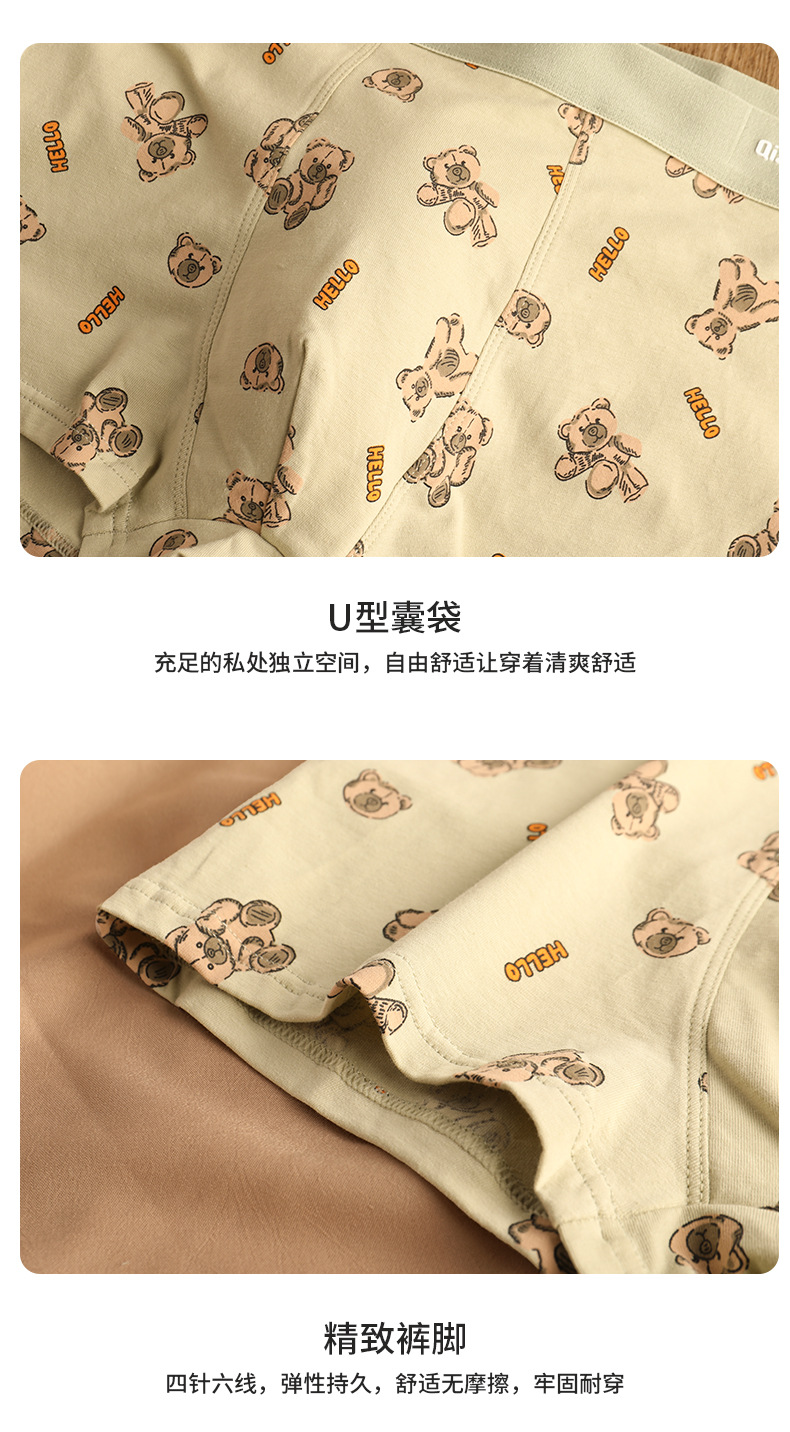 猛男粉 纯棉男士内裤男平角裤 可爱卡通小熊 透气中腰青年男生四角裤头裤衩