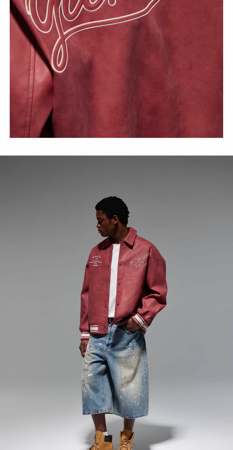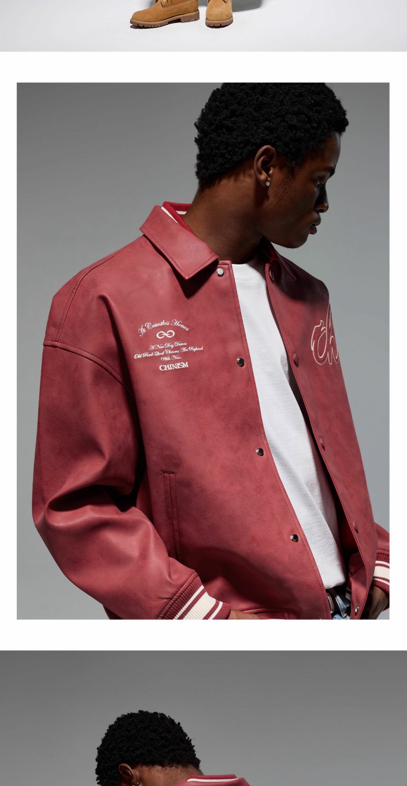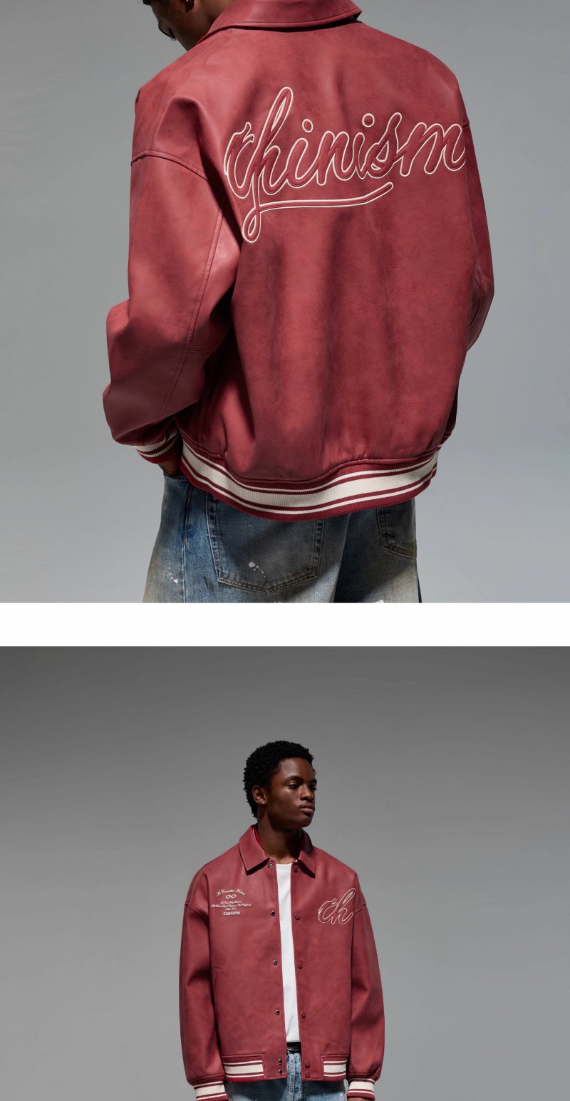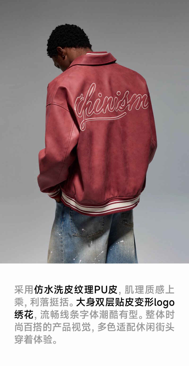 CHINISM赤尘 岩纹翻领pu皮夹克男春秋美式皮衣男士棒球服红色外套