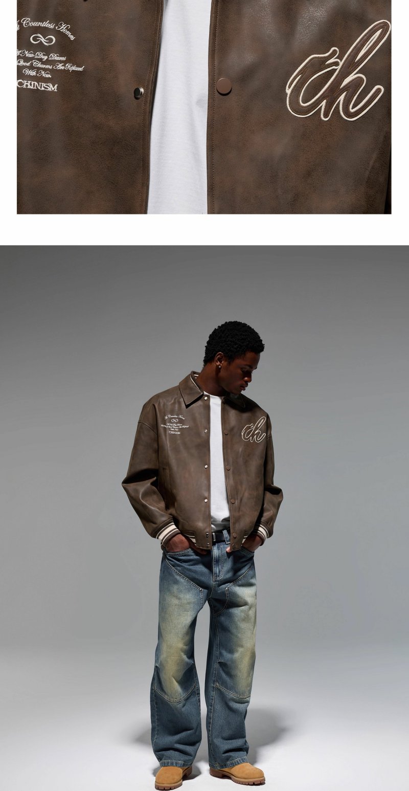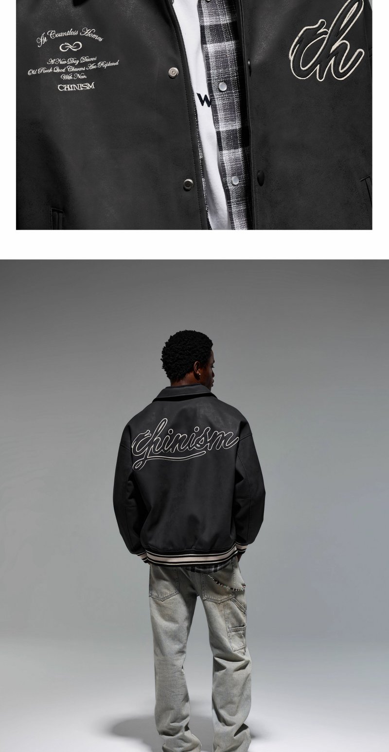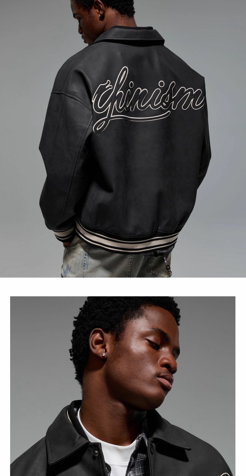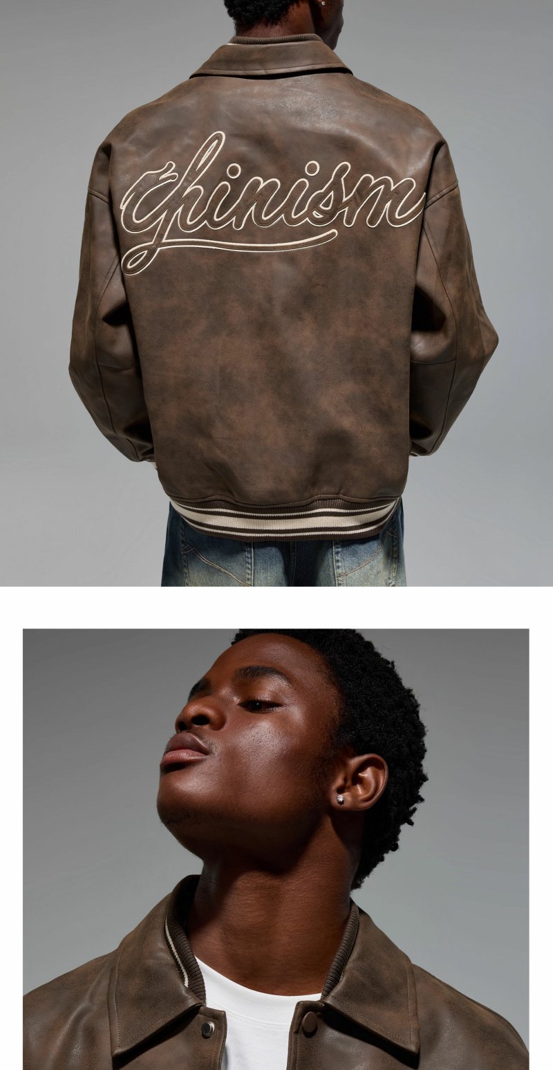CHINISM赤尘 岩纹翻领pu皮夹克男春秋美式皮衣男士棒球服红色外套