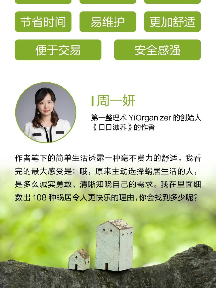 作者笔下的简单生活透露一种毫不费力的舒适。我看完的较大感受是:哦,原来主动选择蜗居生活的人,是多么诚实勇敢、清晰知晓自己的需求。我在里面细数出108种蜗居令人更快乐的理由,你会找到多少呢?——周一妍(第一整理术YiOrganizer的创始人,《日日滋养》的作者)