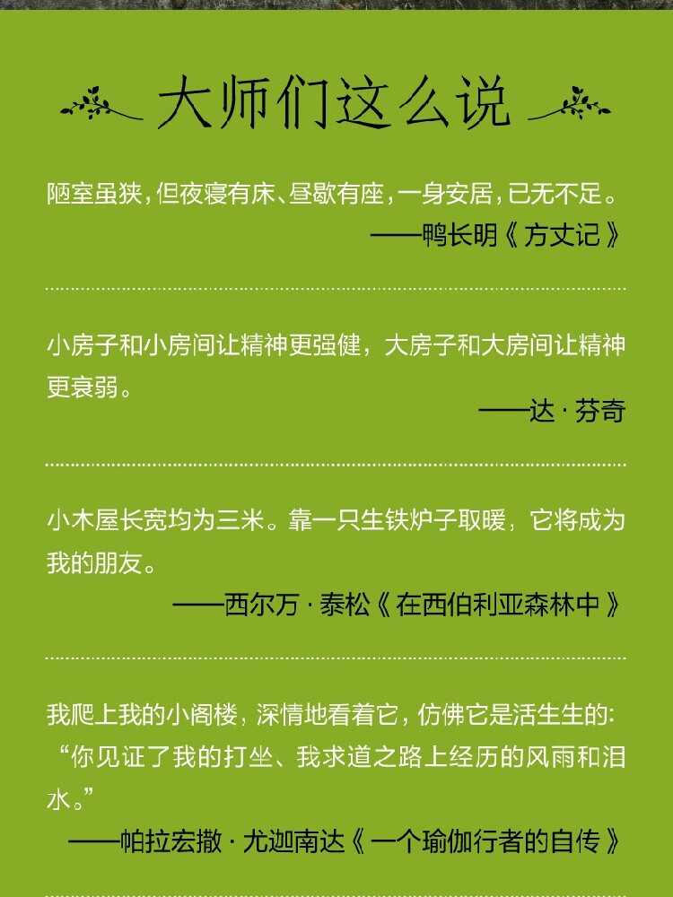 书中没有过激的言论,如果用一句话来概括,那就是“住在小房子里,不时享受孤独,过着轻松、快乐的生活”。我时常读它,因为它让我感到心安。——海外读者评论