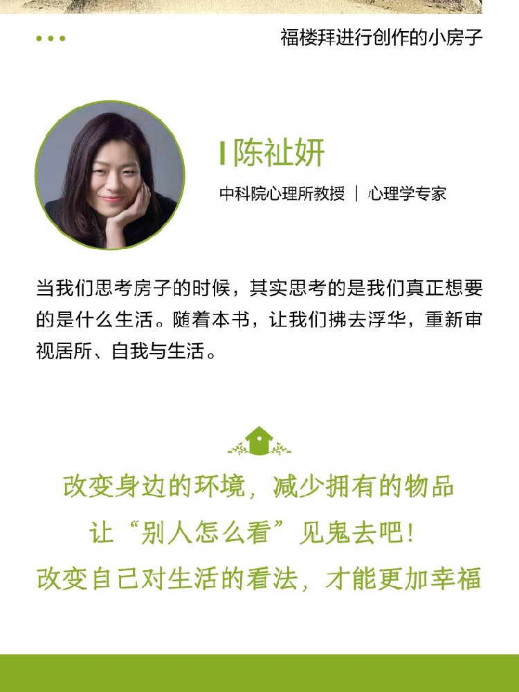 当我们思考房子的时候,其实思考的是我们真正想要的是什么生活。随着本书,让我们拂去浮华,重新审视居所、自我与生活。——陈祉妍(中科院心理所教授、心理学专家)
