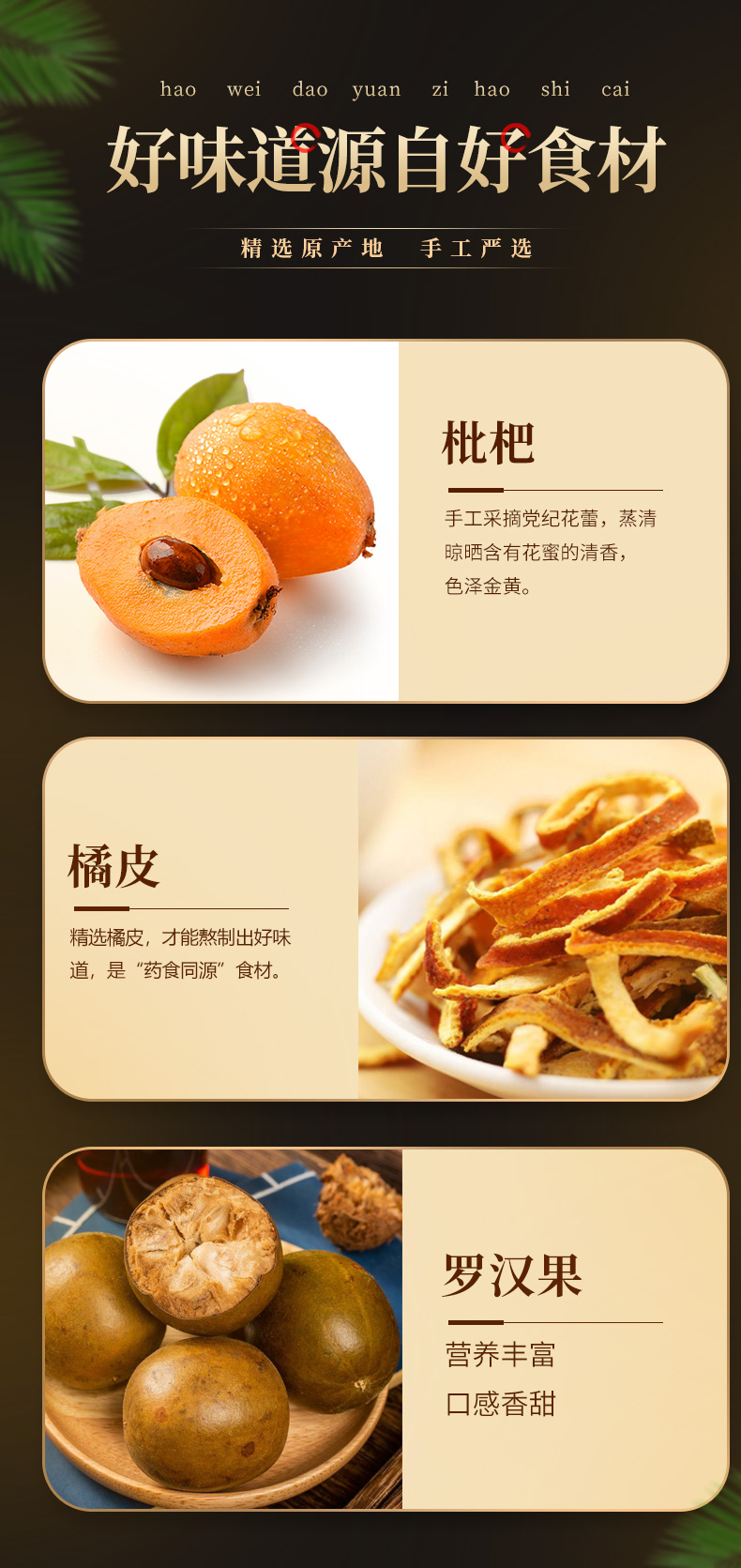 成分:百合、玉竹、罗汉果、枇杷叶、桔梗、橘皮、乌梅