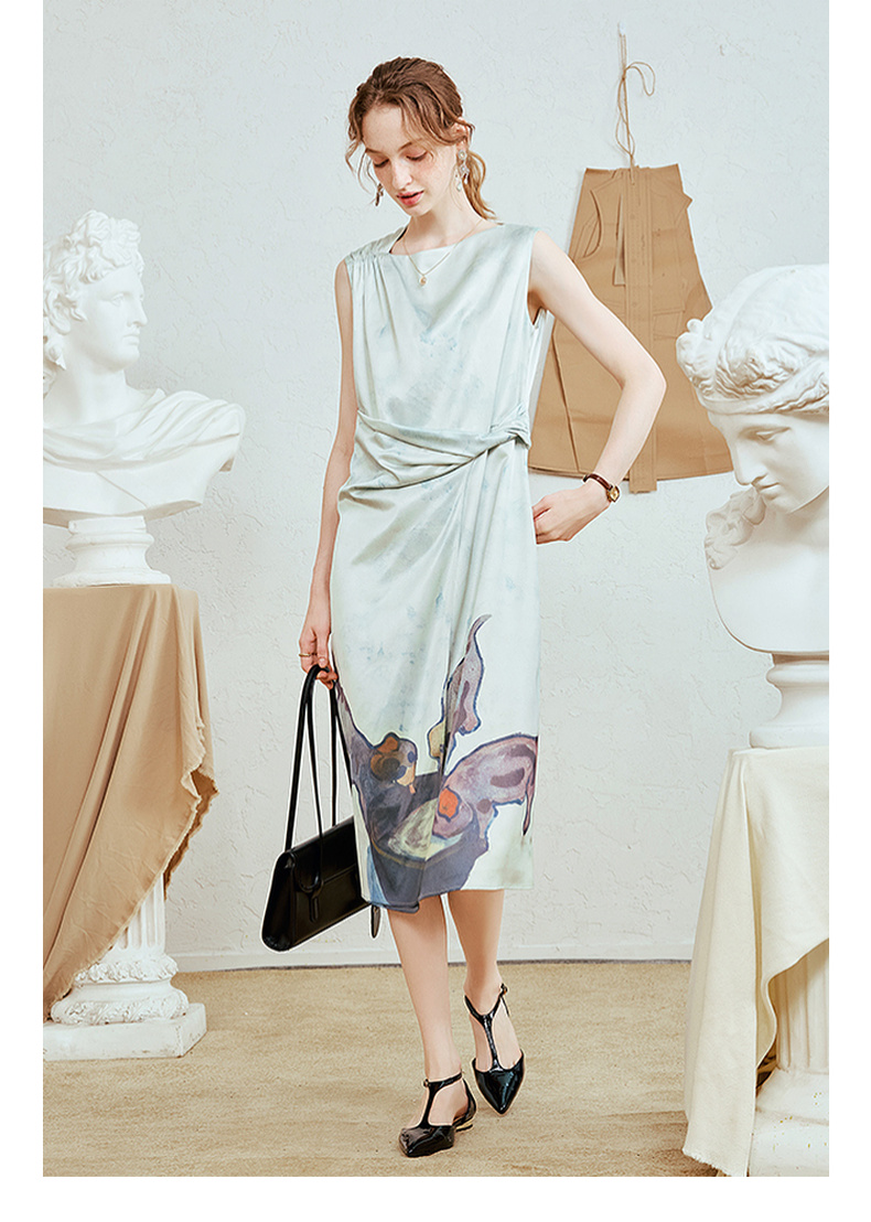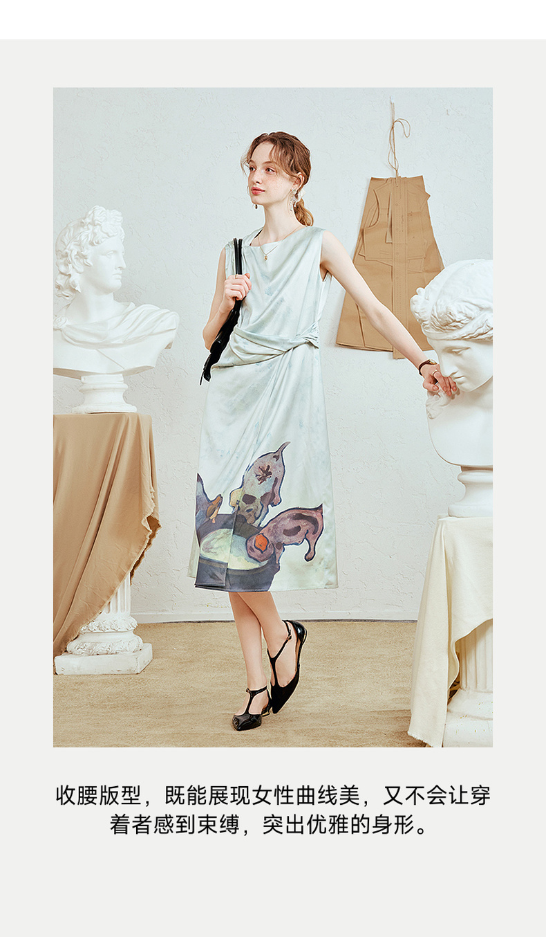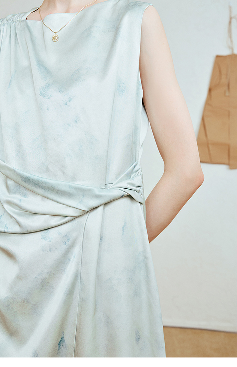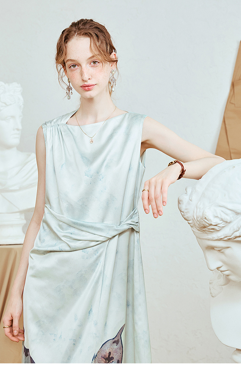 两三事 风的呓语 2025夏季新款优雅印花下摆扭结腰身无袖连衣裙