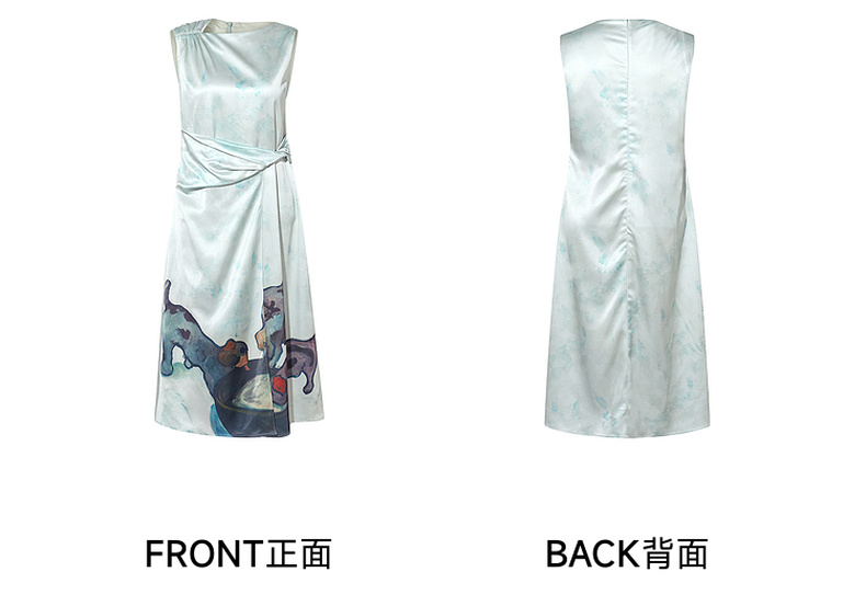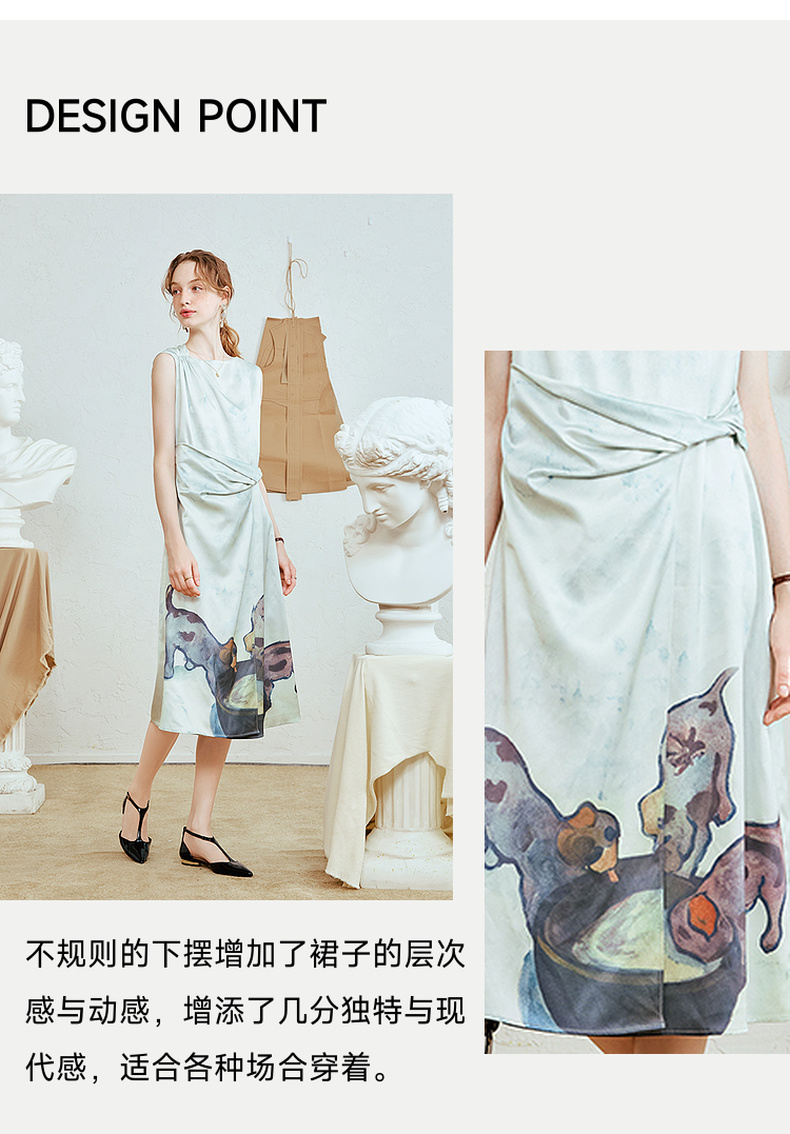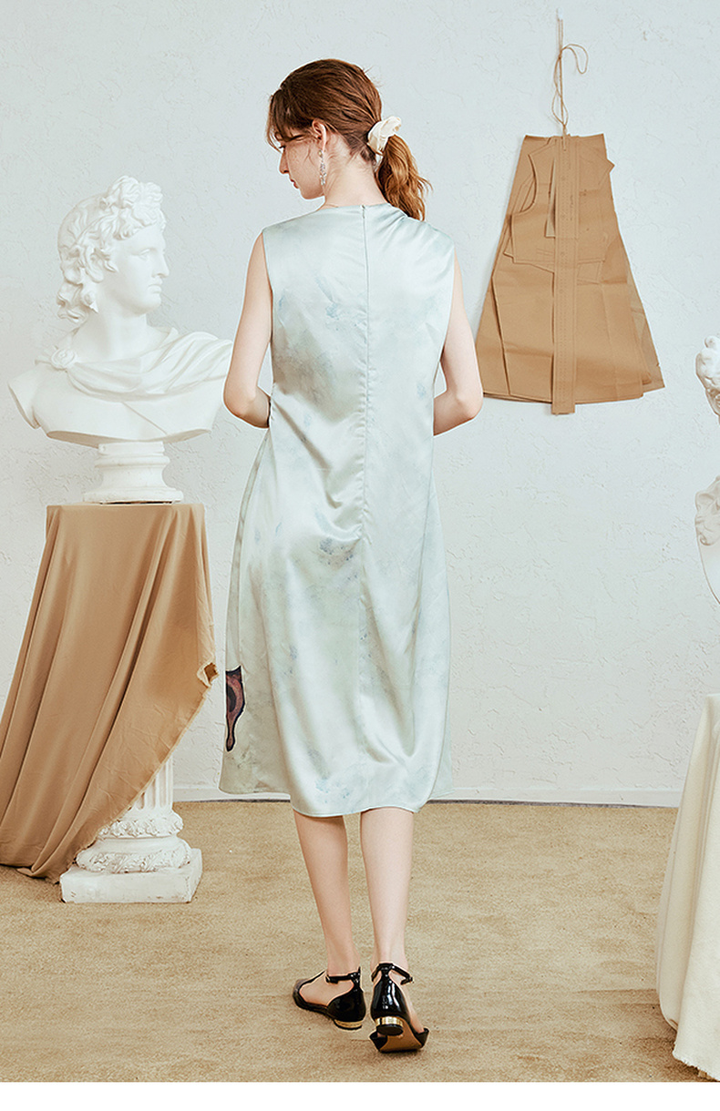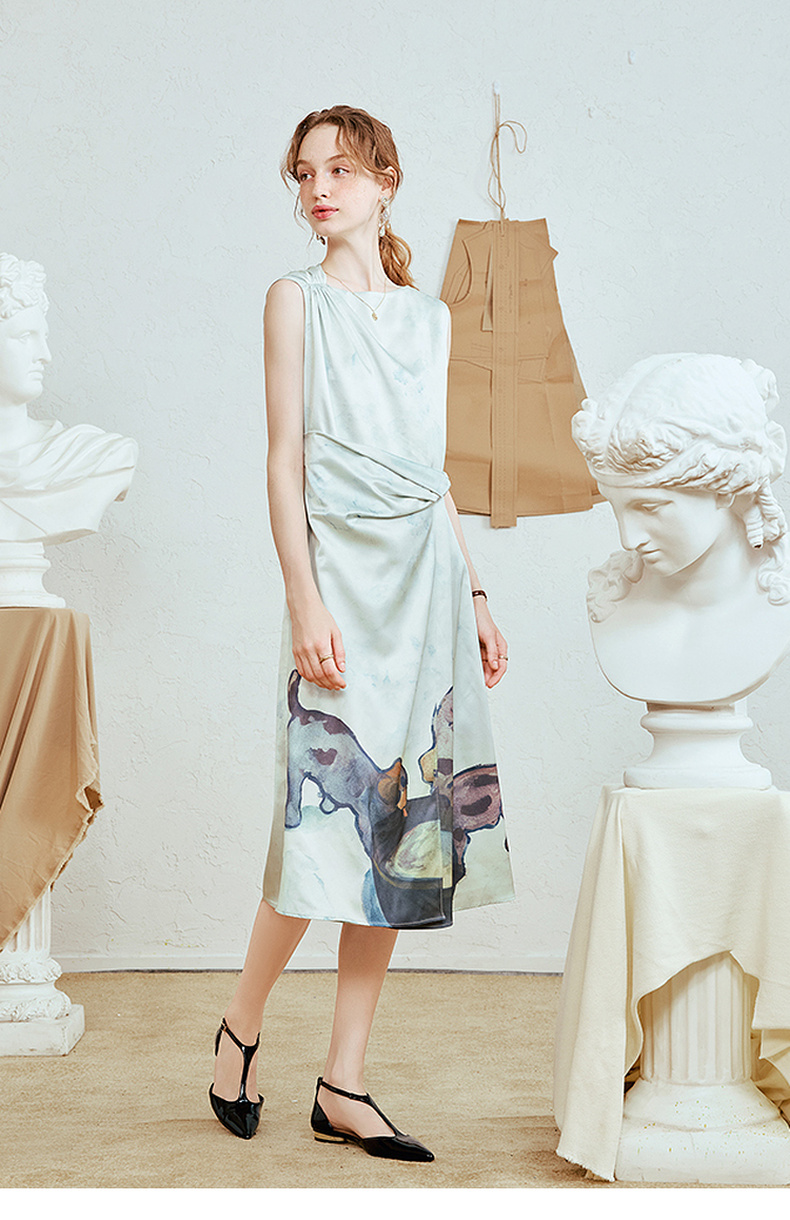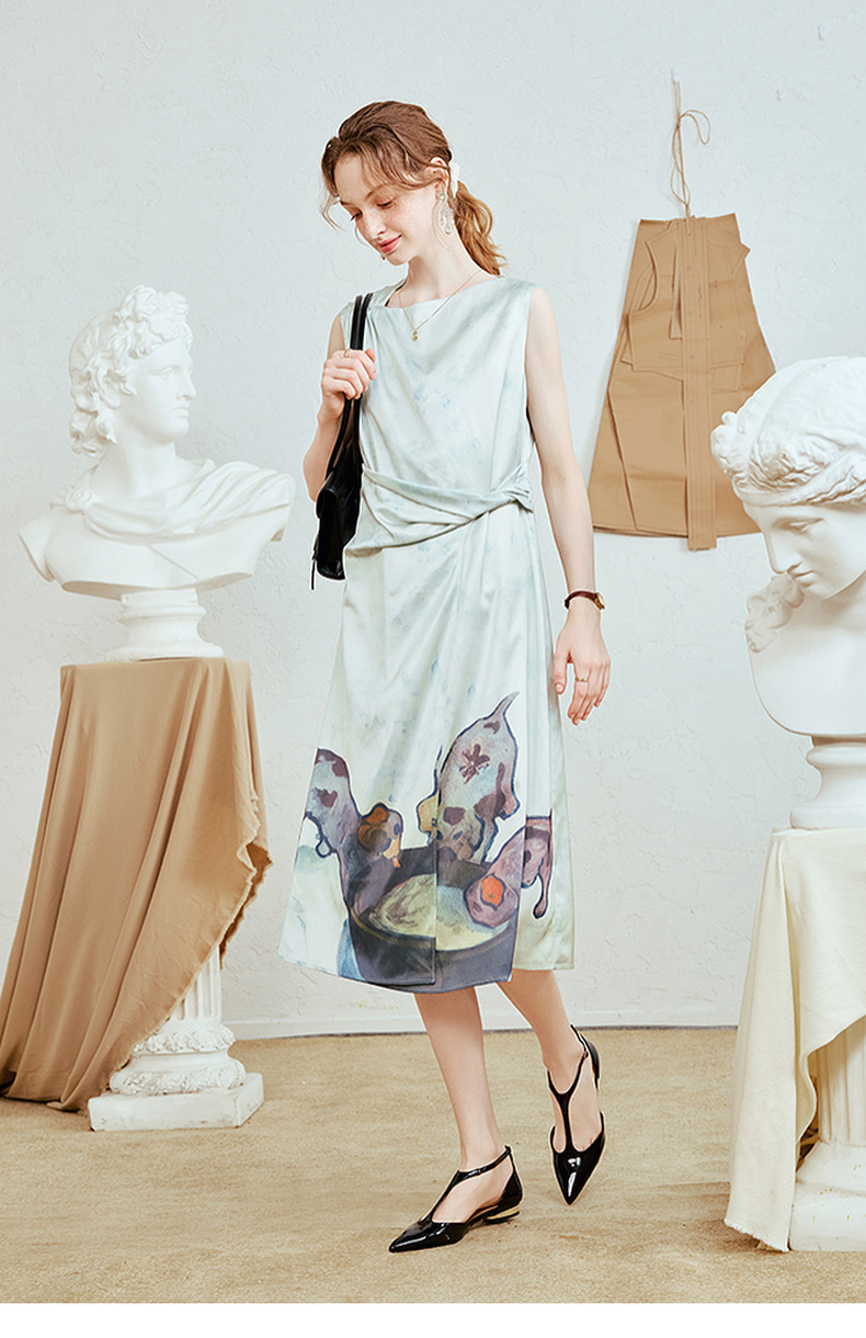 两三事 风的呓语 2025夏季新款优雅印花下摆扭结腰身无袖连衣裙