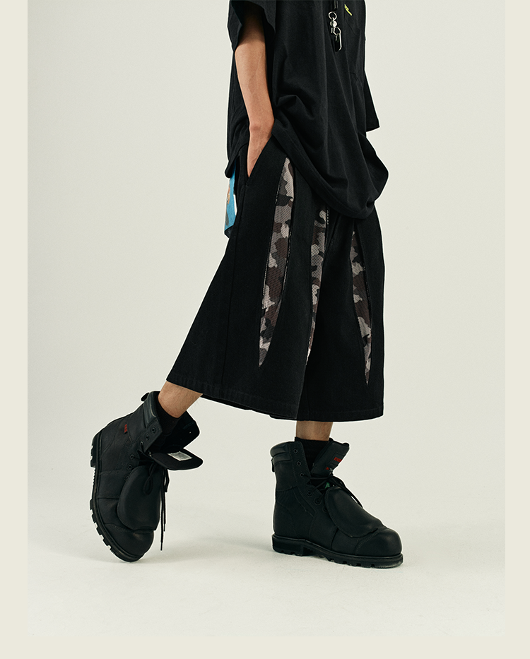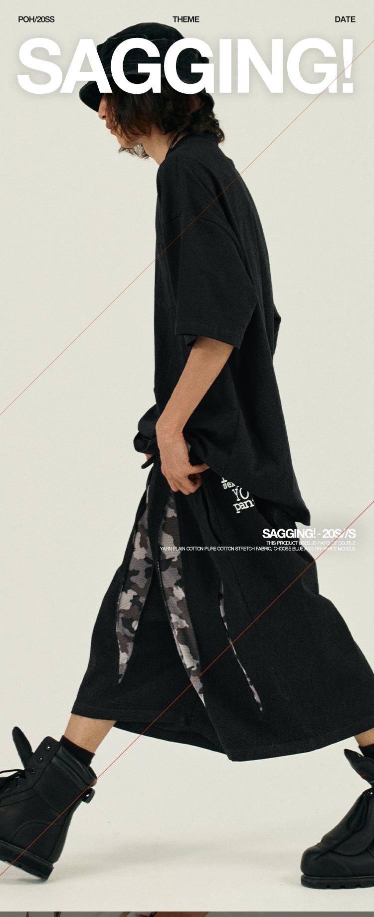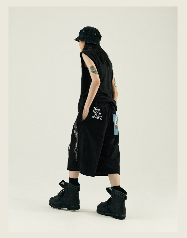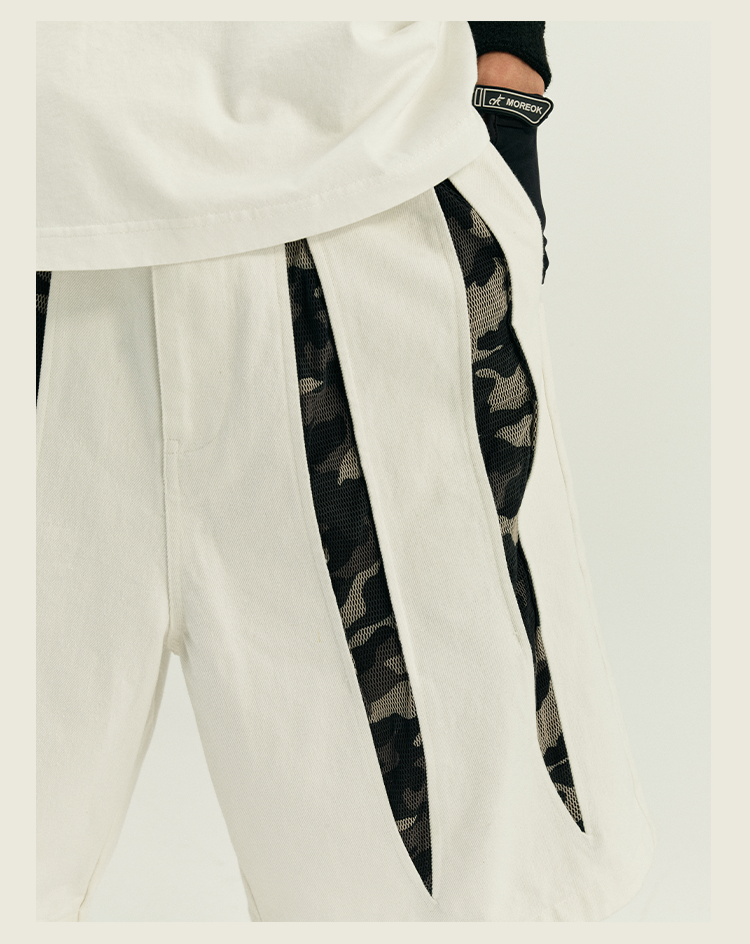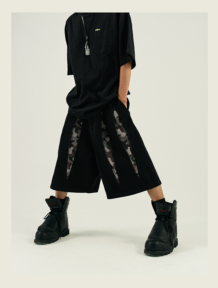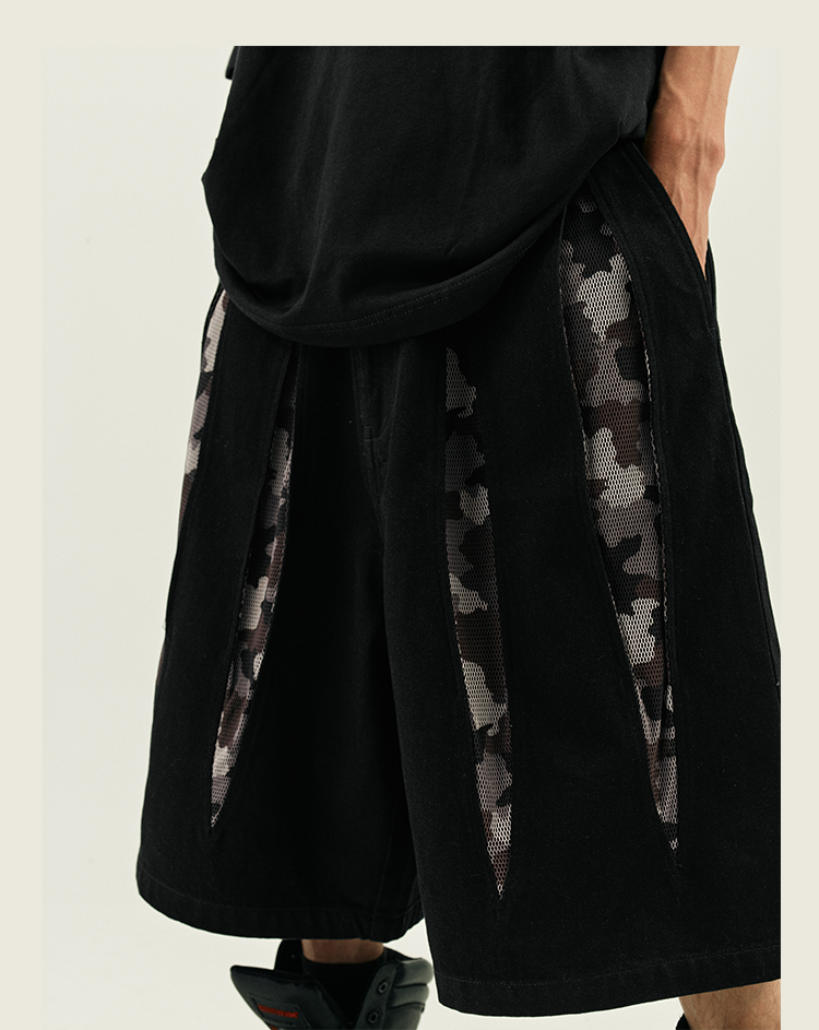 POH 复古美式街头嘻哈五分中裤子宽松百搭印花迷彩网眼牛仔短裤男