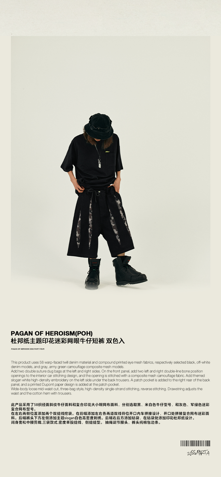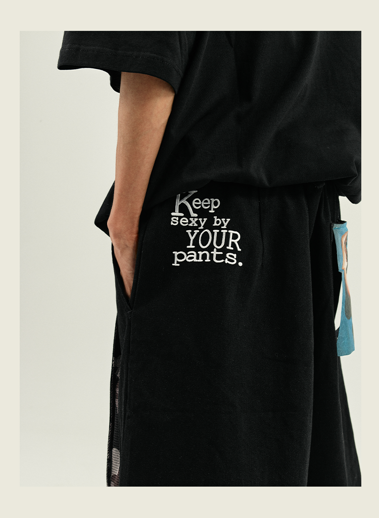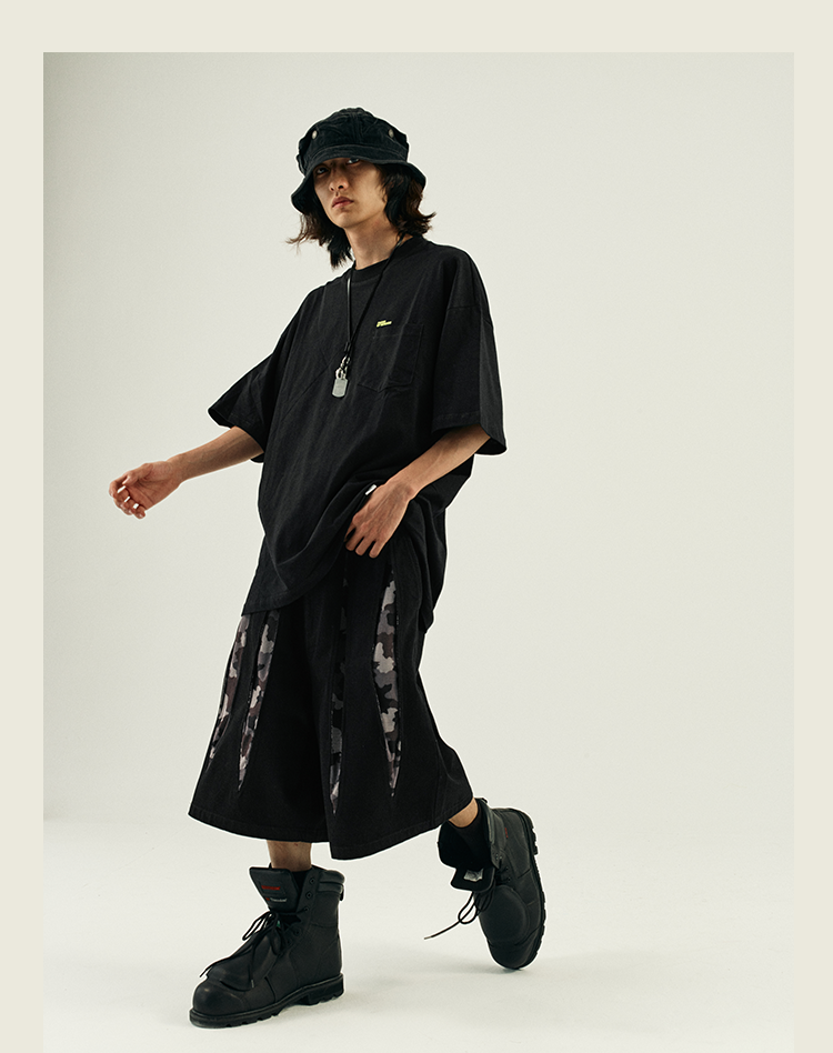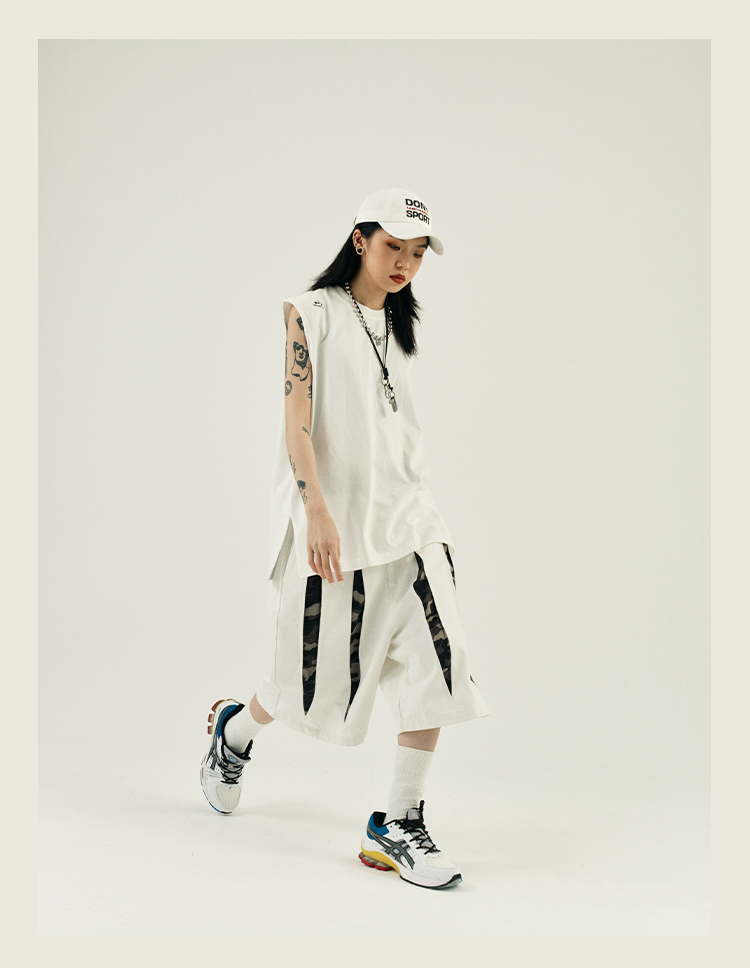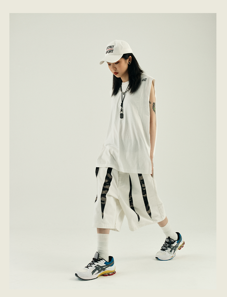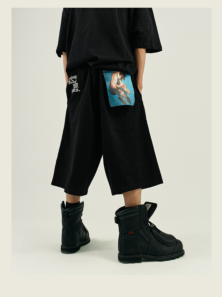 POH 复古美式街头嘻哈五分中裤子宽松百搭印花迷彩网眼牛仔短裤男