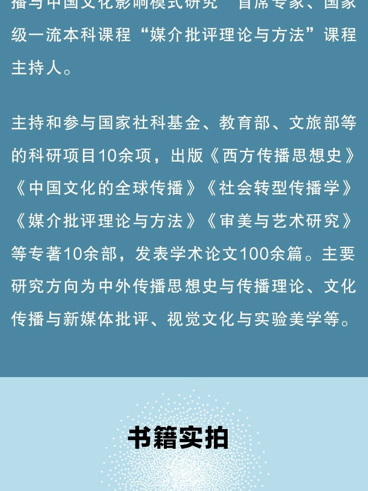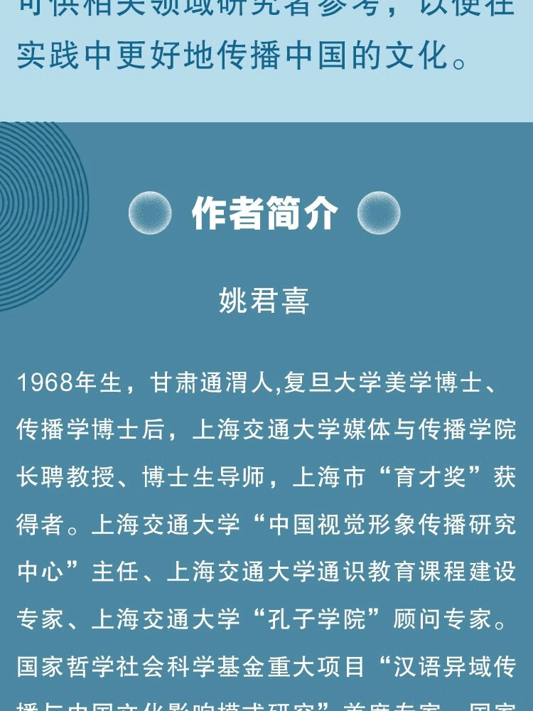 姚君喜,男,1968年生,甘肃通渭人,复旦大学美学博士、传播学博士后,上海交通大学媒体与传播学院长聘教授、博士生导师,上海市“育才奖”获得者。上海交通大学“中国视觉形象传播研究中心”主任、上海交通大学通识教育课程建设专家、上海交通大学“孔子学院”顾问专家。国家哲学社会科学基金重大项目“汉语异域传播与中国文化影响模式研究”首席专家、一流本科课程“媒介批评理论与方法”课程主持人。主持和参与国家社科基金、教育部、文旅部等的科研项目10余项,出版《西方传播思想史》《中国文化的全球传播》《社会转型传播学》《媒介批评理论与方法》《审美与艺术研究》等专著10余部,发表学术论文100余篇。主要研究方向为中外传播思想史与传播理论、文化传播与新媒体批评、视觉文化与实验美学等。