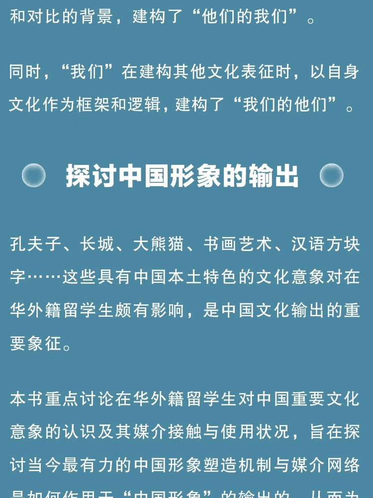 本书探讨的是在华外籍学生通过何种富于中国本土特色的“文化符号”建立对中国的认识,孔夫子、长城、大熊猫、书画艺术、汉语方块字等,各种中国文化意象对在华外籍留学生施加影响,也是中国文化输出的重要象征。本书既具学理性,又具现实意义,可供相关领域研究者参考,以便在实践中更好地传播中国的文化。