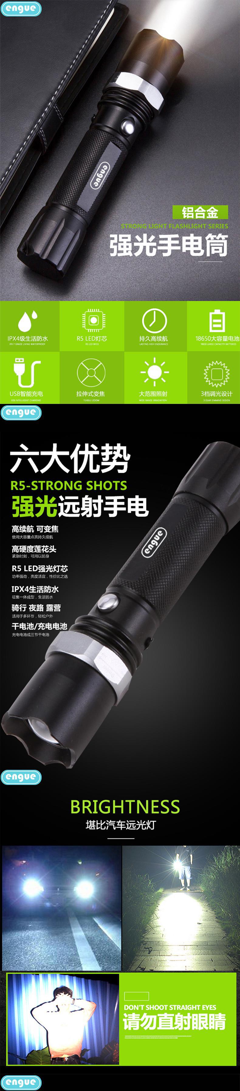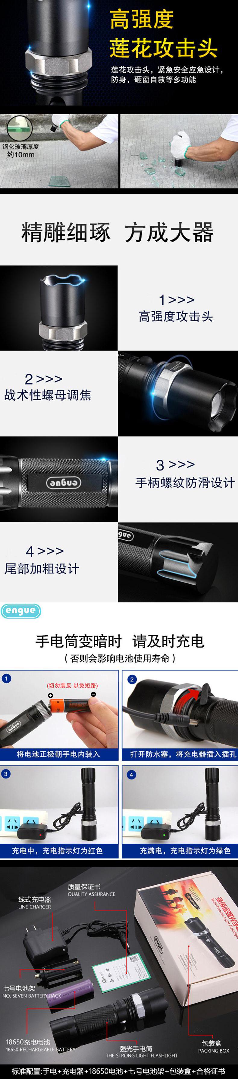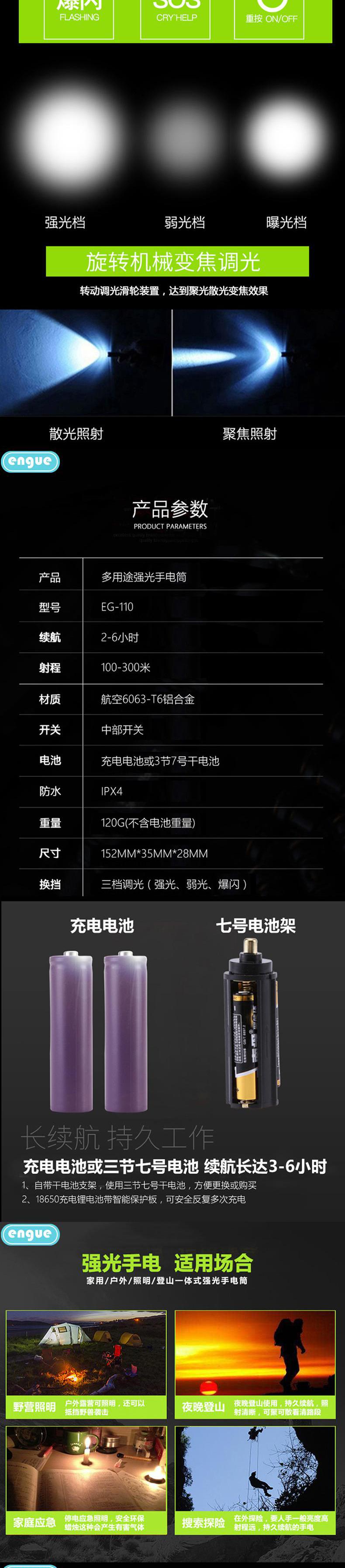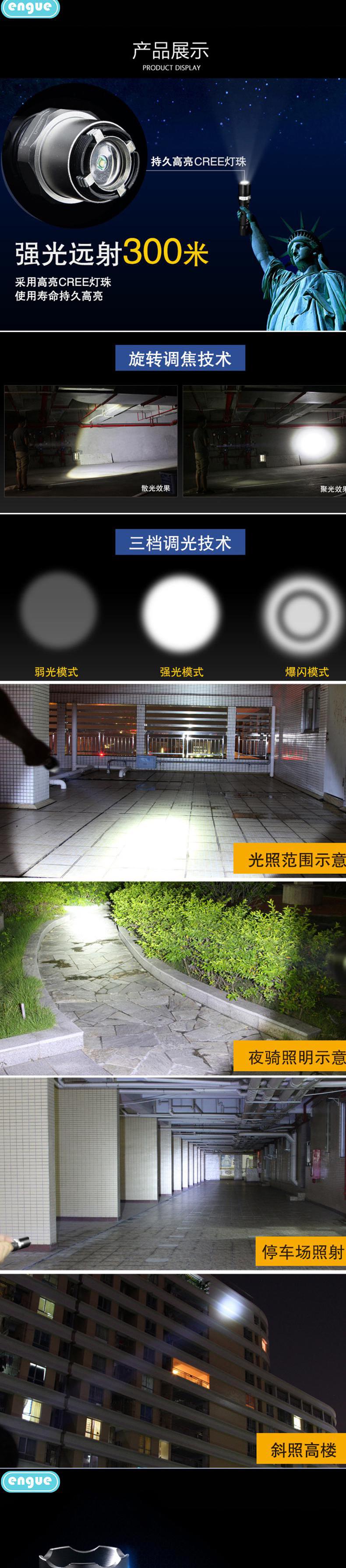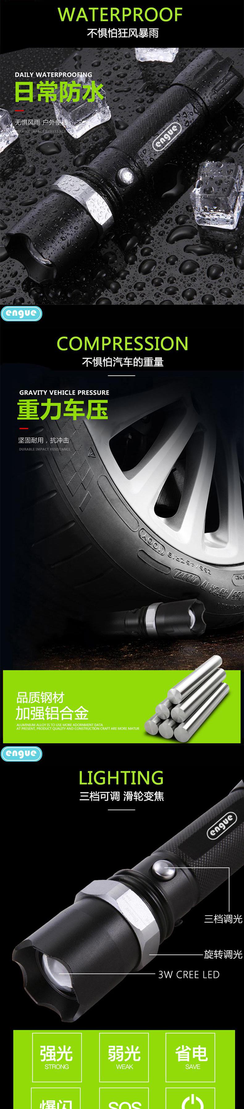 engue恩谷三档强光调焦金属手电筒EG-110机械调焦航空铝合金耐磨