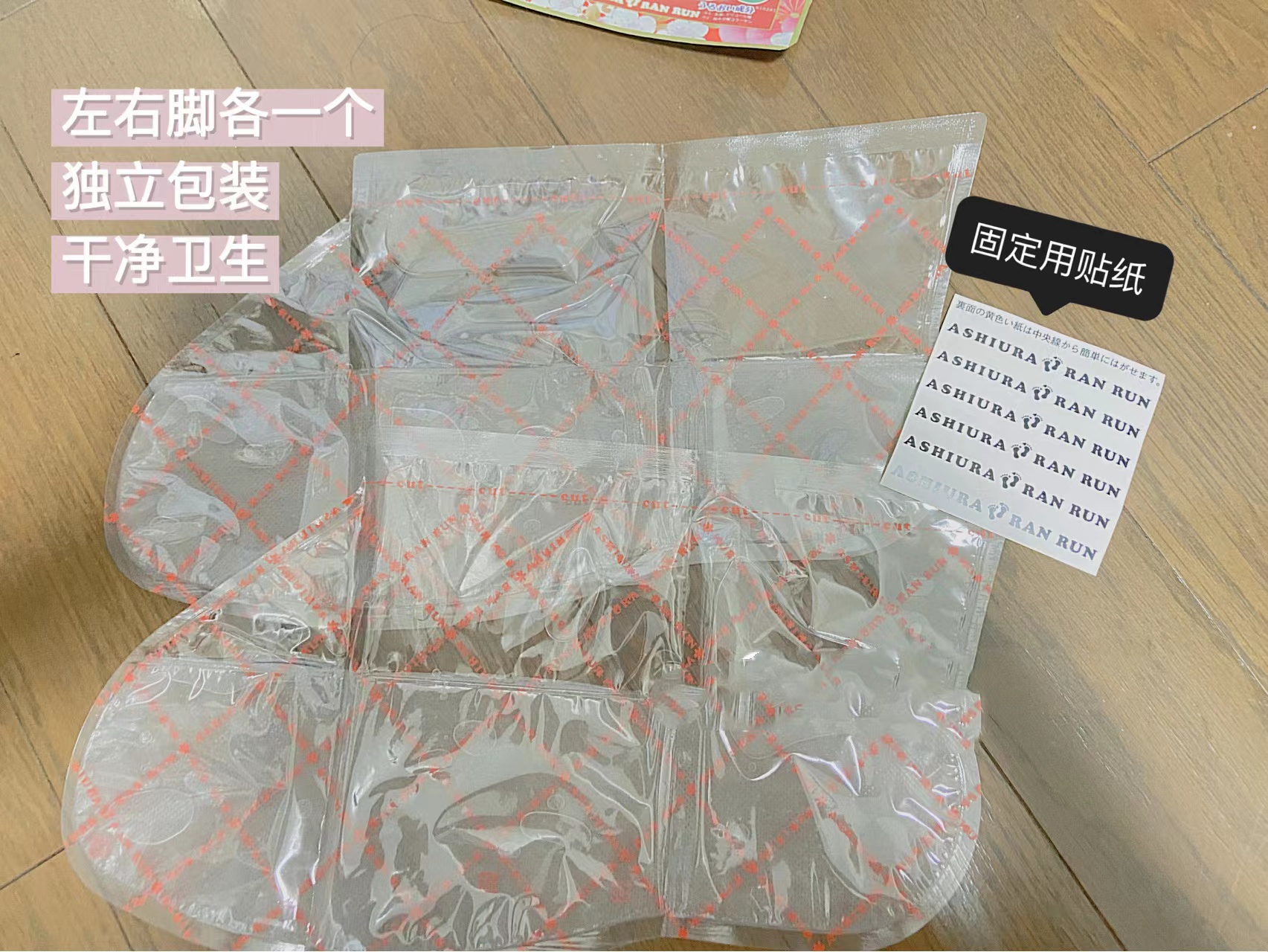 一双脚使用,只能用一次哈,还有附赠的贴纸,使用脚膜的时候可以用贴纸把塑料袋封口贴紧,