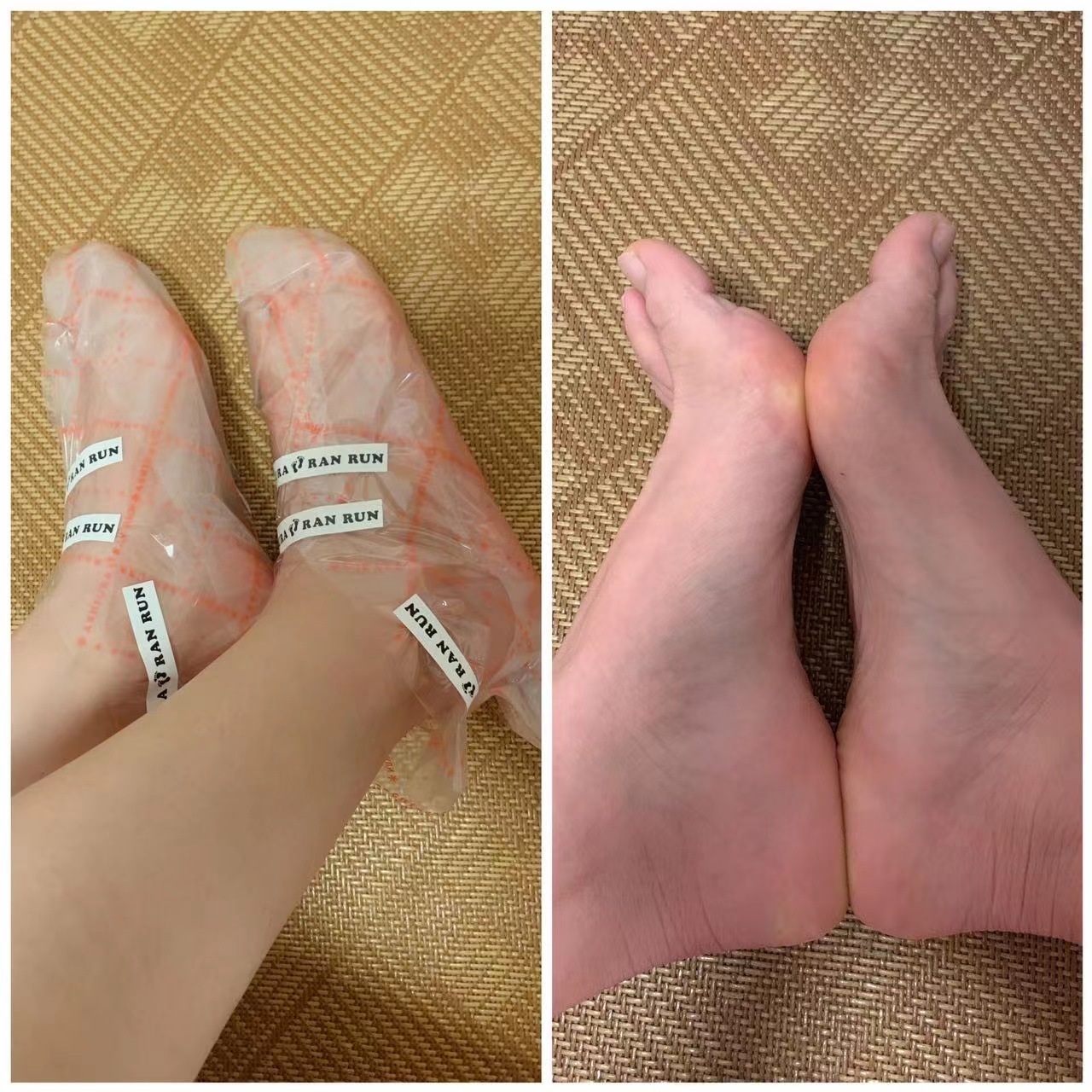 STEP2:将脚用温水清洗干净软化角质,将足膜套在脚上
