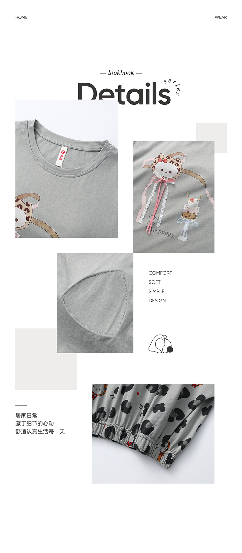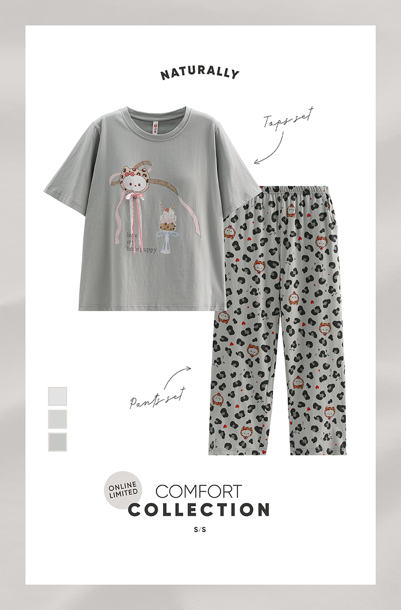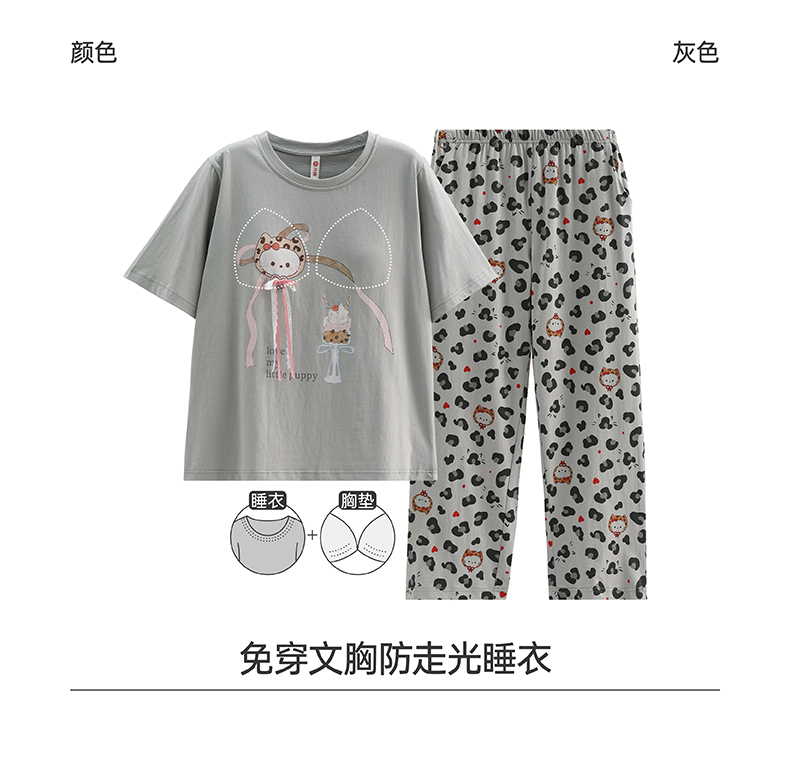 芬腾【带胸垫】防凸点短袖长裤豹纹女款春夏季睡衣纯棉家居服套装