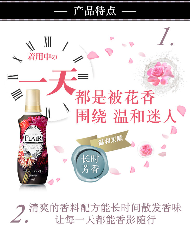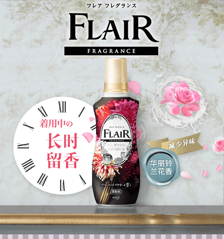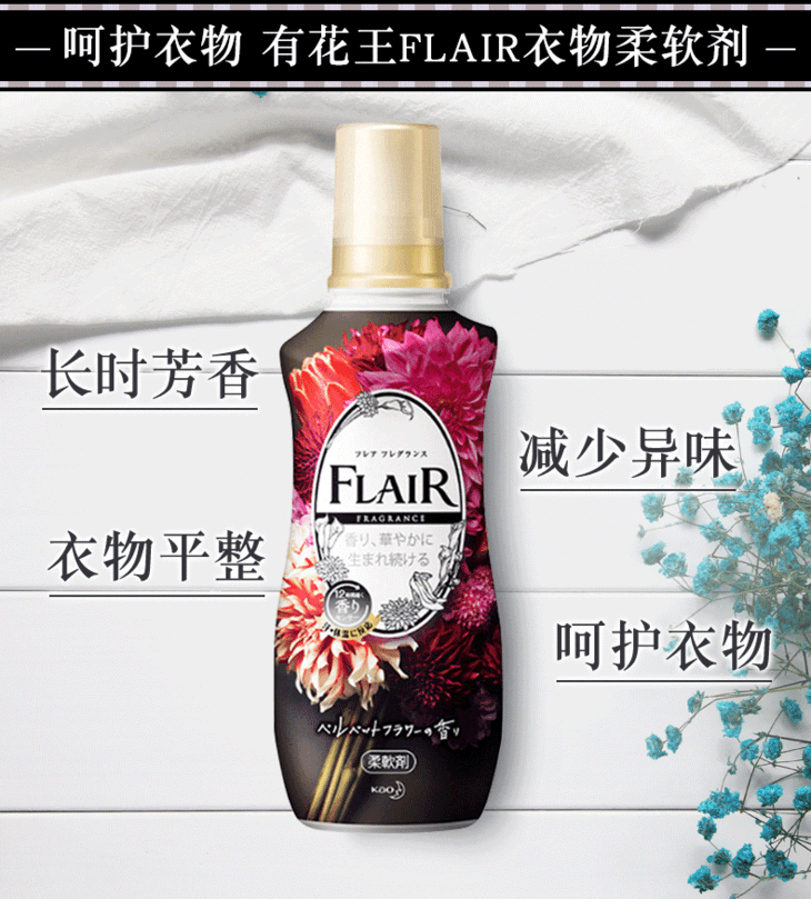 日本进口花王flair柔顺剂衣物蓬松除臭除皱防静电衣服柔软剂 天鹅绒花香 540ML(377401)