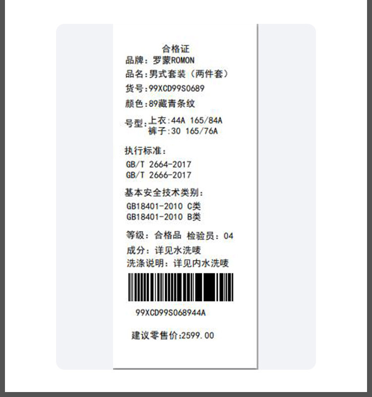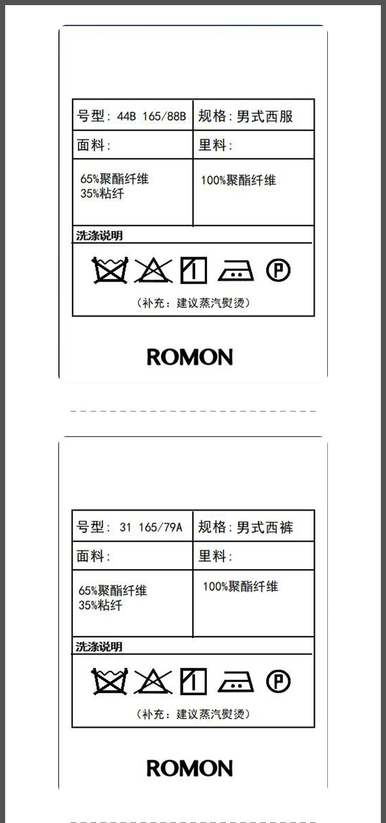 面料:65%聚酯纤维,35%粘纤;里料:100%聚酯纤维