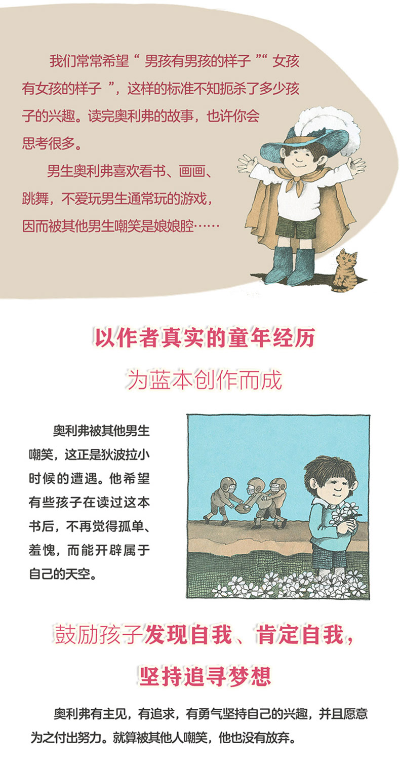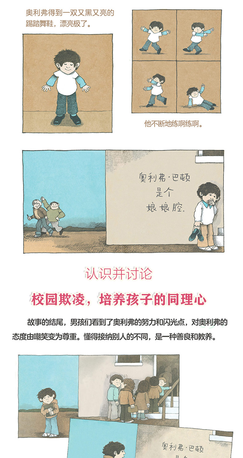 这是图画书大师汤米·狄波拉创作的一本自传性质浓厚的图画书,灵感源于他真实的童年经历。男生奥利弗喜欢看书、画画、玩纸偶娃娃,由于不擅长球类运动,不爱玩男生通常玩的游戏,而被其他男生嘲笑、排挤。幸好,奥利弗得到一双踢踏舞鞋,让他能在跳舞课上尽情地发挥自己的长处。奥利弗还参加了一场才艺比赛,表演了拿手的踢踏舞。最终他并没有获得优胜,但学校墙上那句“奥利弗是个娘娘腔”被同学们改成了“奥利弗是个大明星”。故事提醒我们:要打破对性别的刻板印象,不以性别区分孩子的兴趣和长处;要尊重个体差异,因为每个人都是独一无二的。