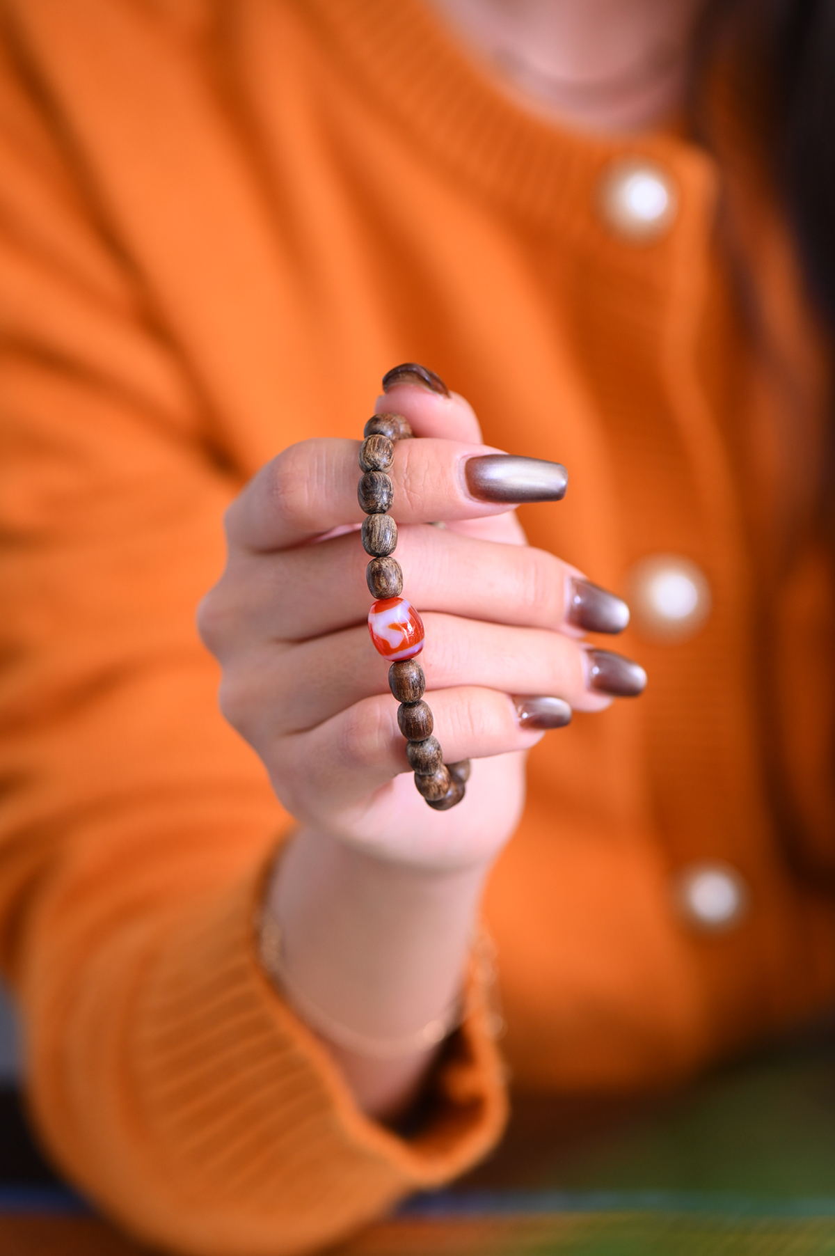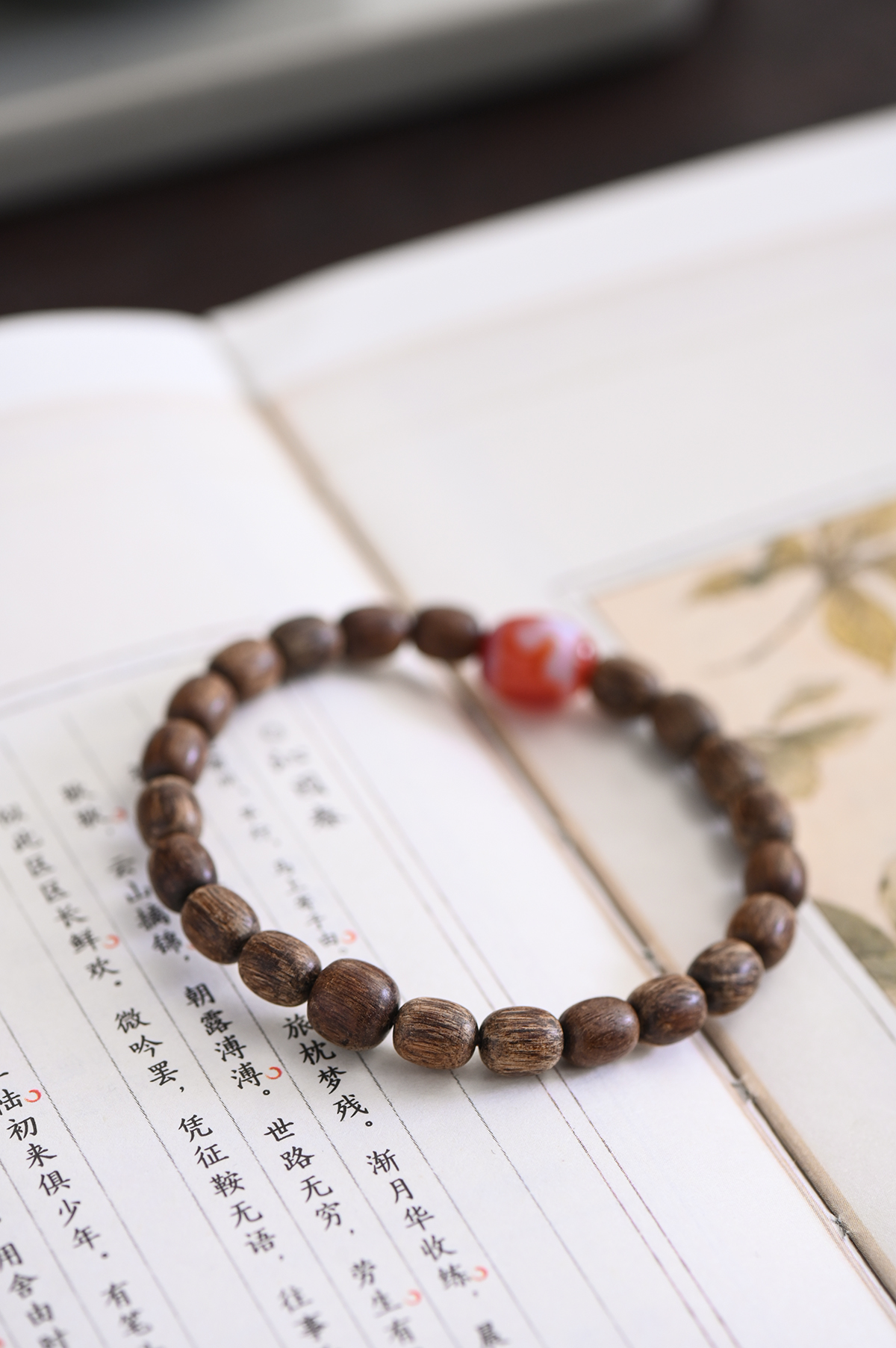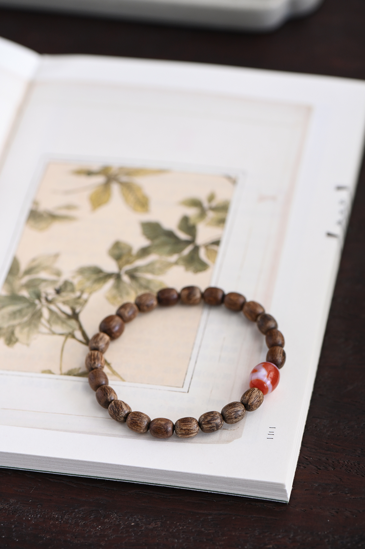 桶珠造型复古又有质感,搭配一颗红纹珠点缀,戴在手上简约又吸睛。