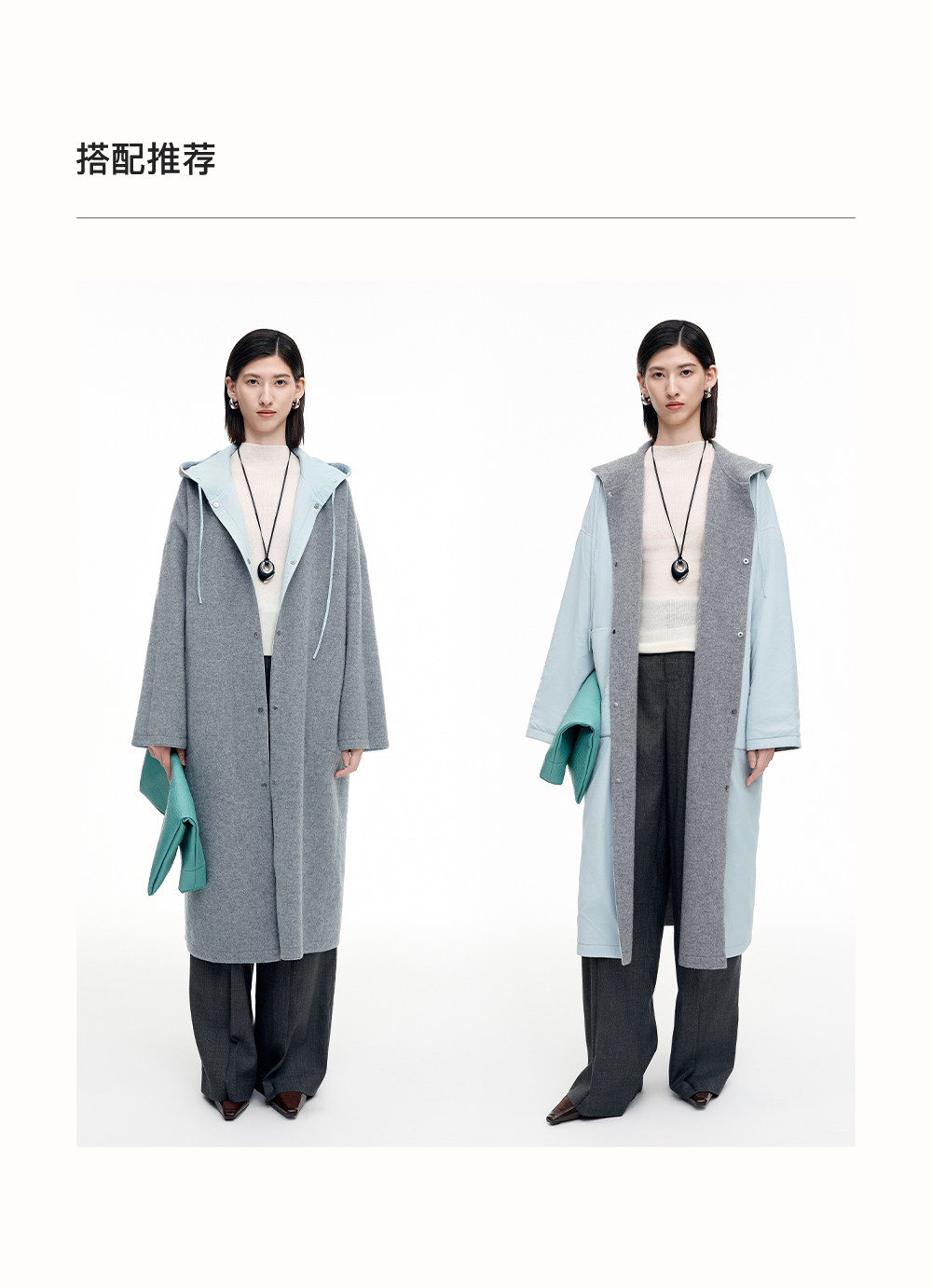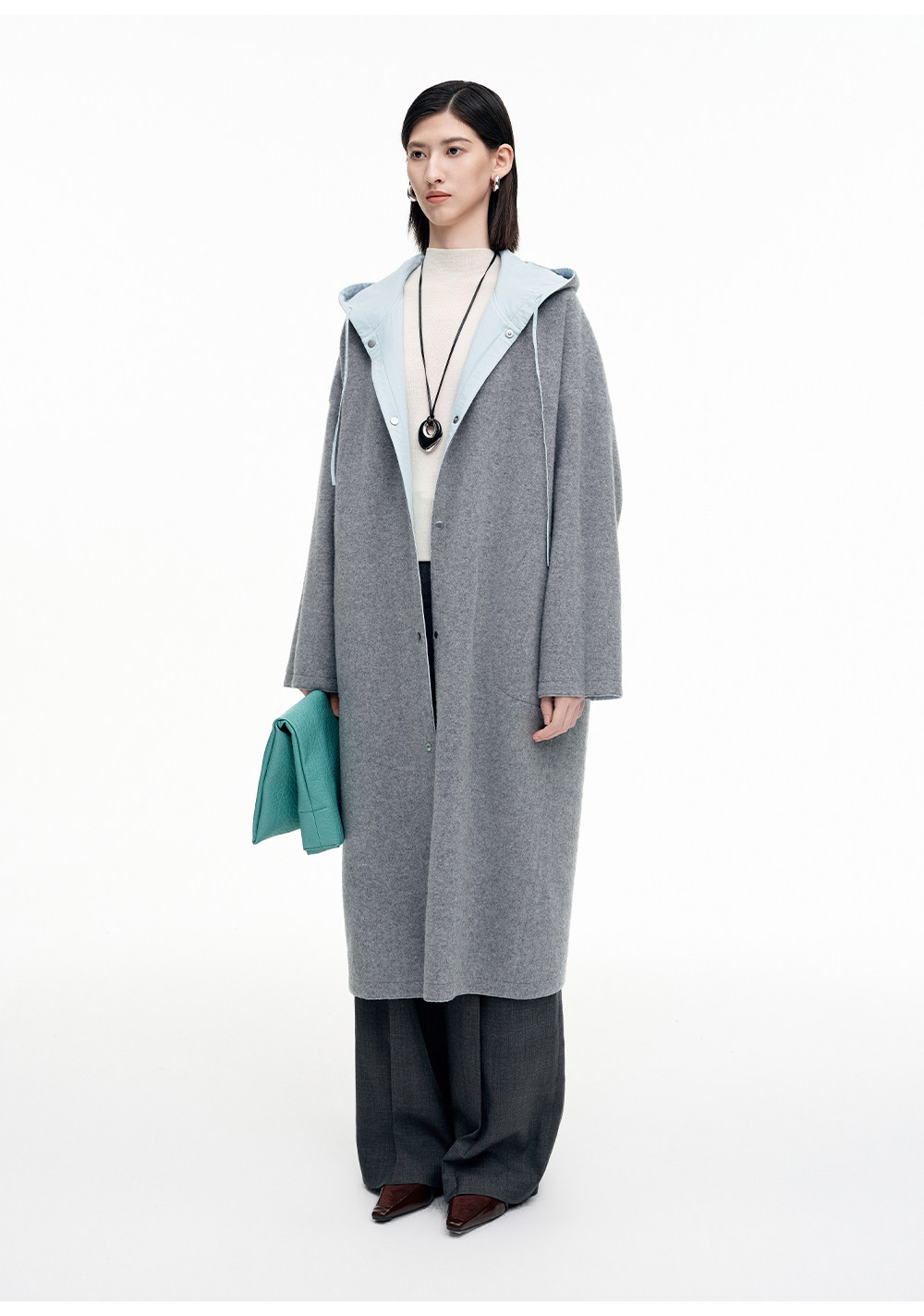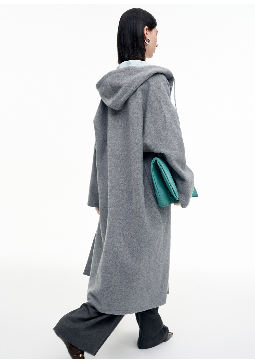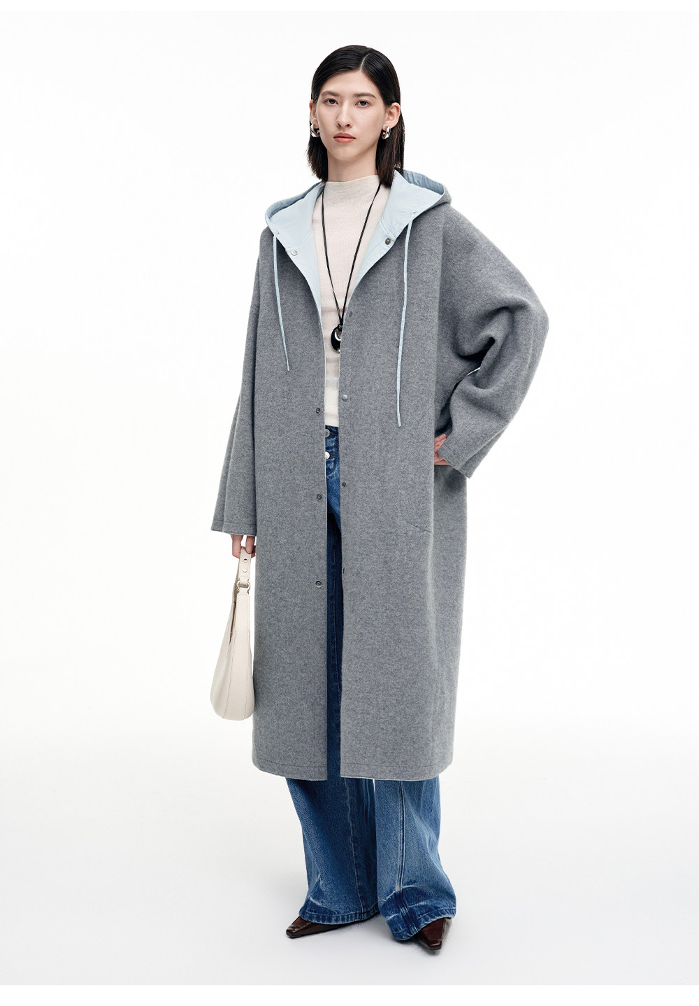 SELFWHO100%绵羊毛灰色双面穿外套女2026春季新款连帽抽绳大衣
