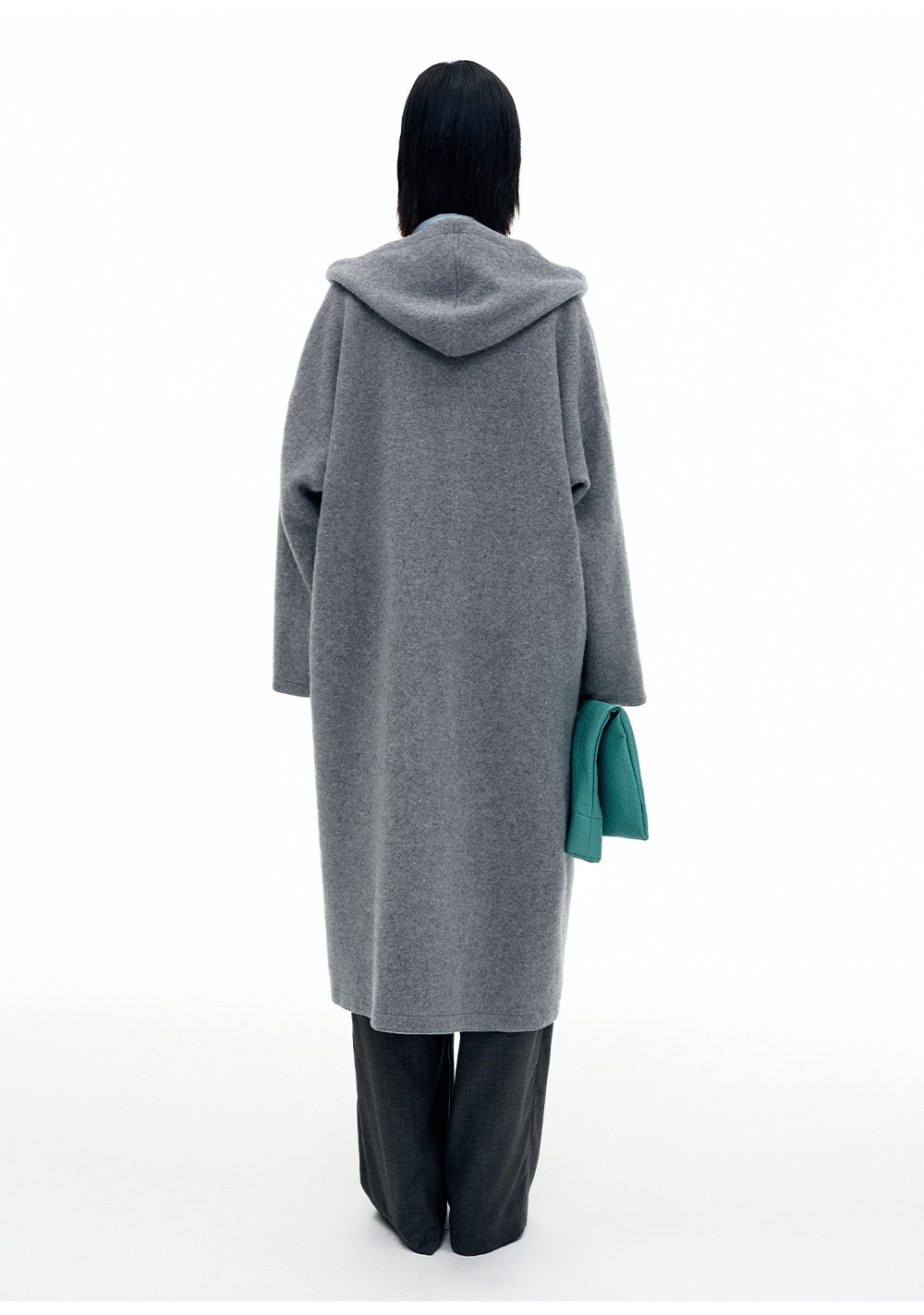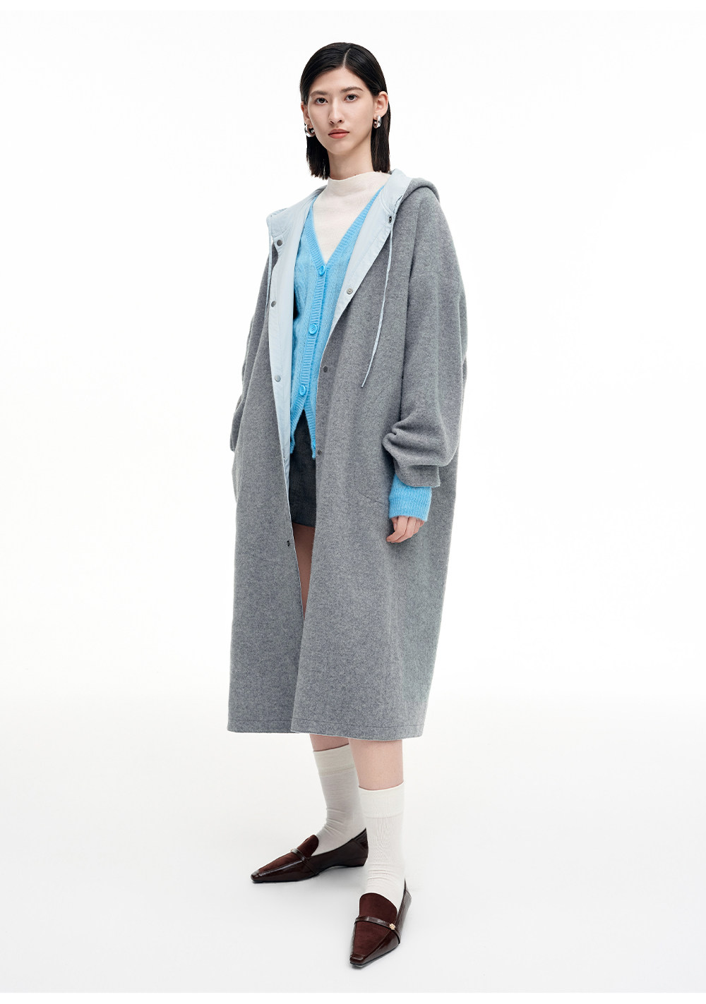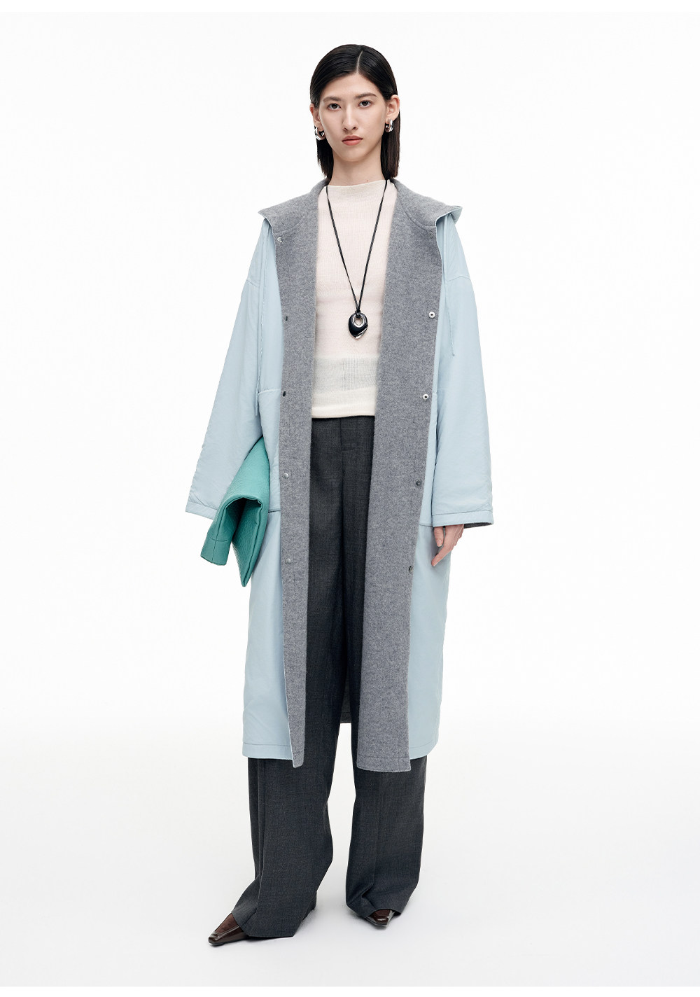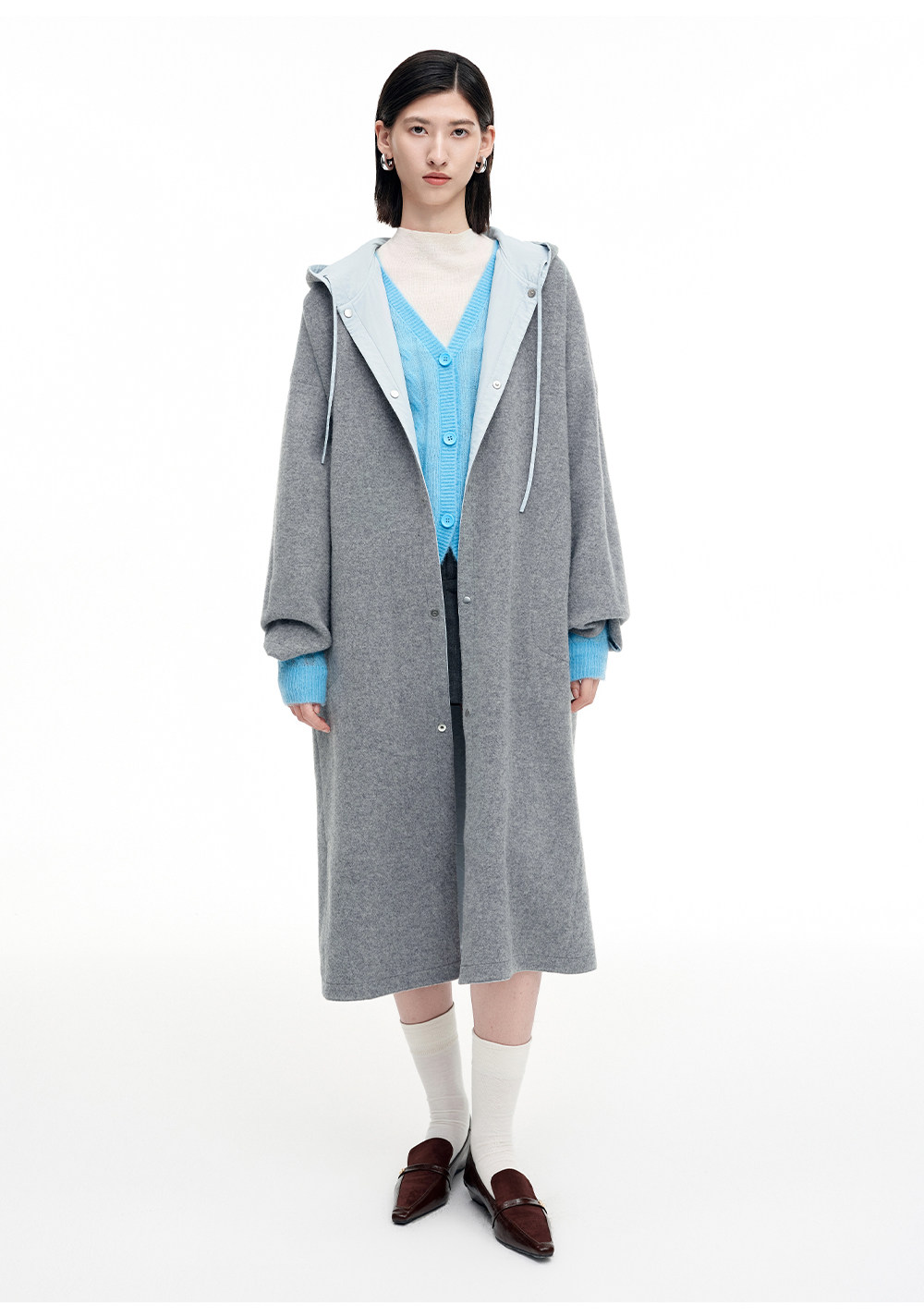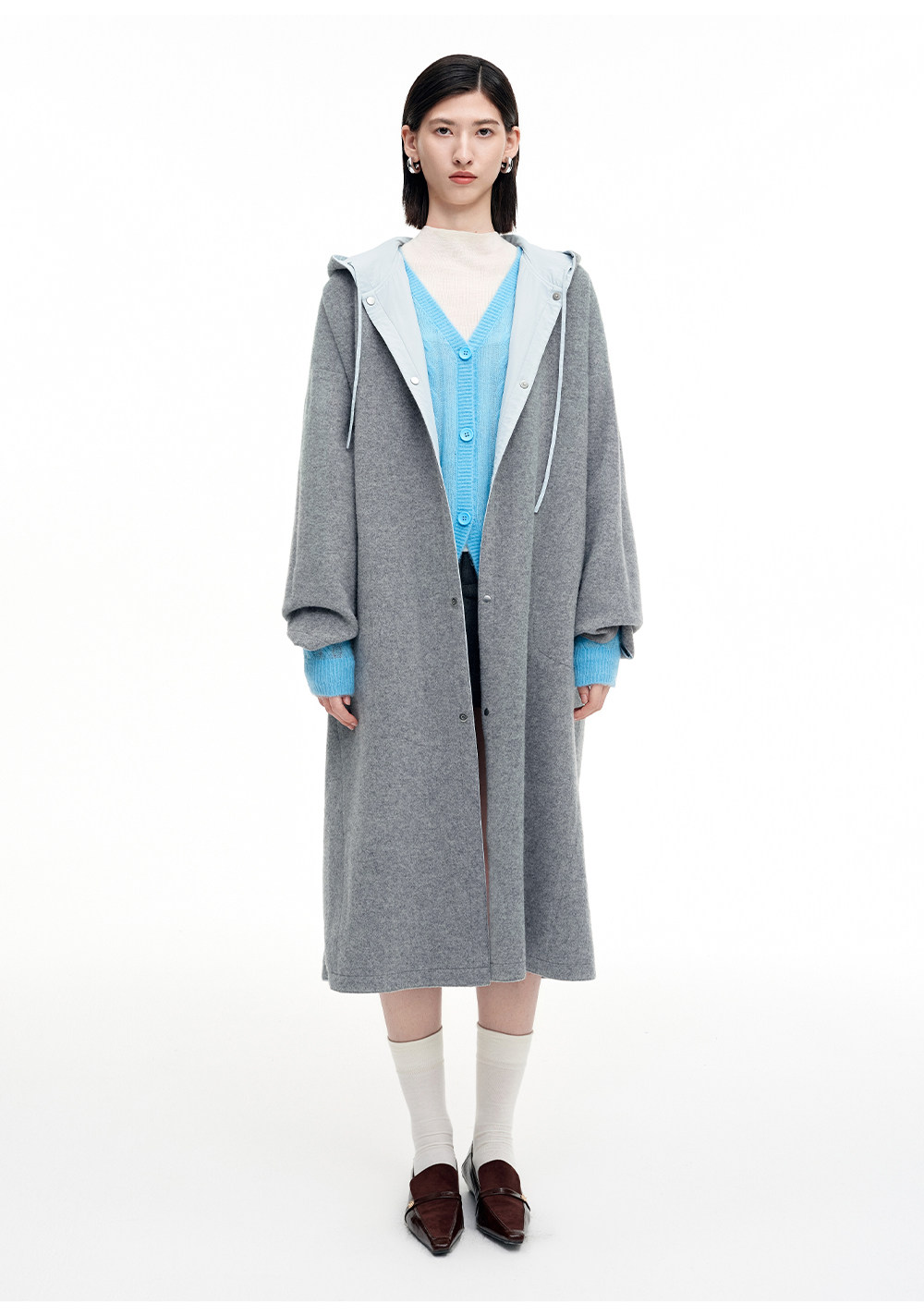 SELFWHO100%绵羊毛灰色双面穿外套女2026春季新款连帽抽绳大衣