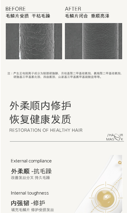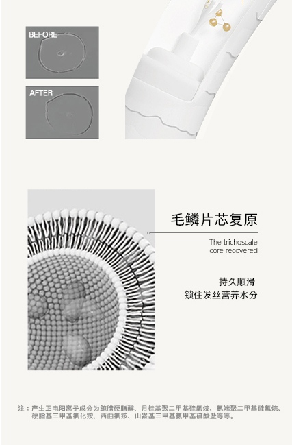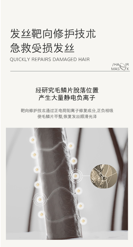 发丝靶向修护技术,通过正电荷阳离子修护成分正负相吸,使毛鳞片平整