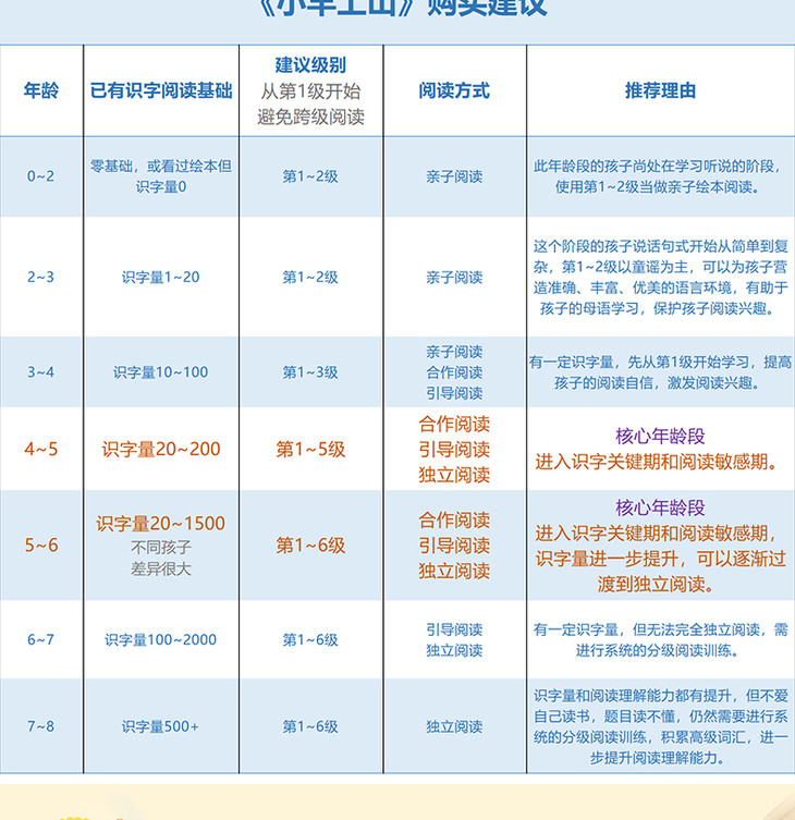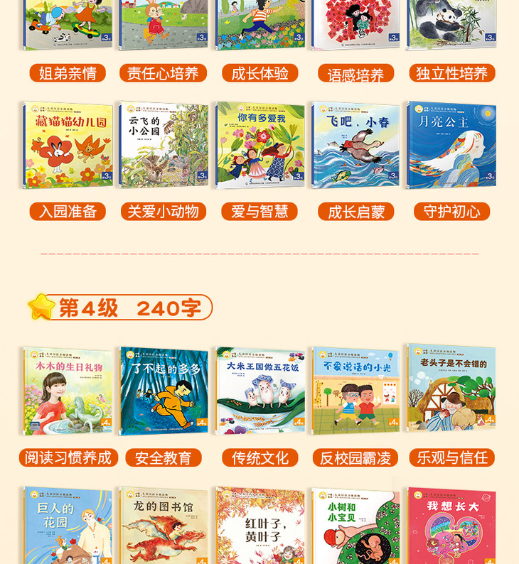 第6级开始,逐步超越绘本,向桥梁书过渡,训练孩子阅读长故事的能力。更涉及到了方方面面科学、数学、识字等等