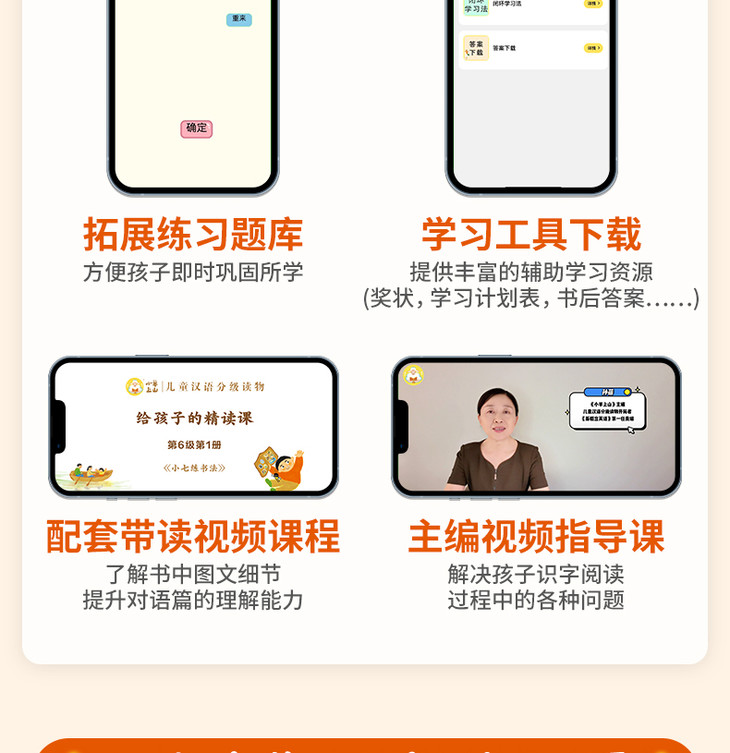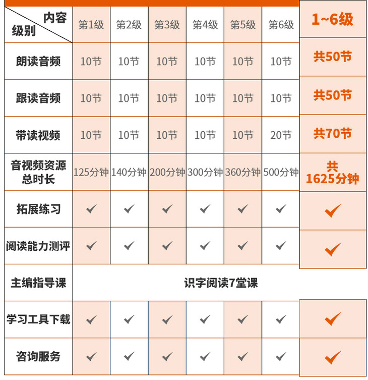 最重要的变化是:从第6级开始,核心汉字达到了390个字。学过前5级的孩子已经基本能够认识300多个汉字了。现在的他们已经可以阅读比较长、比较完整的故事了。现在第6级就要加快孩子识字的识字速度,增加阅读的深度和文学性,全面提升阅读能力。