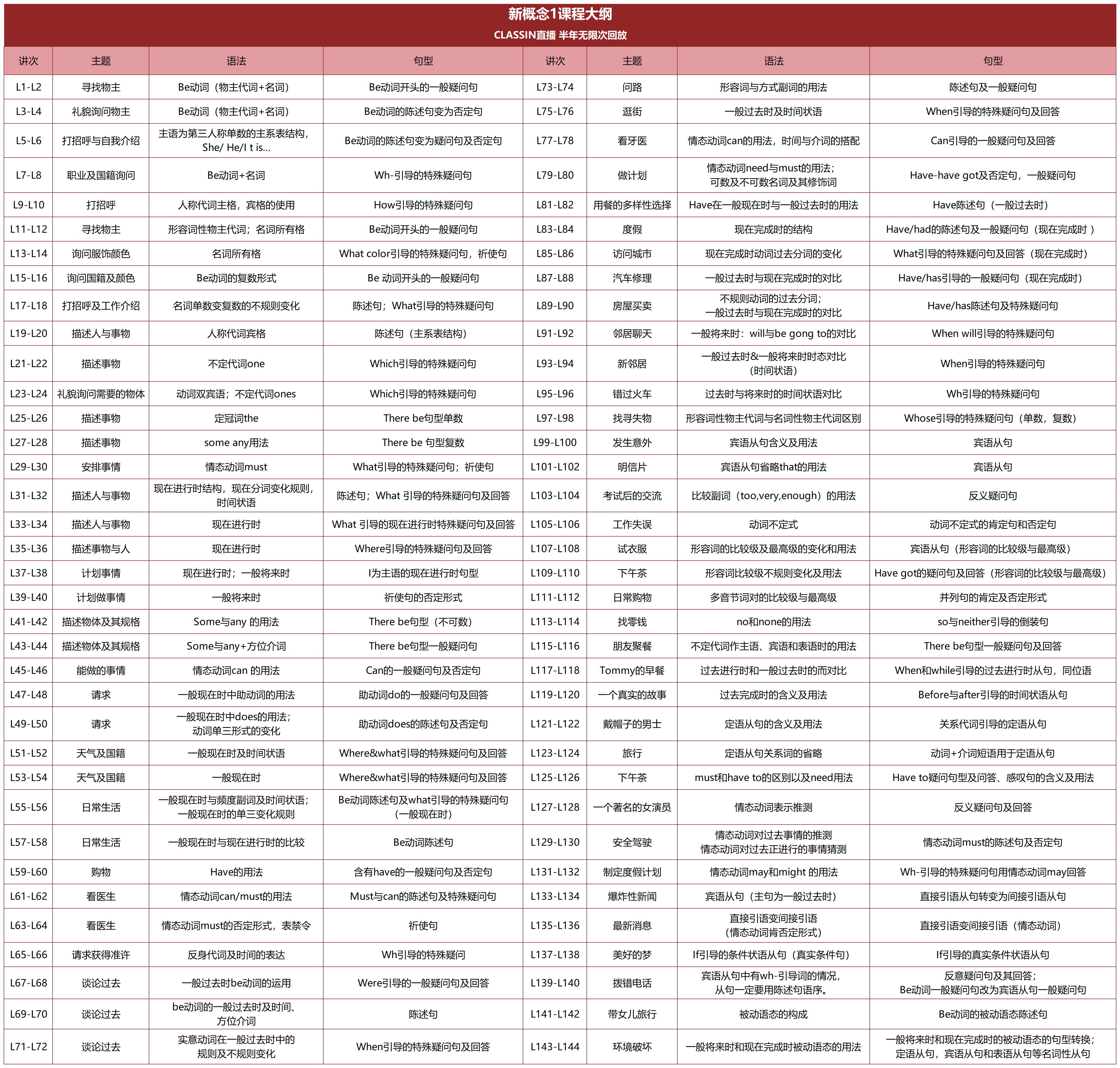 大纲的重难点设计与新概念教材的设计理念保持一致,语法点每12个新授课重复 一次,螺旋式上升。