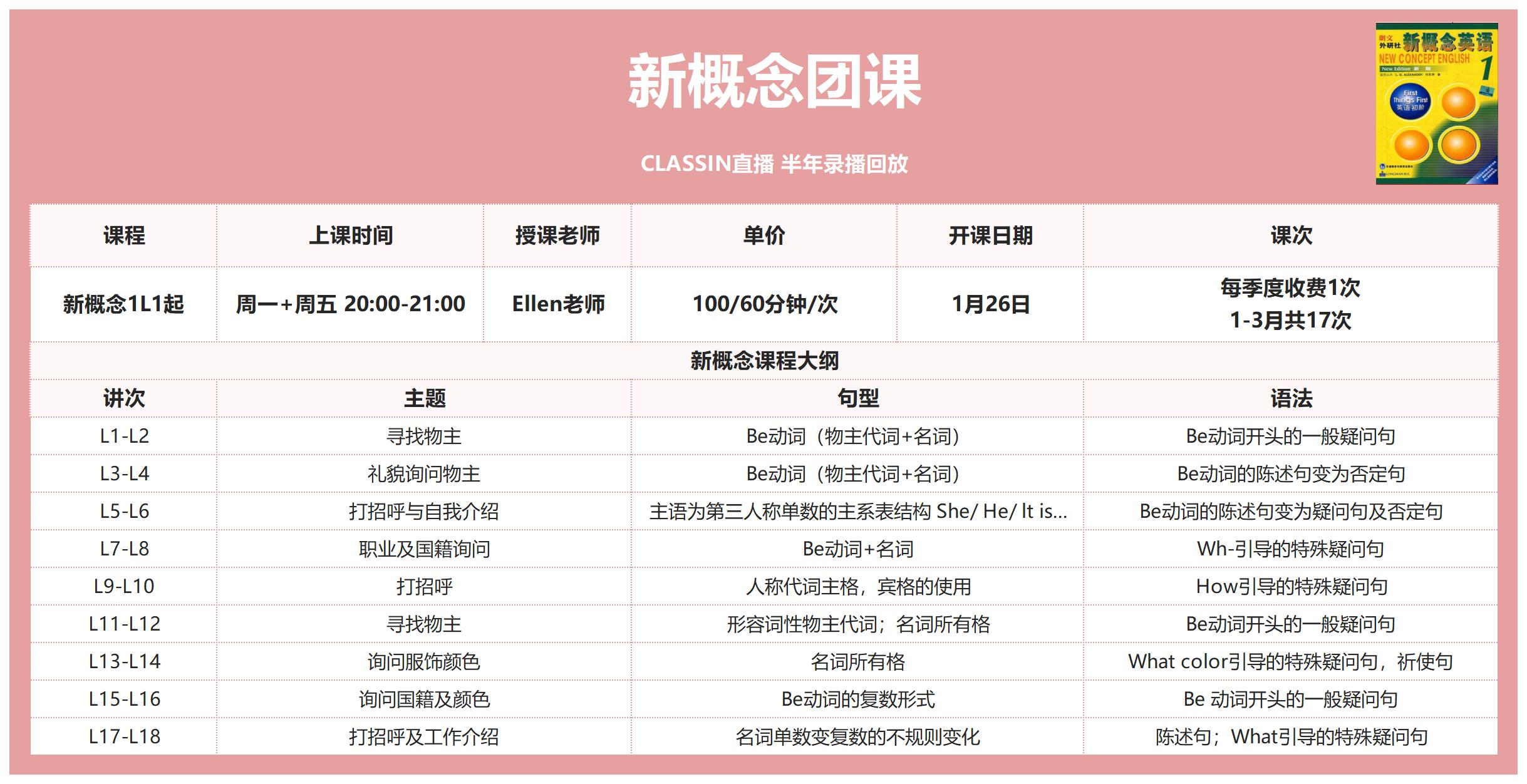 新概念一上:包括基础词法和四大基础时态,语法上对标小学课标难度。