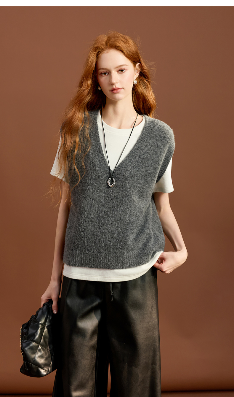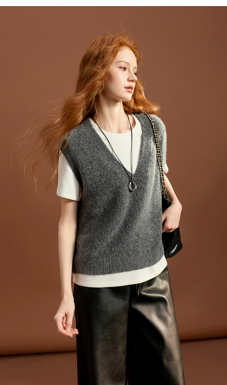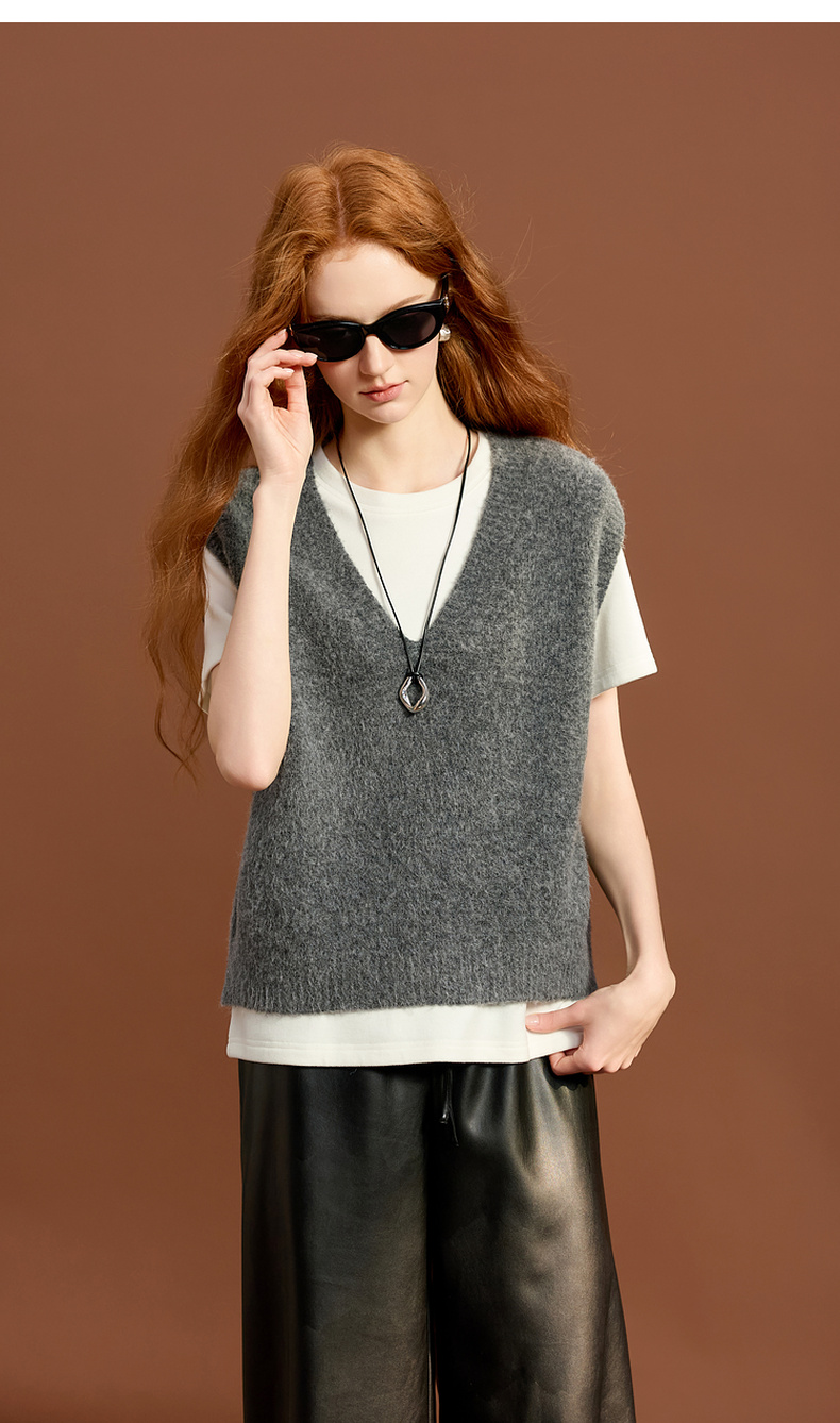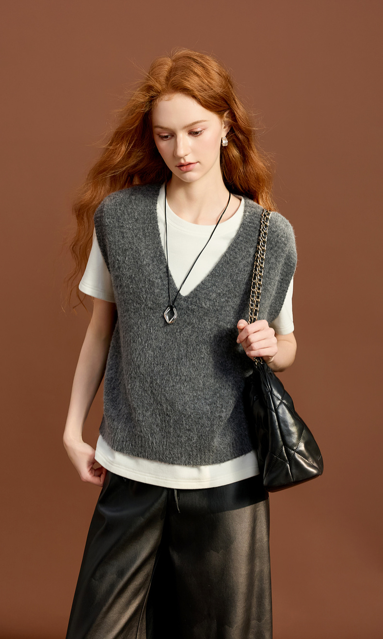 三彩2025冬季新款宽松V领针织衫无袖叠穿马甲背心套头衫上衣M