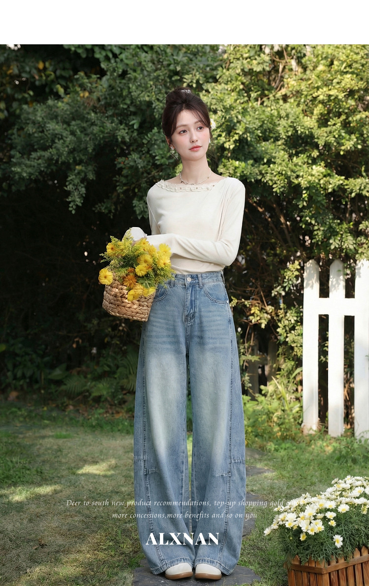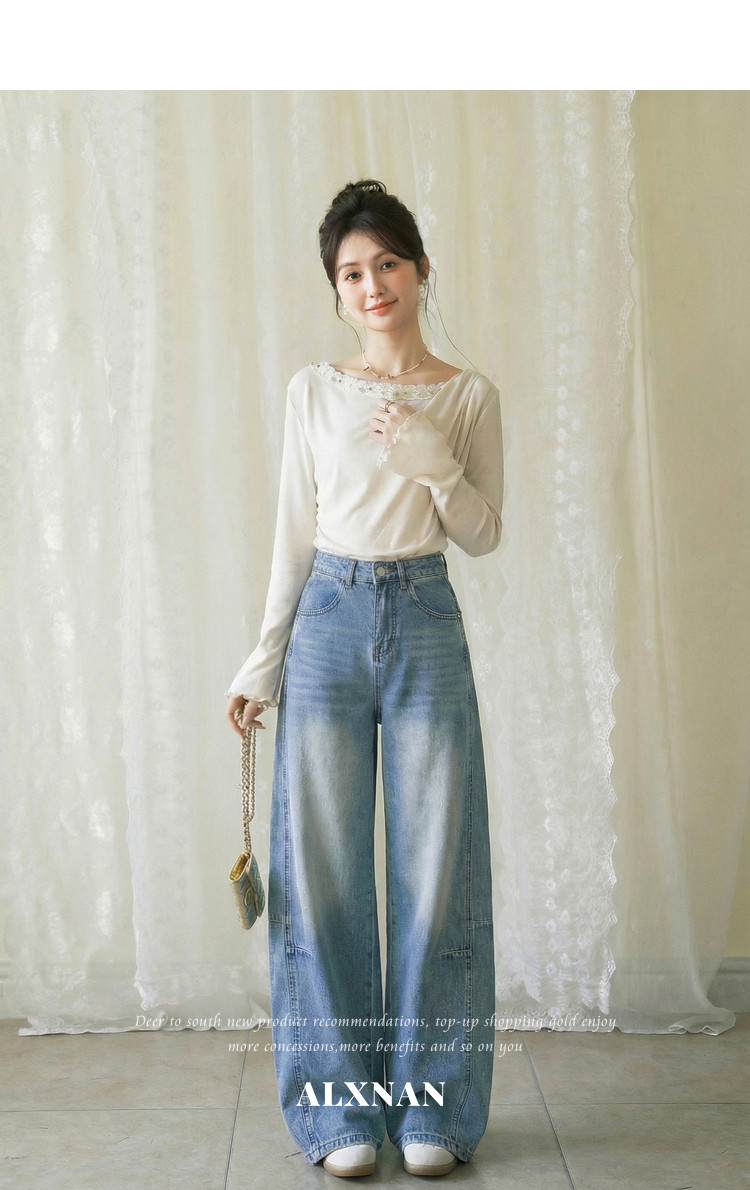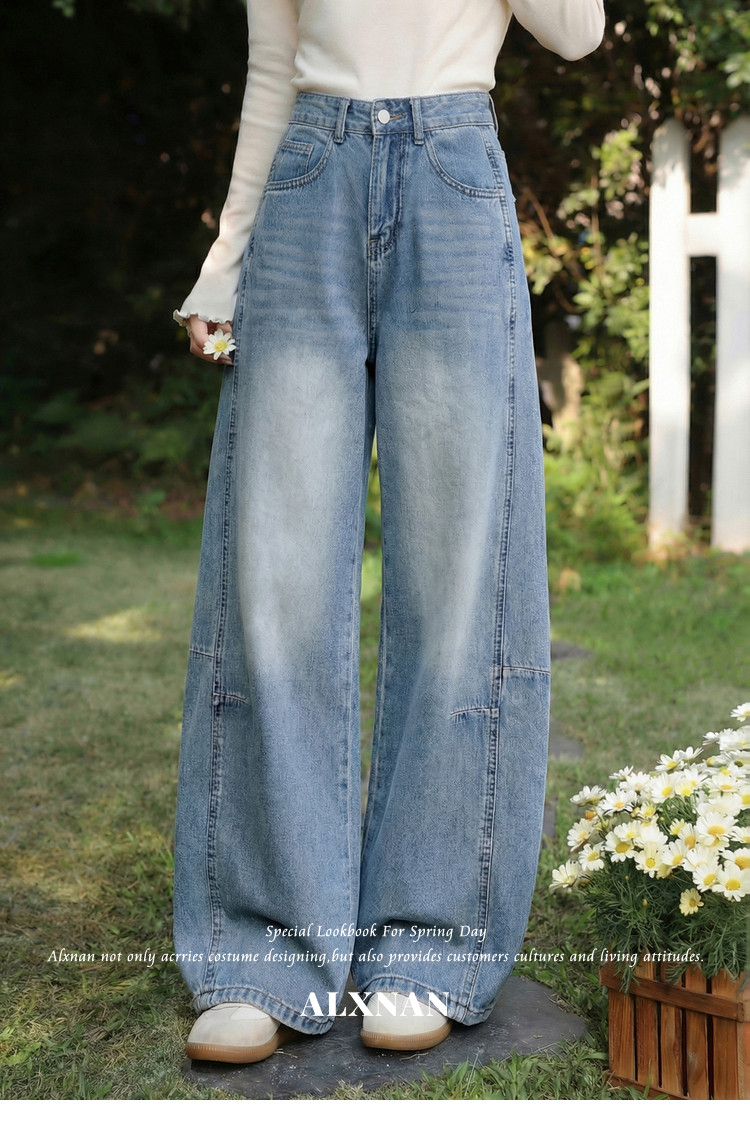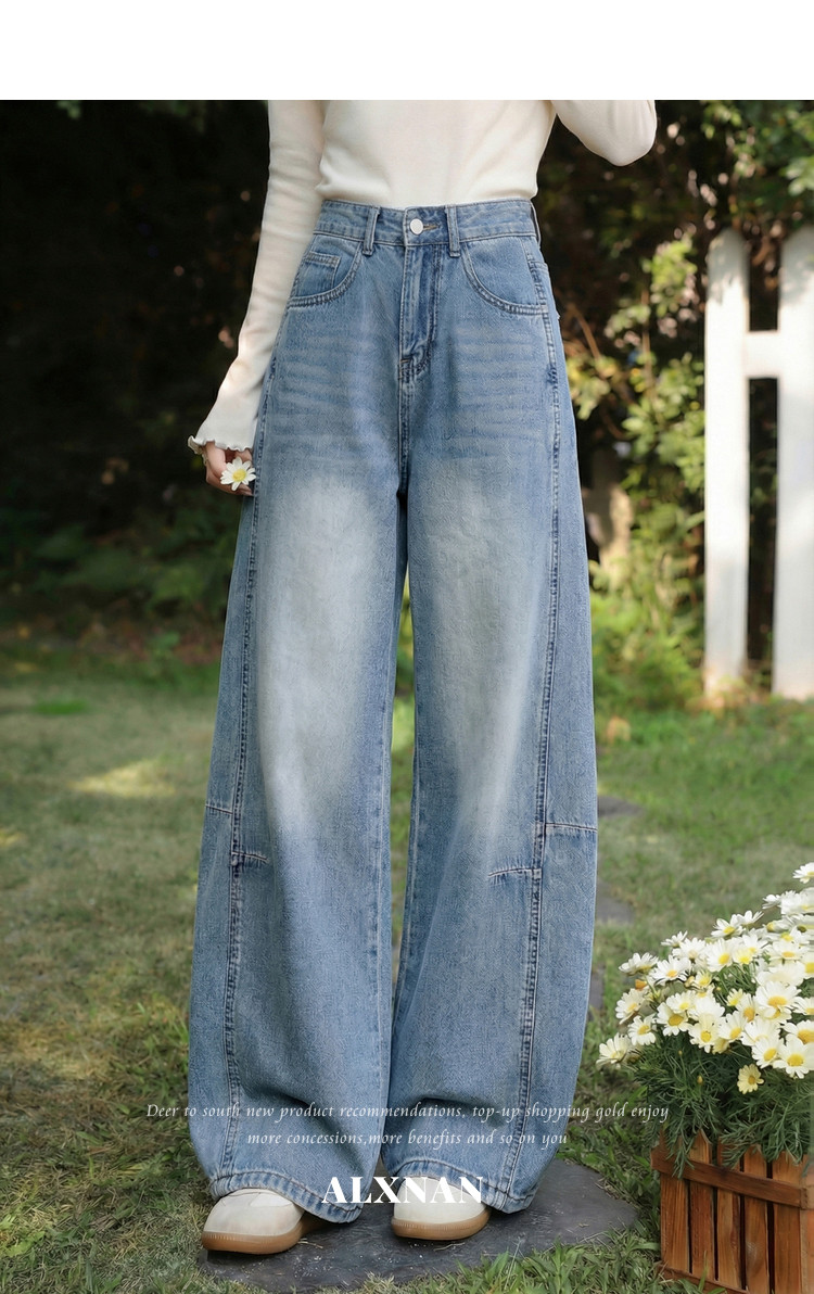 鹿向南「左岸之语」蓝色高腰显瘦阔腿牛仔裤女春新款拼接工装长裤