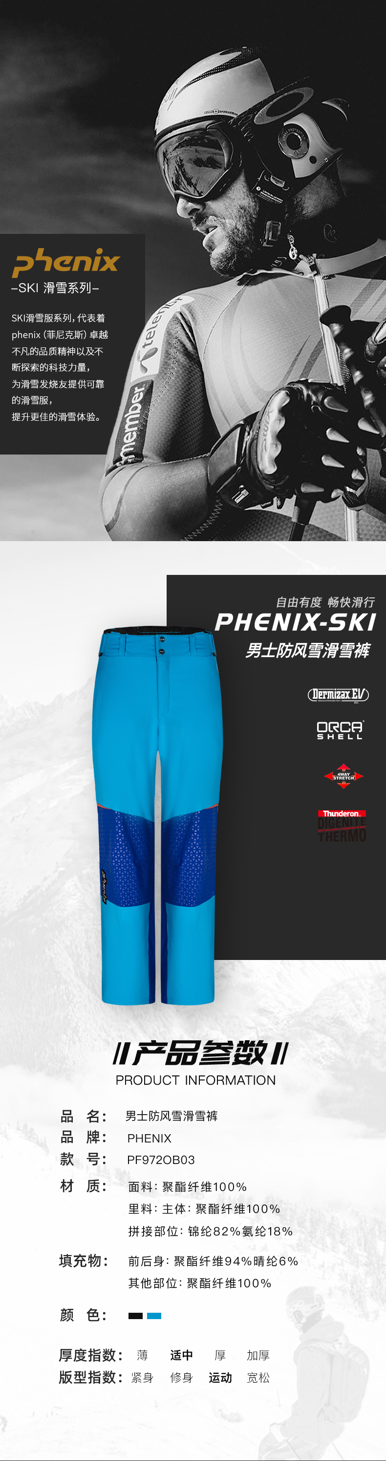 phenix菲尼克斯 SKI 竞技系列 滑雪裤男士防水双板保暖PF972OB03