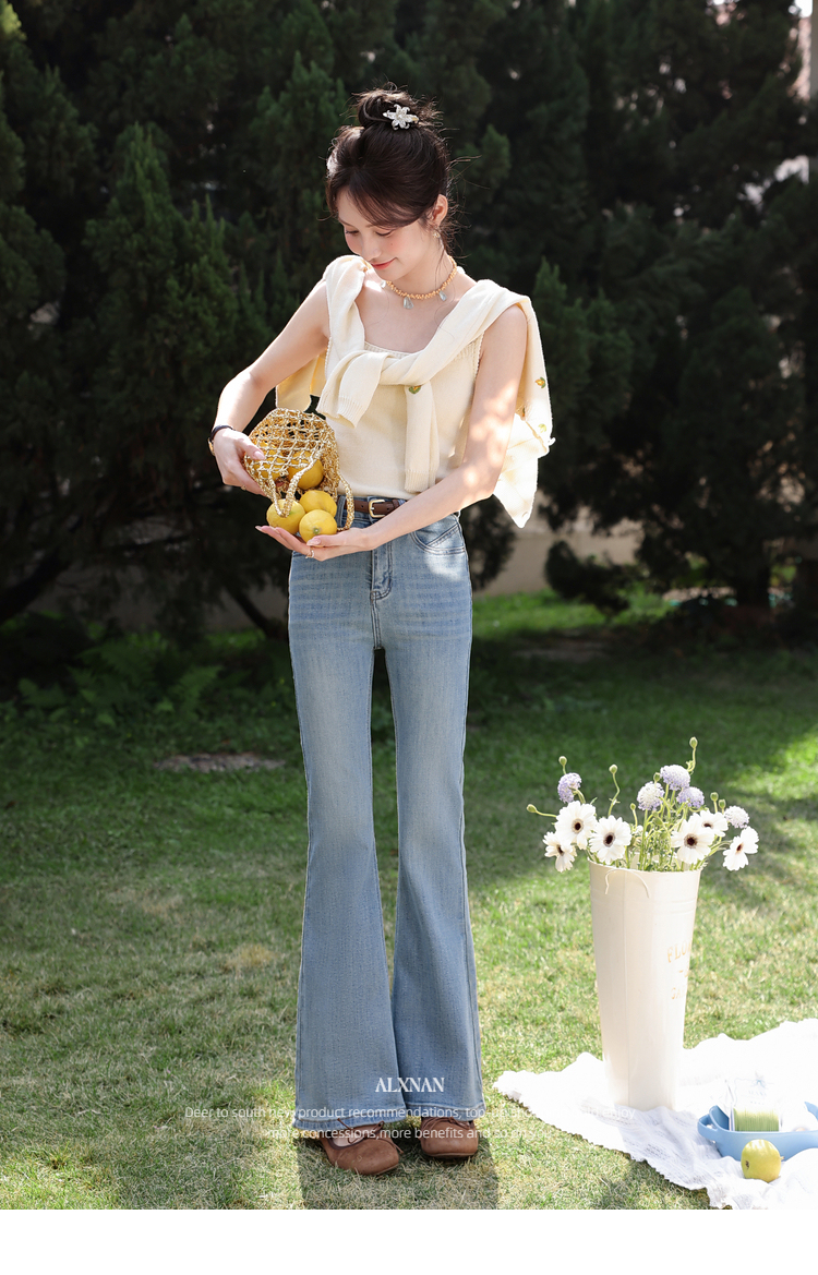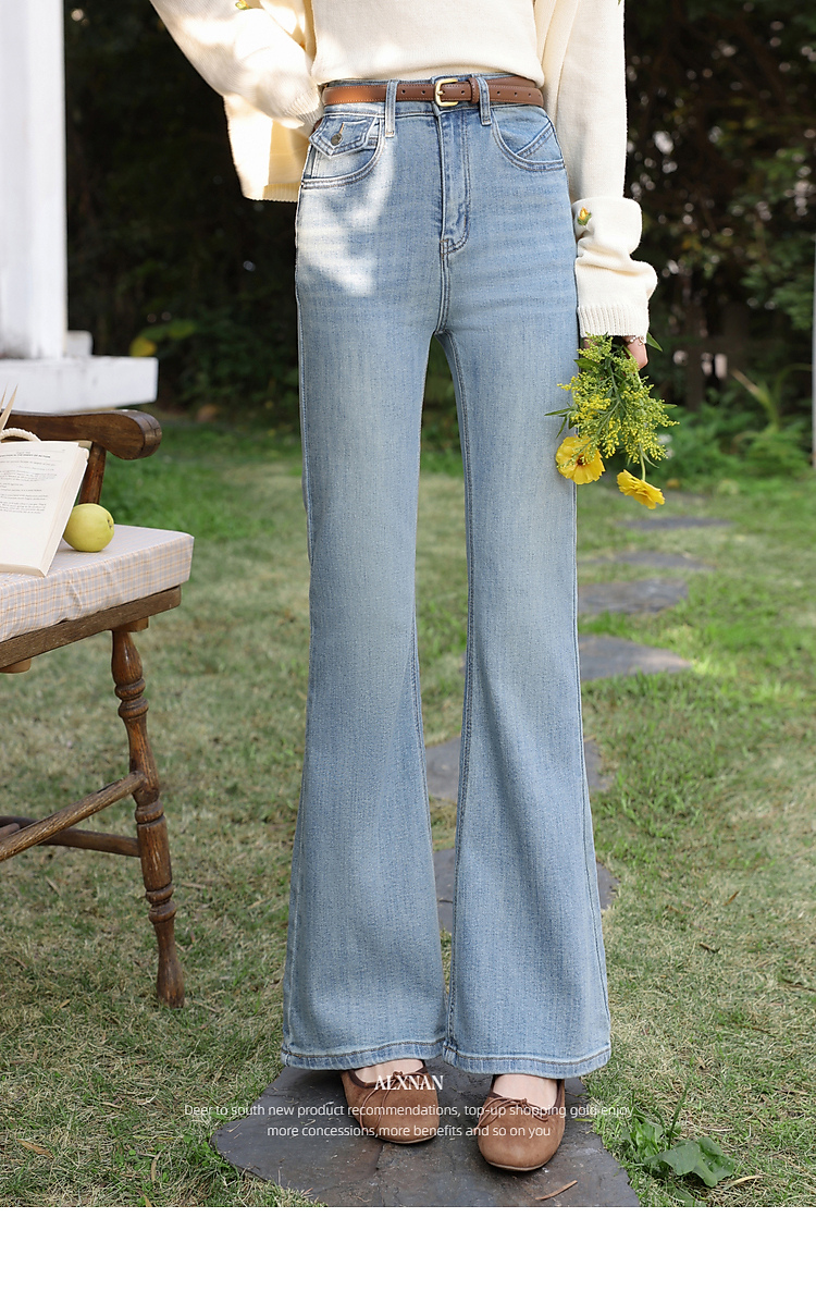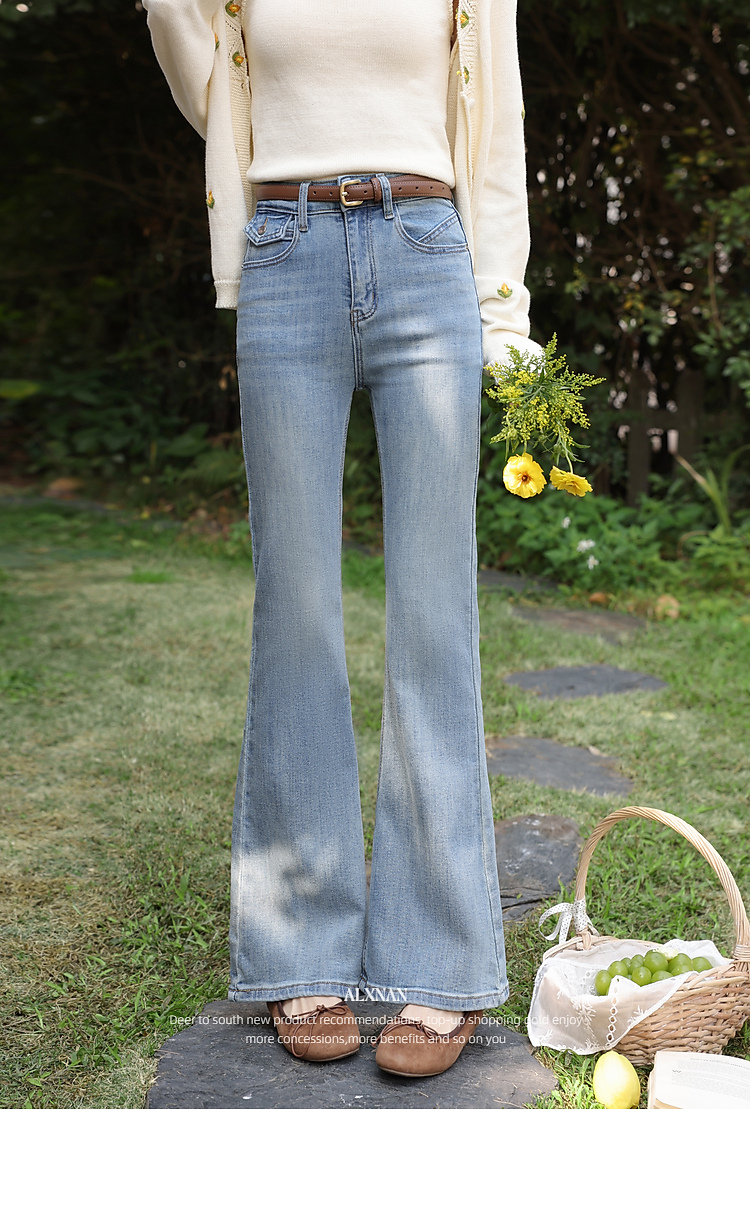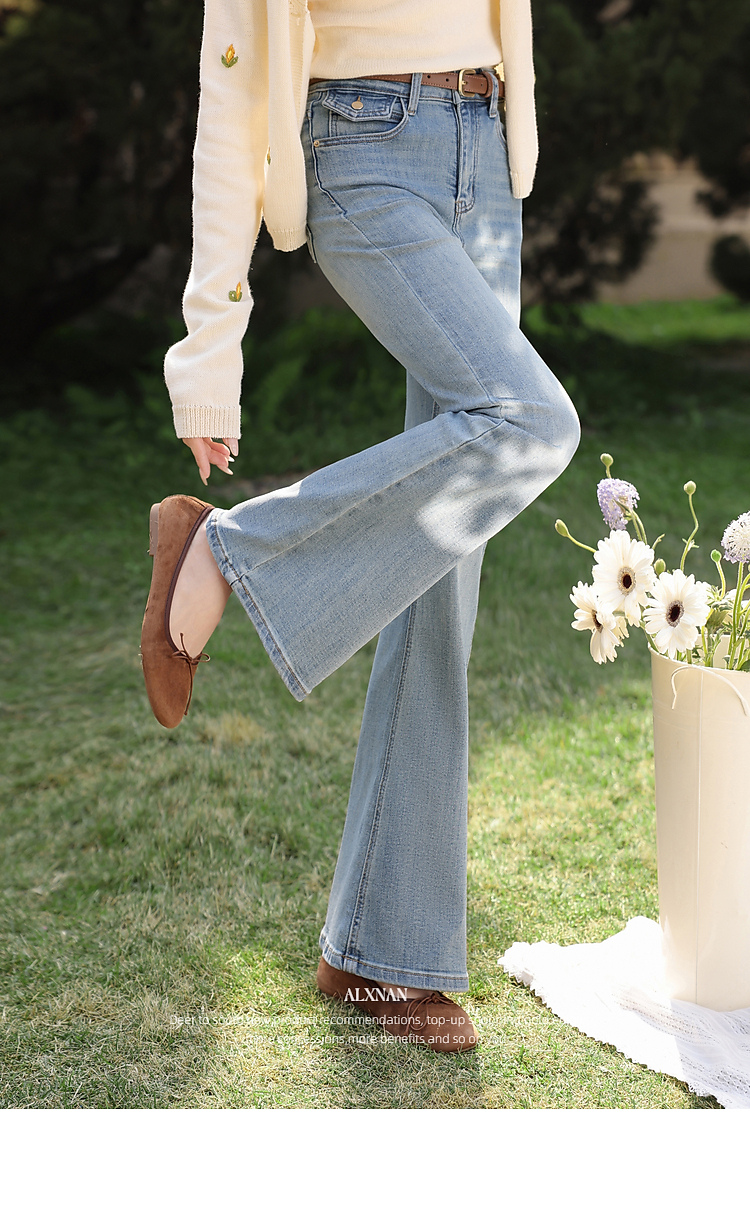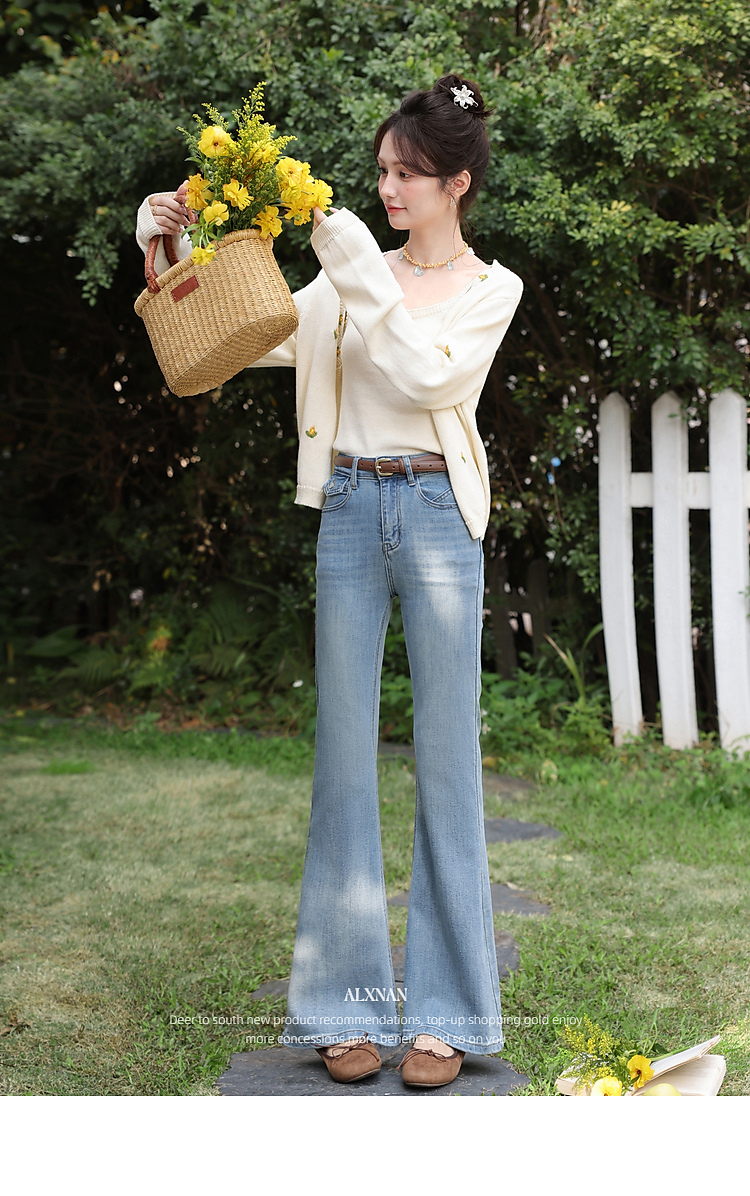 鹿向南「浅花诗意」蓝色微喇牛仔裤女春新款小个子高腰修身喇叭裤