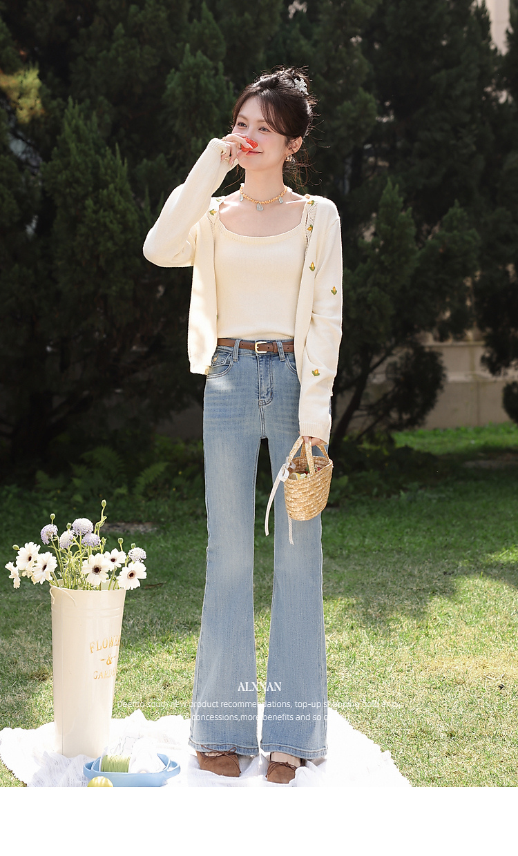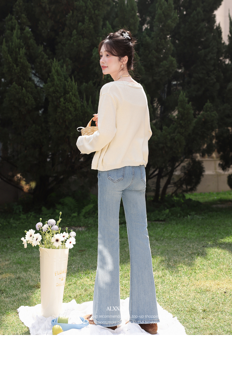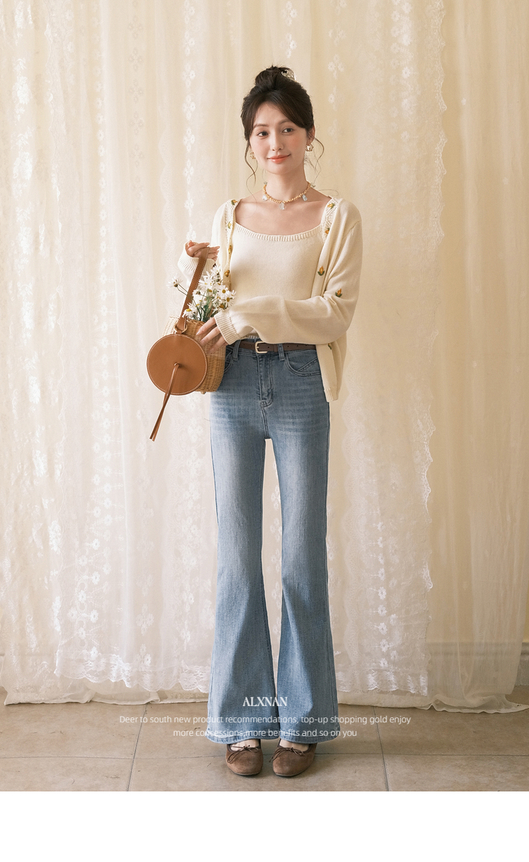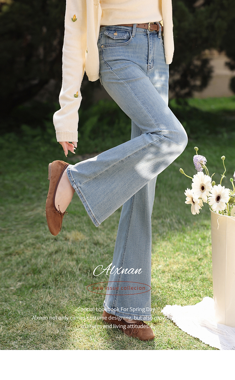 鹿向南「浅花诗意」蓝色微喇牛仔裤女春新款小个子高腰修身喇叭裤