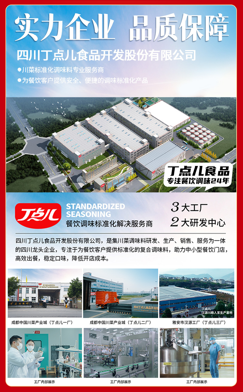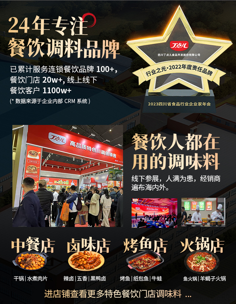 四川丁点儿食品开发股份有限公司,是集川菜调味料研发、生产、销售、服务为一体的现代化企业,专注为餐饮客户提供川菜调味解决方案。公司成立至今,服务了超百万家的餐饮门店以及连锁品牌。