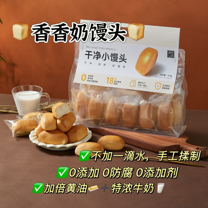 而且,每块奶香馒头当中含有8%的鲜鸡蛋 还有3%的新西兰奶粉和炼乳 蛋白质和钙营养直接给你拉满👍 ⭐吃一块小馒头≈喝下一杯纯牛奶! 口感更甜润、营养更丰富