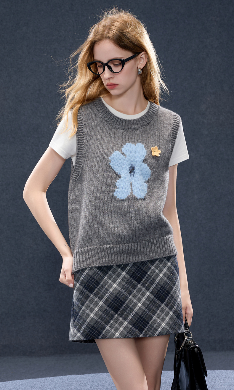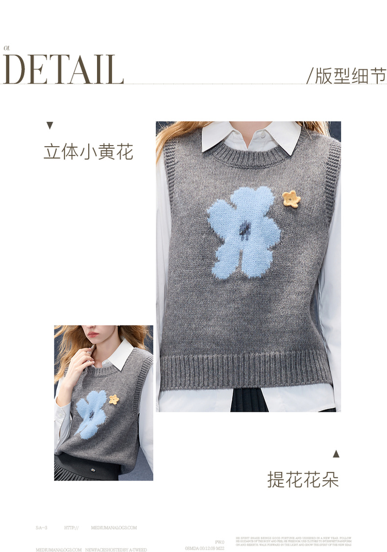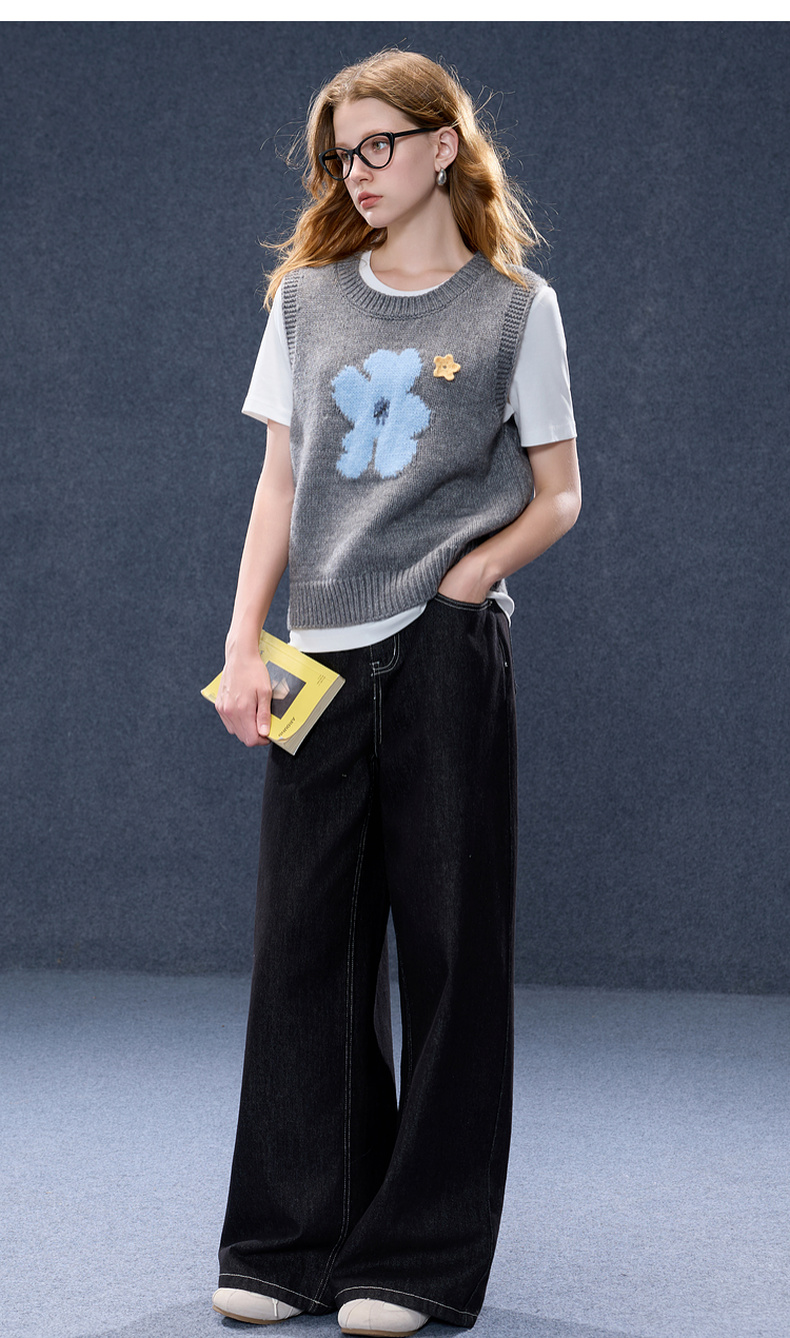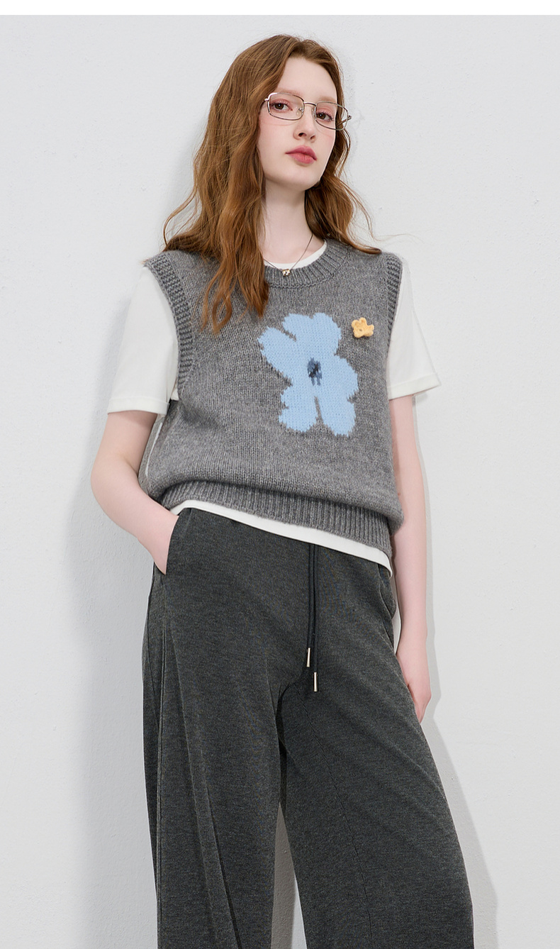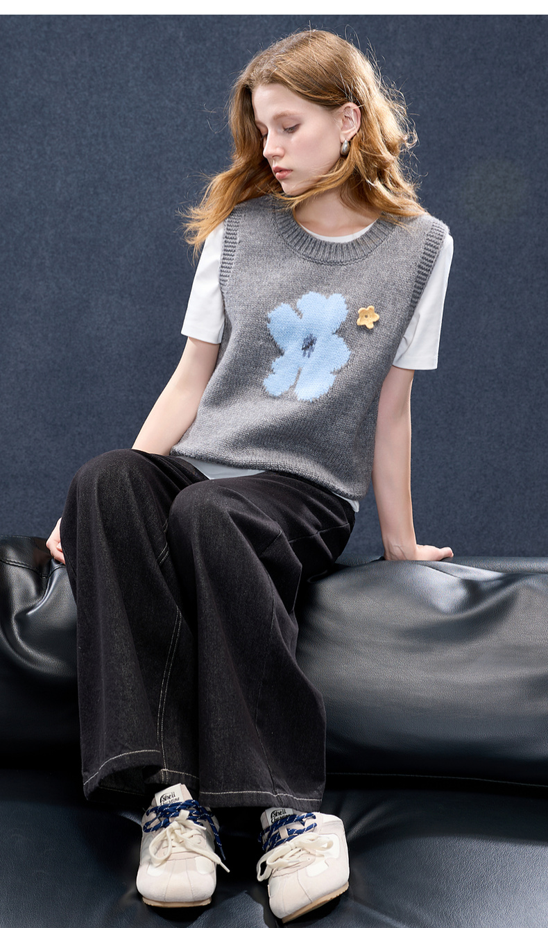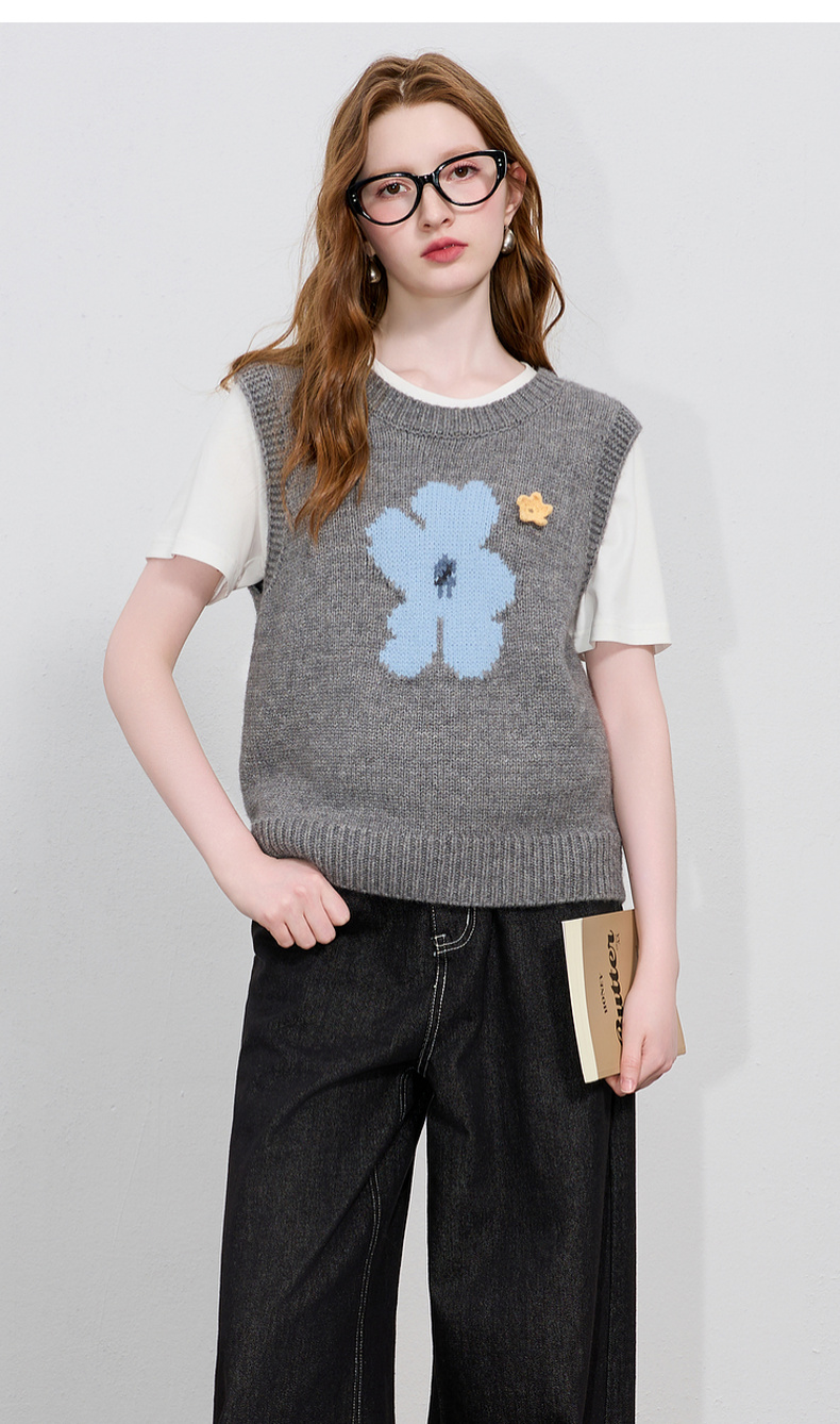 三彩2026春季新款针织马甲花朵圆领无袖毛衫宽松叠穿M